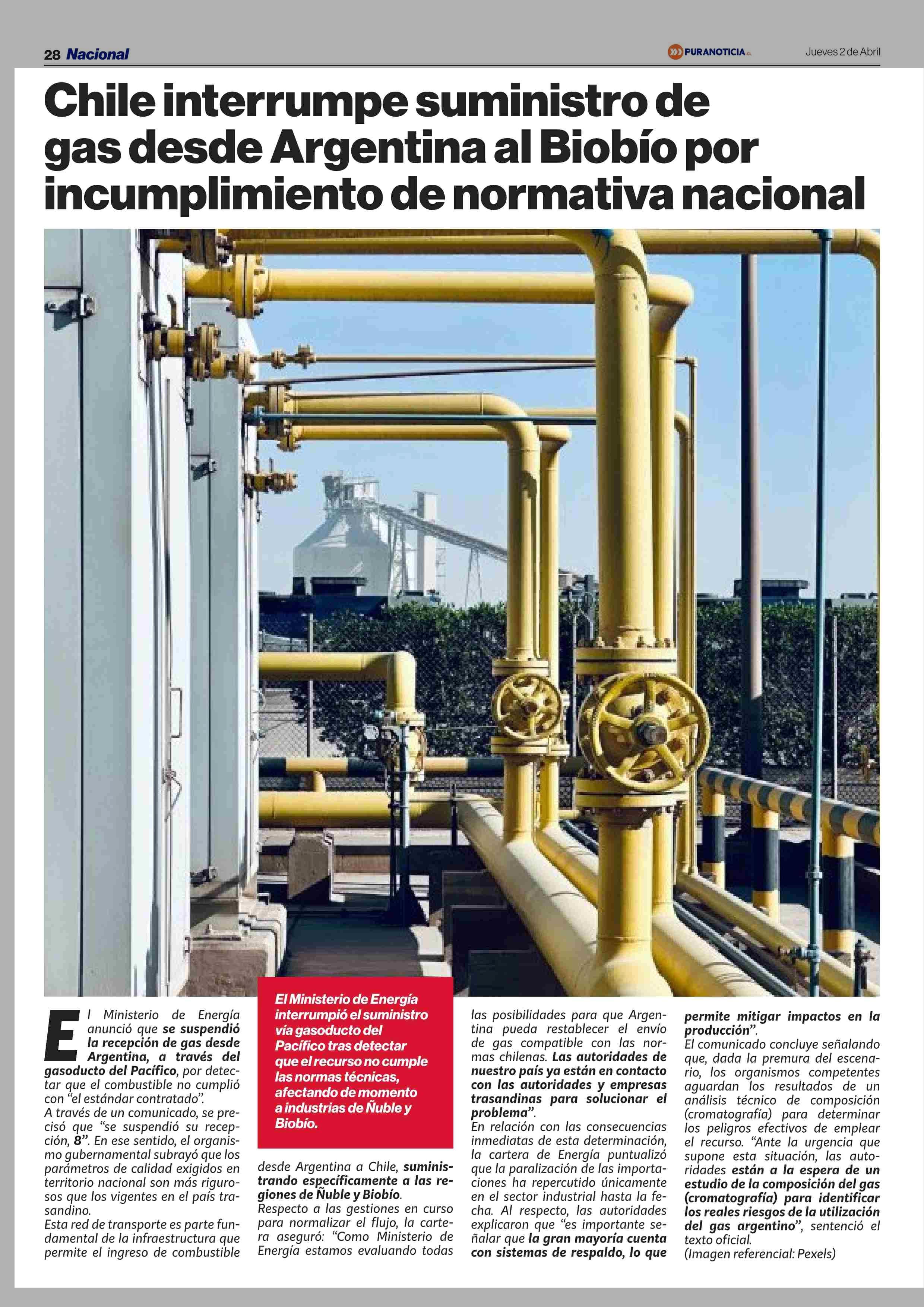 Título: Chile interrumpe suministro de gas desde Argentina al Biobío por incumplimiento de normativa nacional