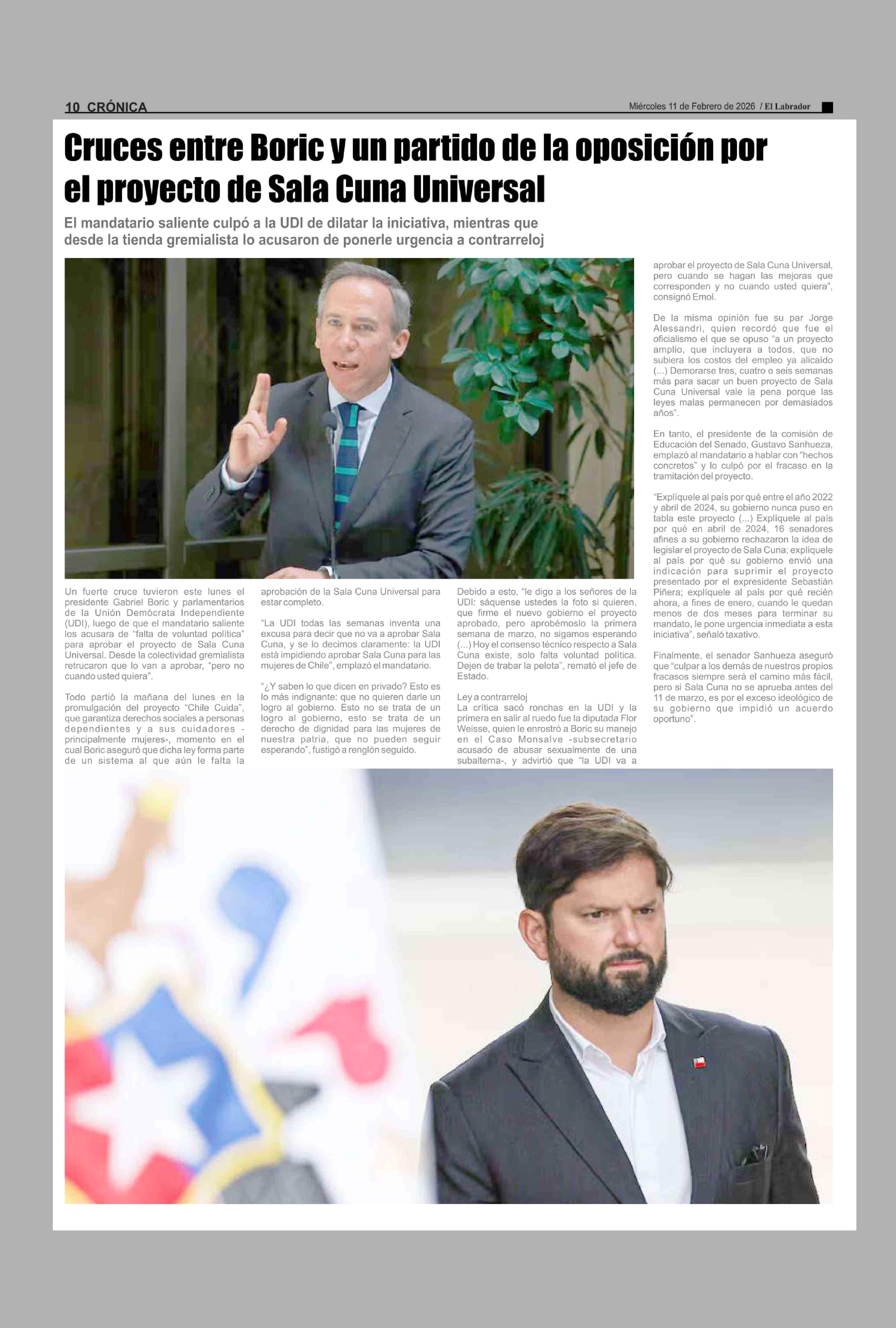 Cruces entre Boric y un partido de la oposición por el proyecto de Sala Cuna Universal 11-02-2026 El Labrador |