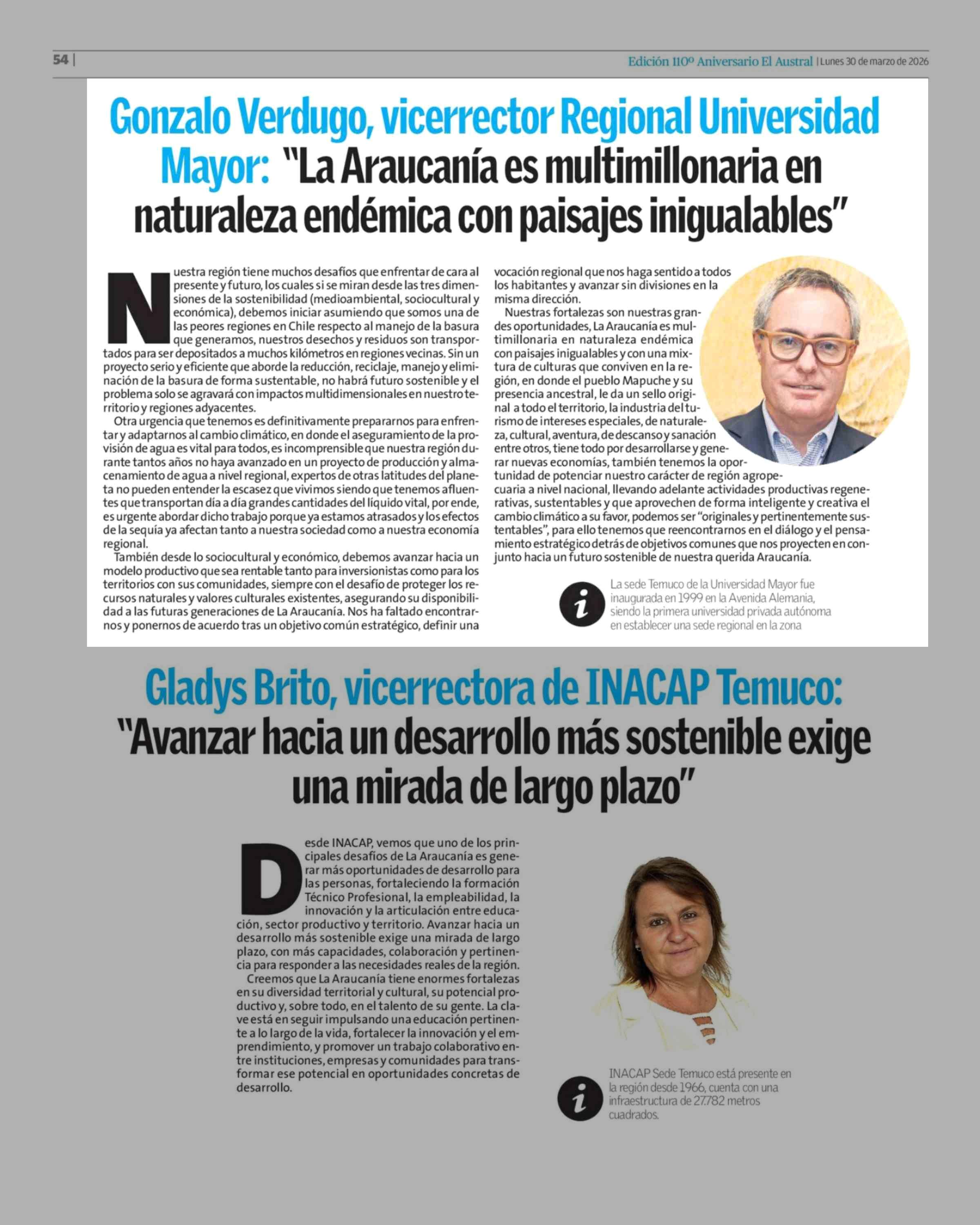 Columnas de Opinión: Gonzalo Verdugo, vicerrector Regional Universidad Mayor: "La Araucania es multimillonaria en naturaleza endémica con paisajes inigualables" 30-03-2026 El Austral de la Araucanía |