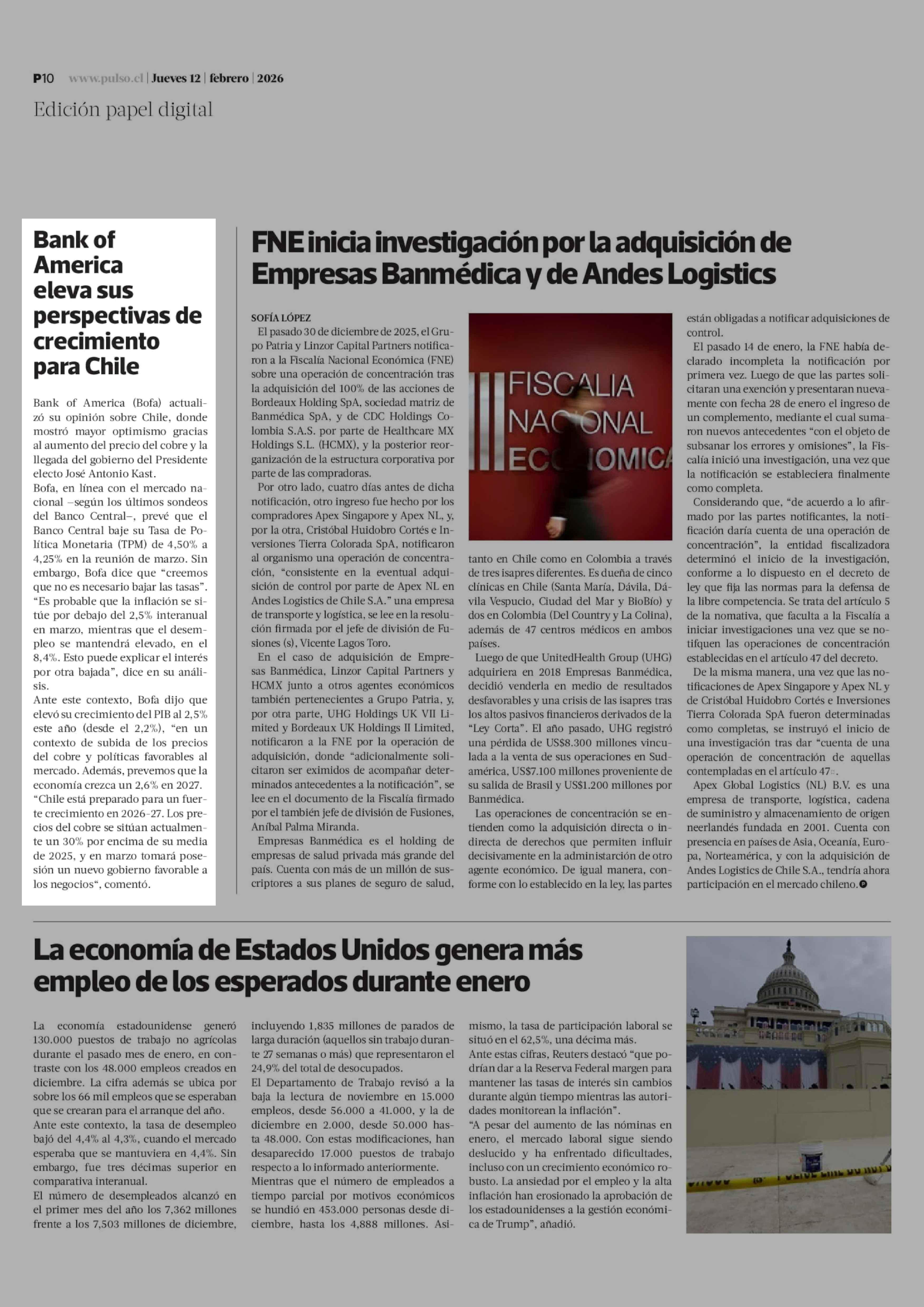 Bank of America eleva sus perspectivas de crecimiento para Chile 12-02-2026 La Tercera |