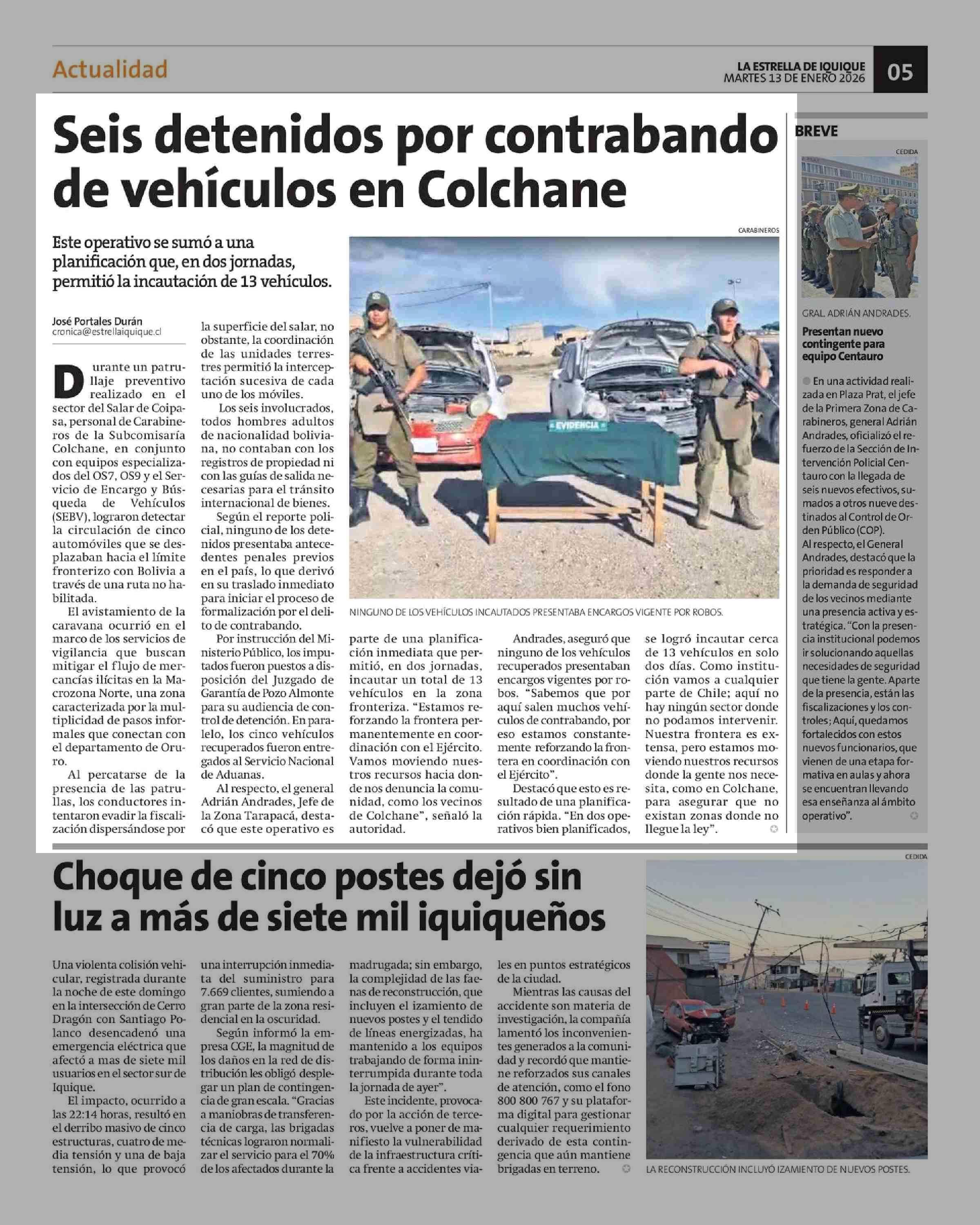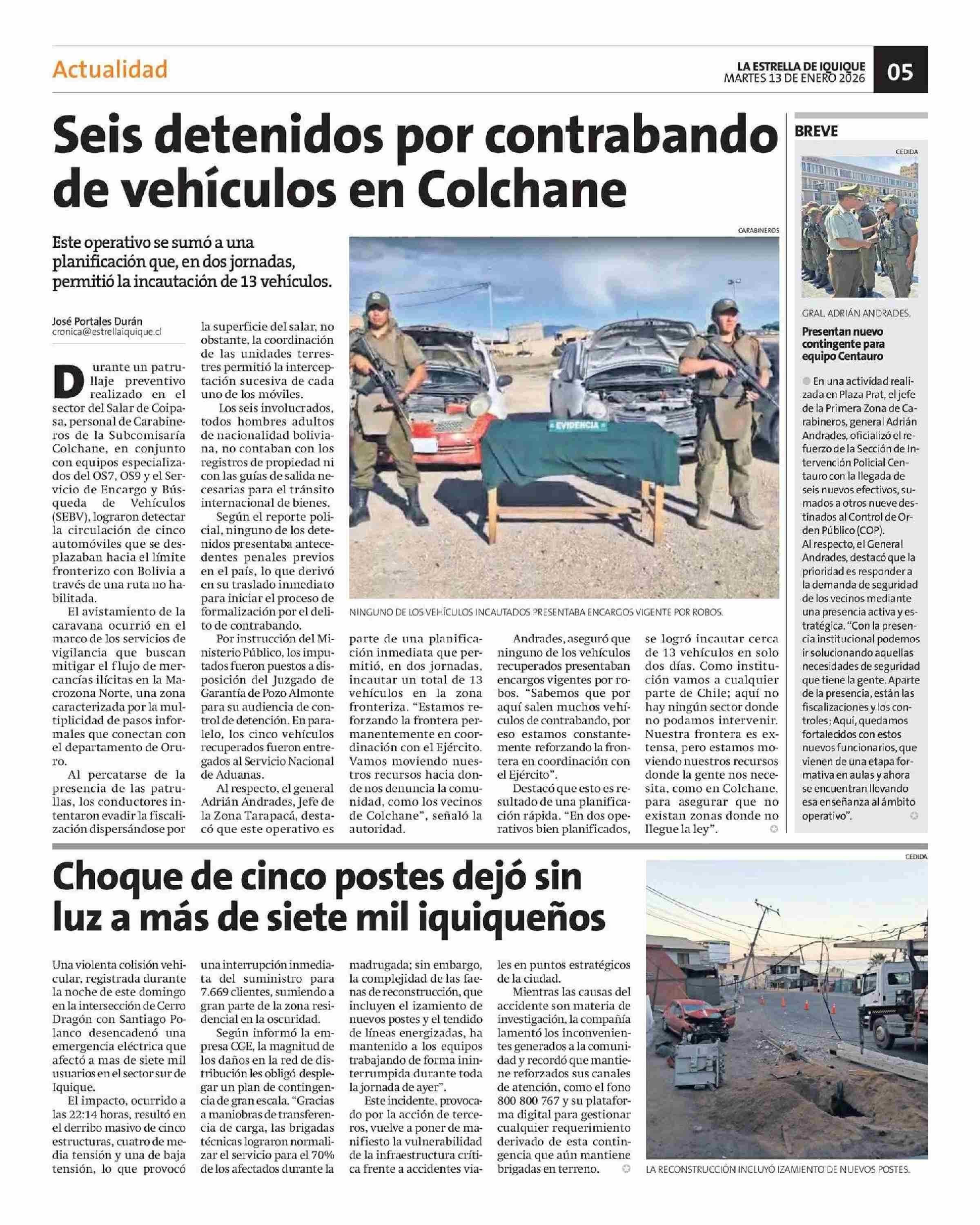 | Fecha: | 13-01-2026 | Sector: | Noticia general | Región: | Región de Tarapacá |