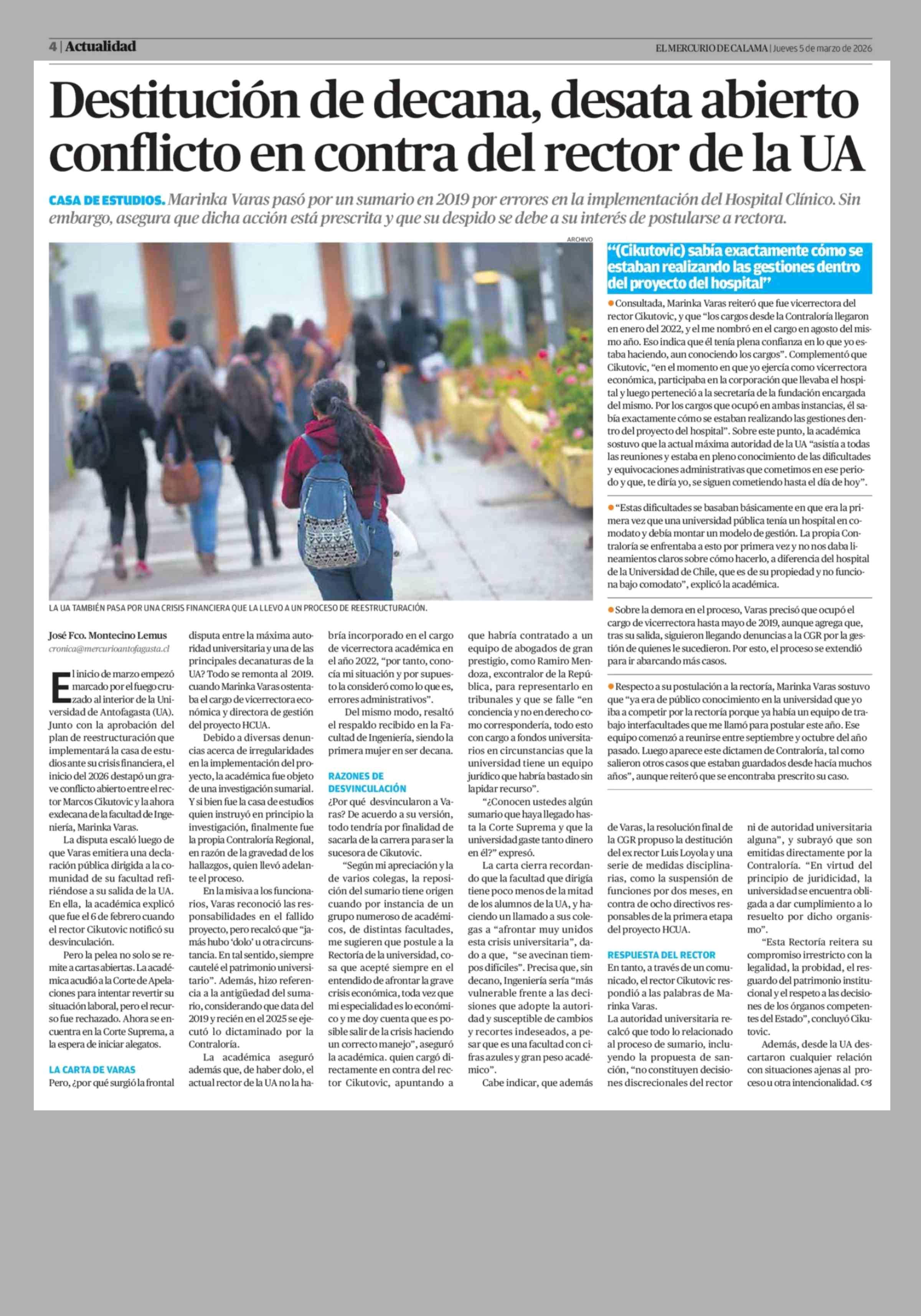 Destitución de decana, desata abierto conflicto en contra del rector de la UA 05-03-2026 El Mercurio de Calama |