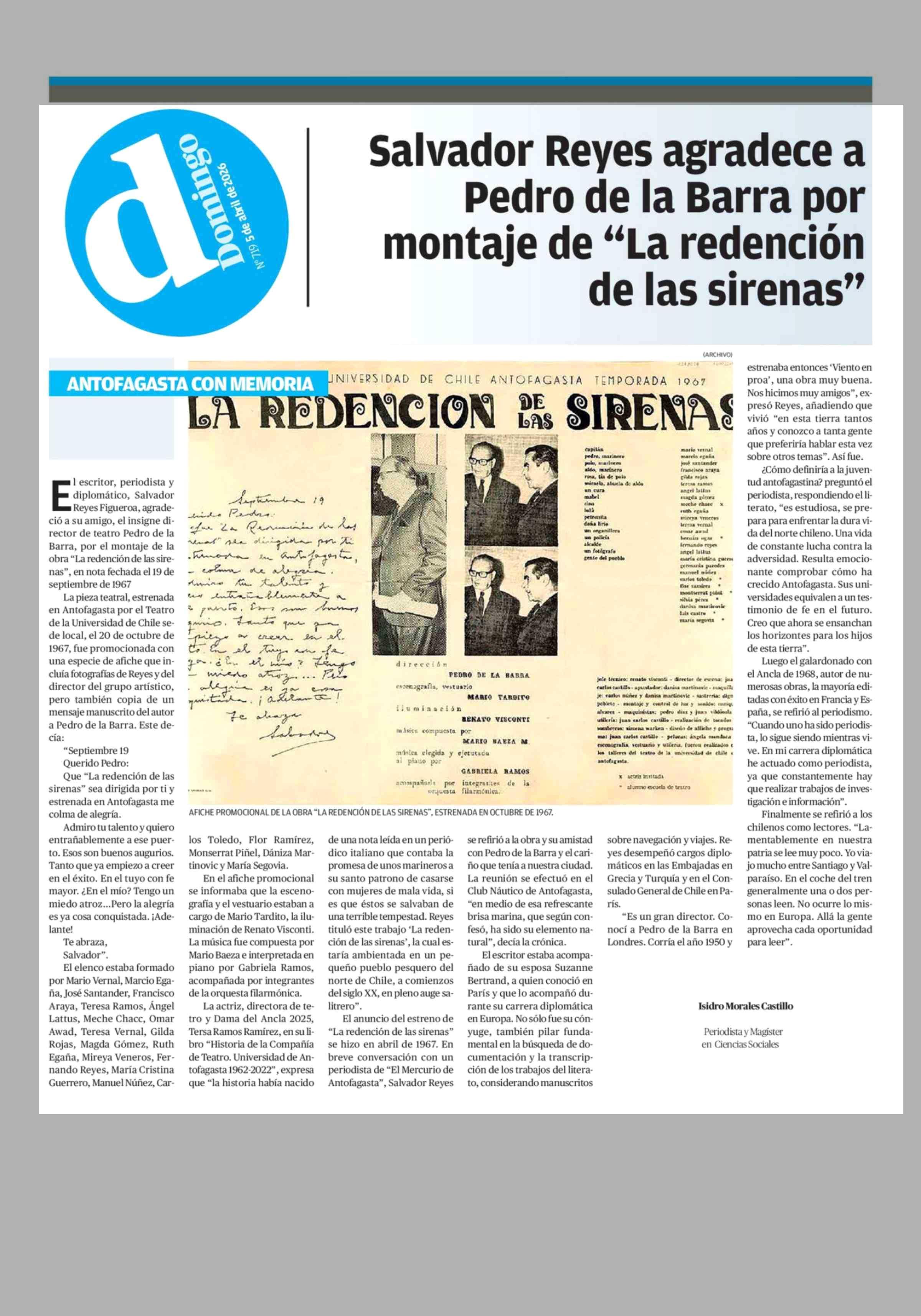 Título: Salvador Reyes agradece a Pedro de la Barra por montaje de “La redención de las sirenas”