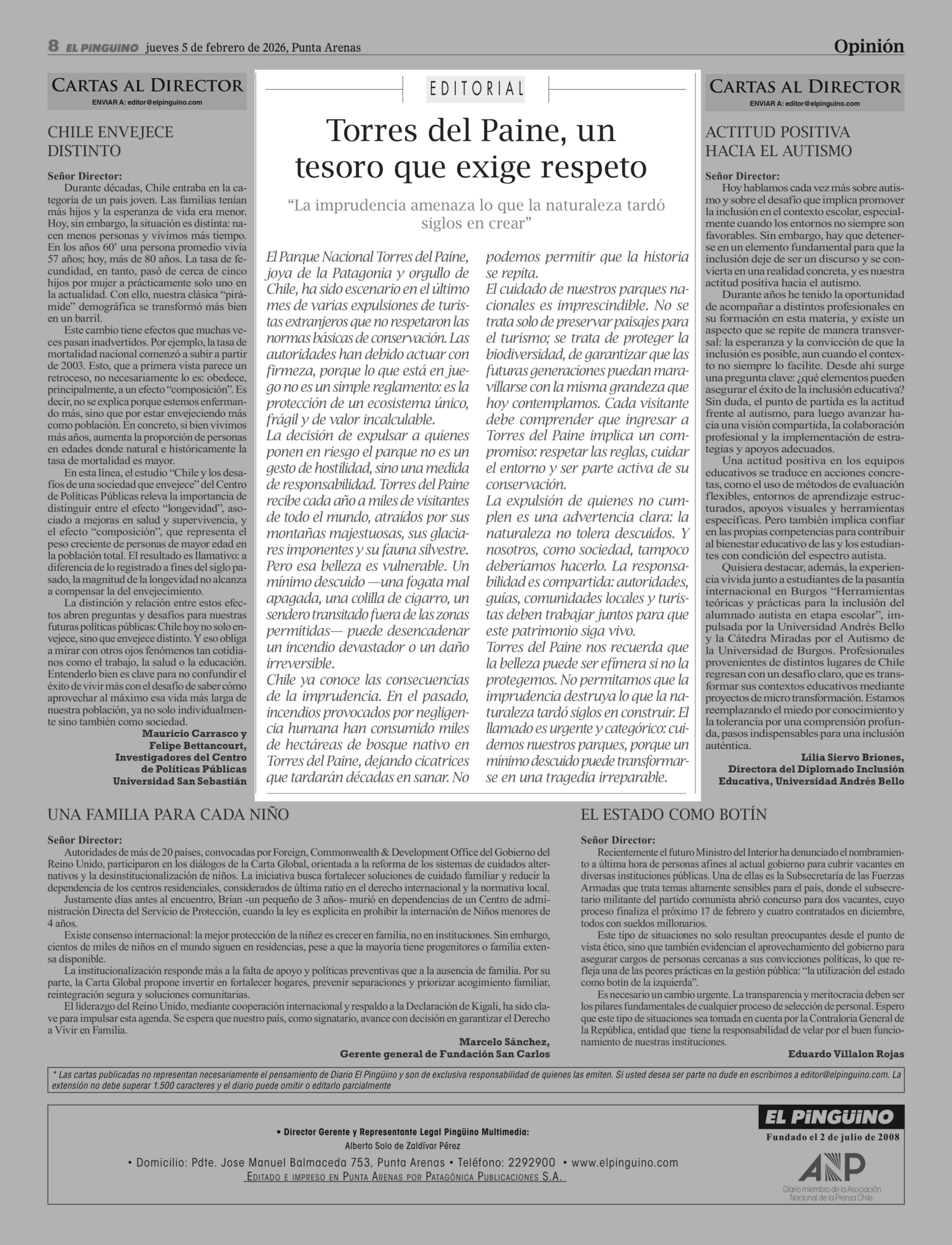 Cartas: Torres del Paine, un tesoro que exige respeto 05-02-2026 El Pingüino |