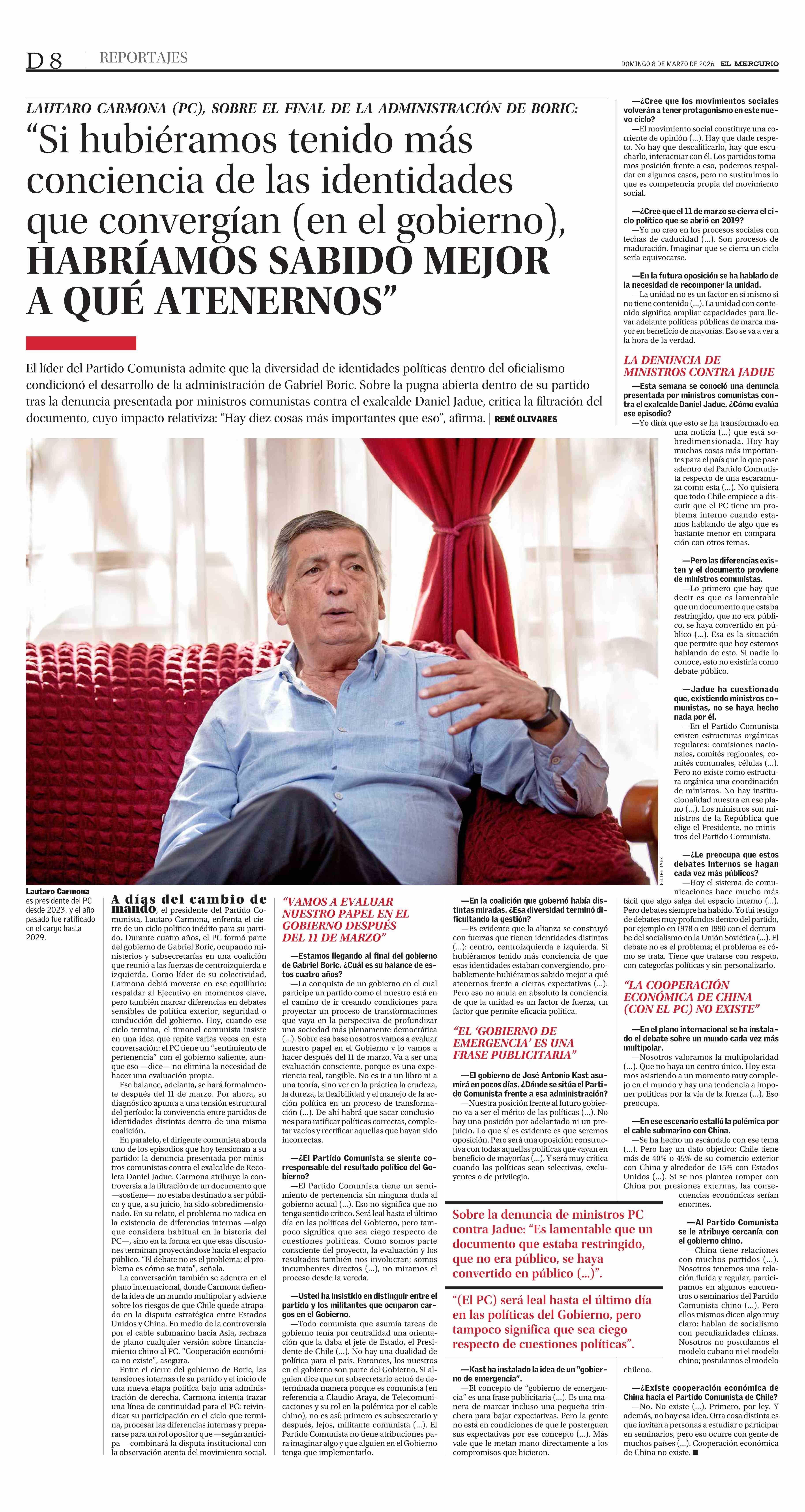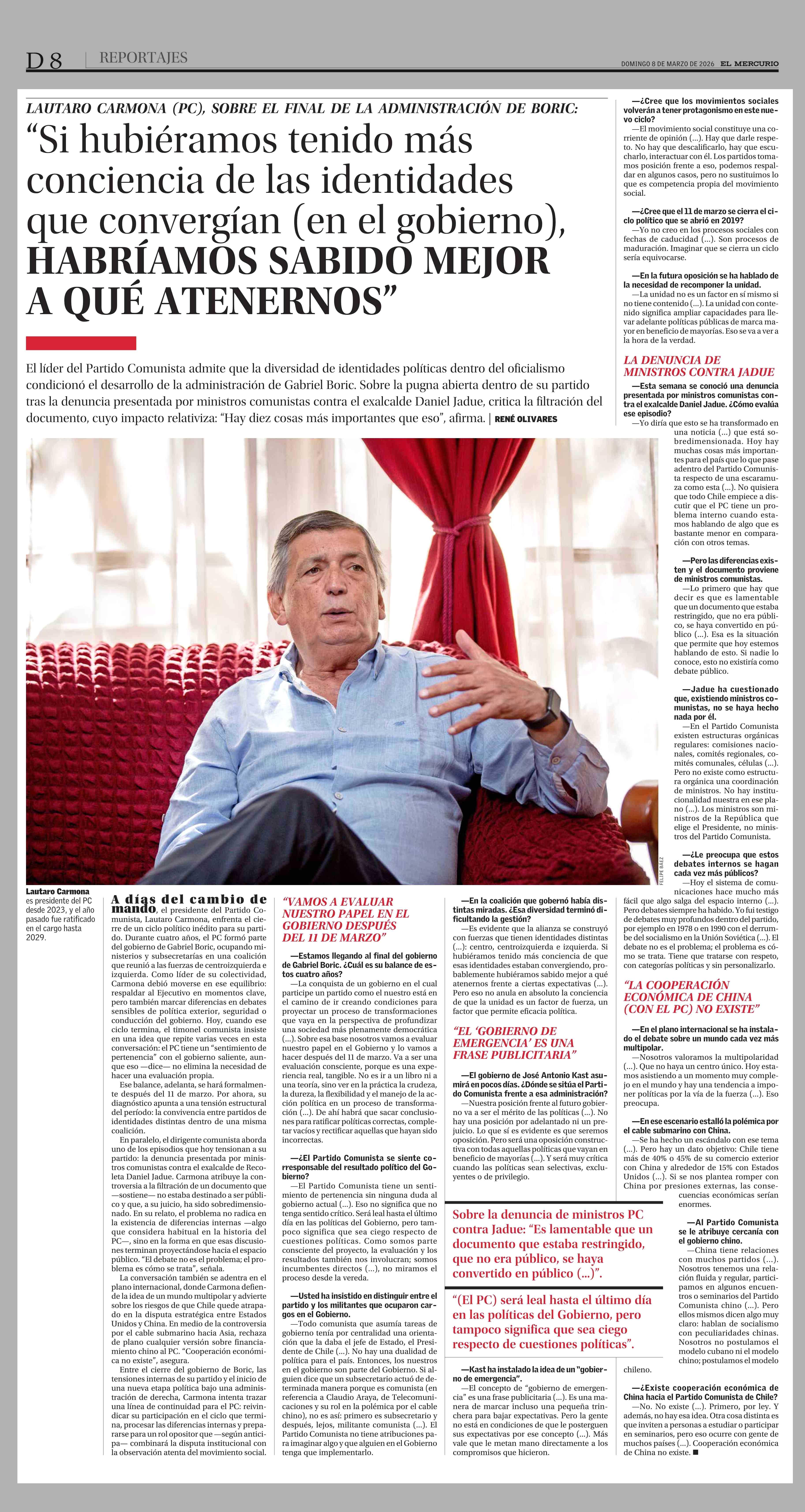 “Si hubiéramos tenido más conciencia de las identidades que convergían (en el gobierno), HABRÍAMOS SABIDO MEJOR A QUÉ ATENERNOS” 08-03-2026 El Mercurio |