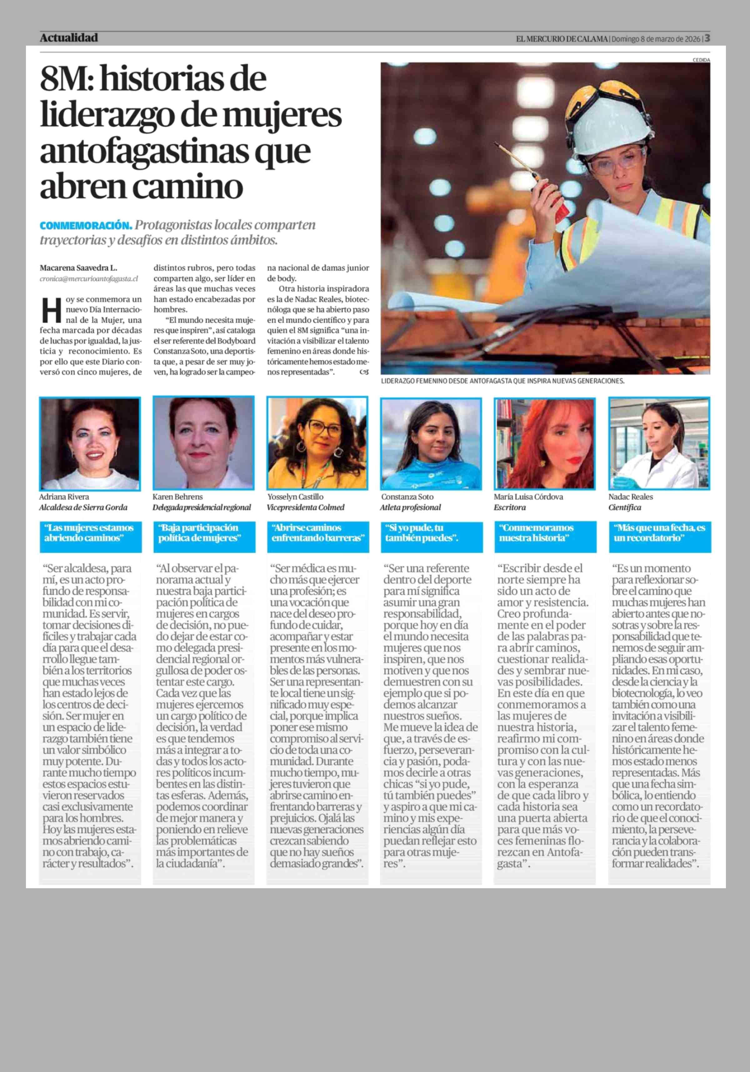 8M: historias de liderazgo de mujeres antofagastinas que abren camino 08-03-2026 El Mercurio de Calama |