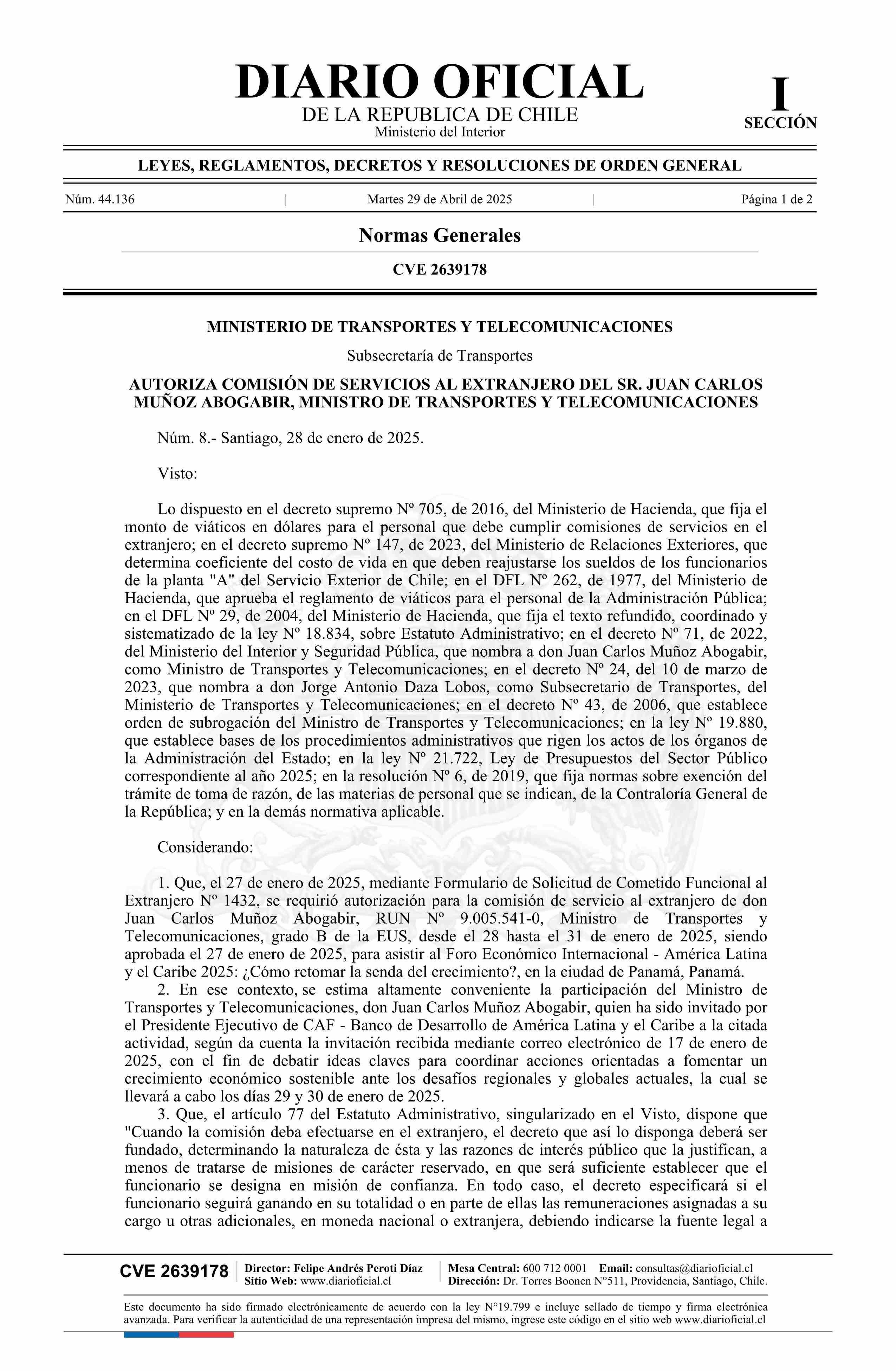 Título: Decreto número 8, de 2025.- Autoriza comisión de servicio de don Juan Carlos Muñoz Abogabir, Ministro de Transportes y Telecomunicaciones, a la ciudad de Panamá, Panamá