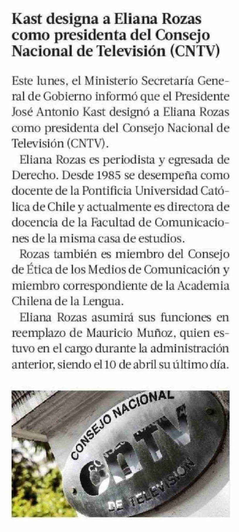 | Título: | Kast designa a Eliana Rozas como presidenta del Consejo Nacional de Televisión (CNTV) |