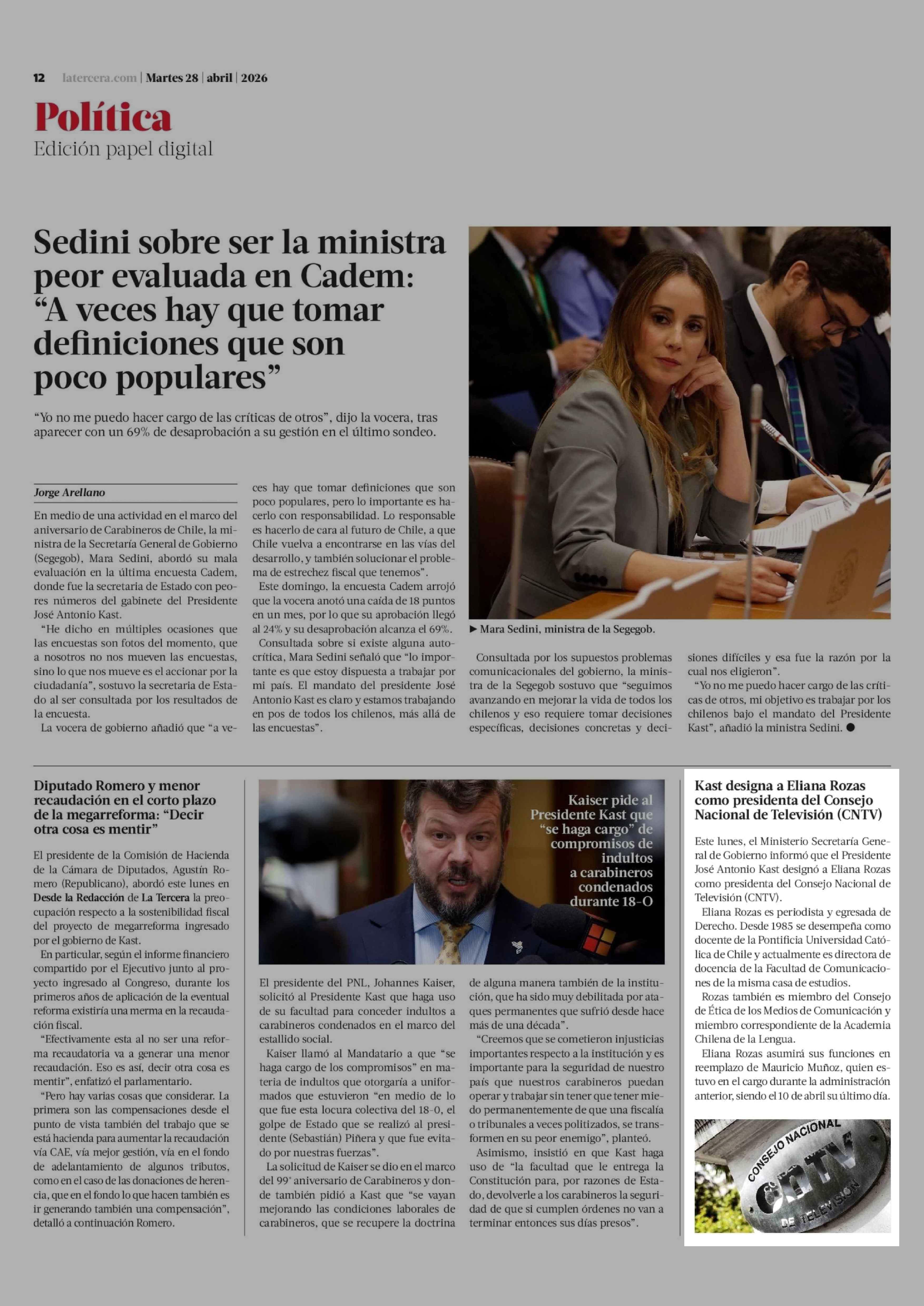 Kast designa a Eliana Rozas como presidenta del Consejo Nacional de Televisión (CNTV) 28-04-2026 La Tercera |