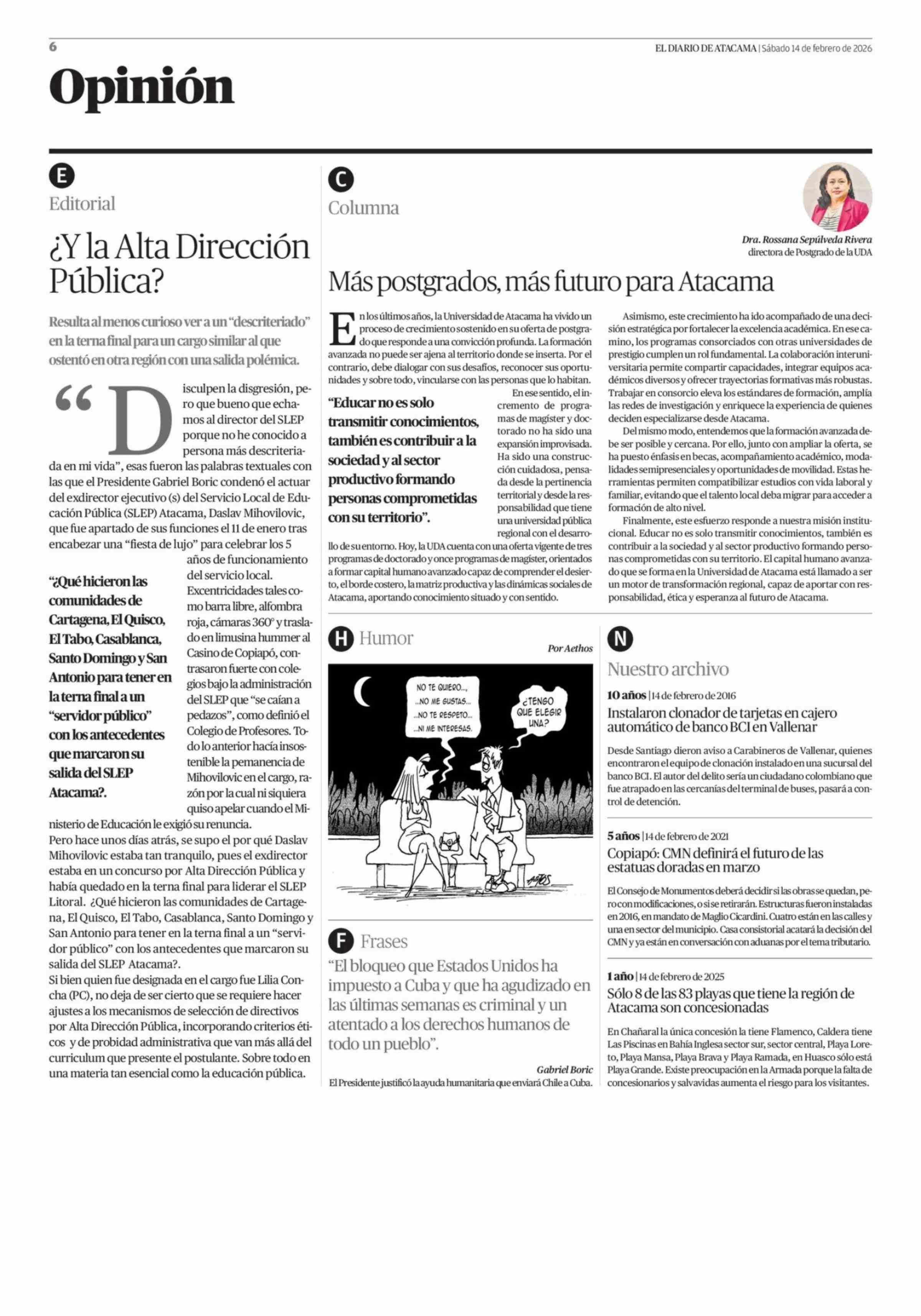 Columnas de Opinión: Más postgrados, más futuro para Atacama 14-02-2026 El Diario de Atacama |