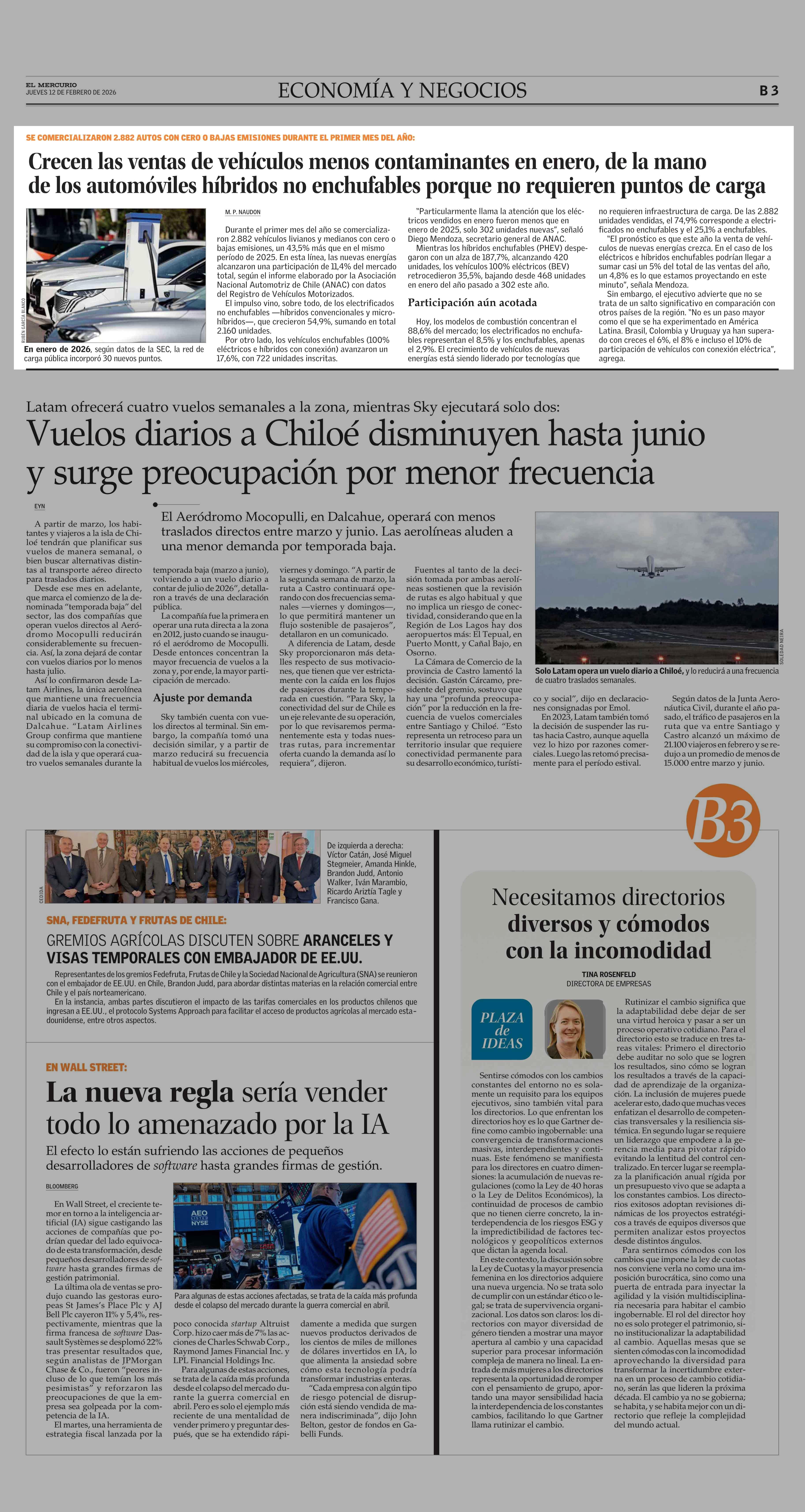 Crecen las ventas de vehículos menos contaminantes en enero, de la mano de los automóviles híbridos no enchufables porque no requieren puntos de carga 12-02-2026 El Mercurio |