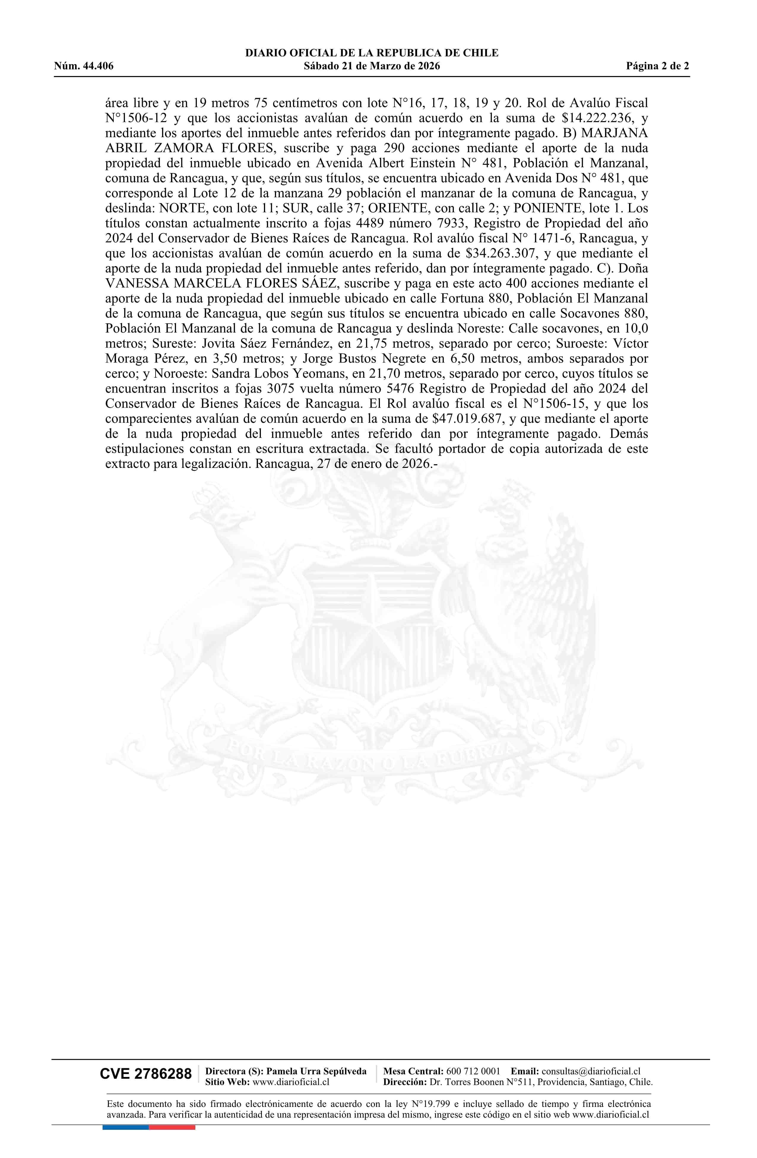 INMOBILIARIA FLORES SpA 21-03-2026 Diario Oficial Edición Electrónica |