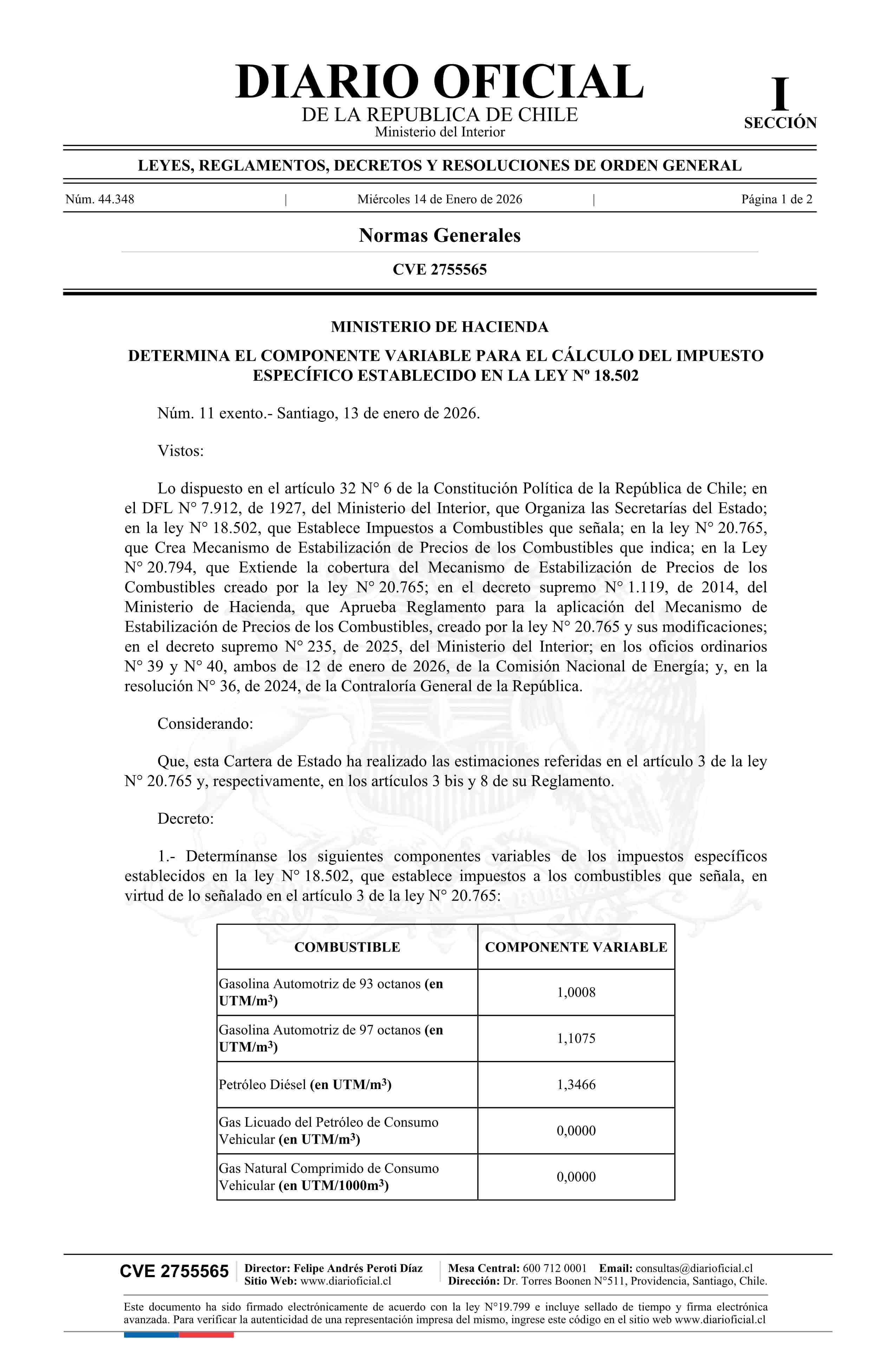| Título: | Decreto exento número 11, de 2026.- Determina el componente variable para el cálculo del impuesto específico establecido en la ley N° 18.502 |