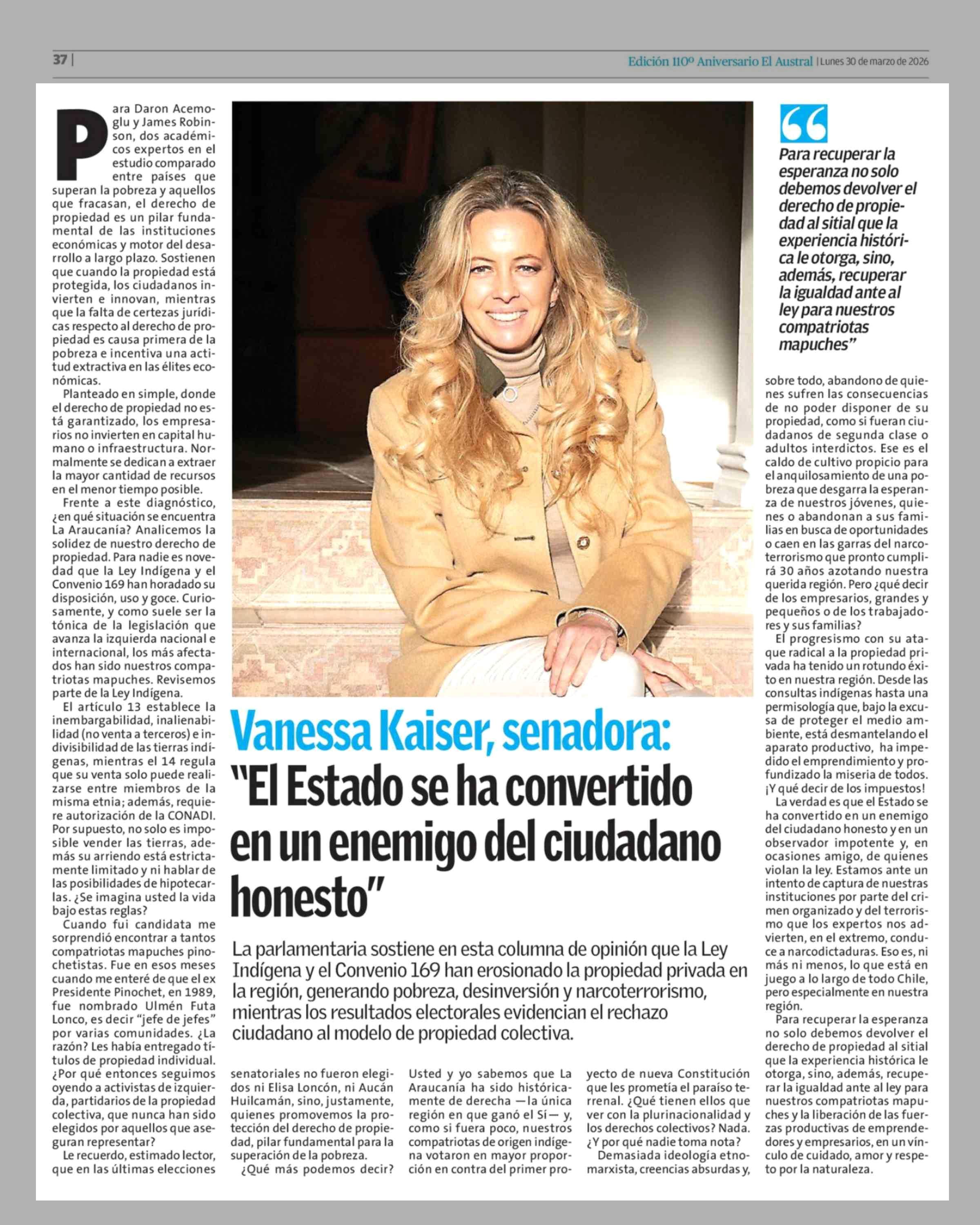 Vanessa Kaiser, senadora: "El Estado se ha convertido en un enemigo del ciudadano honesto" 30-03-2026 El Austral de la Araucanía |