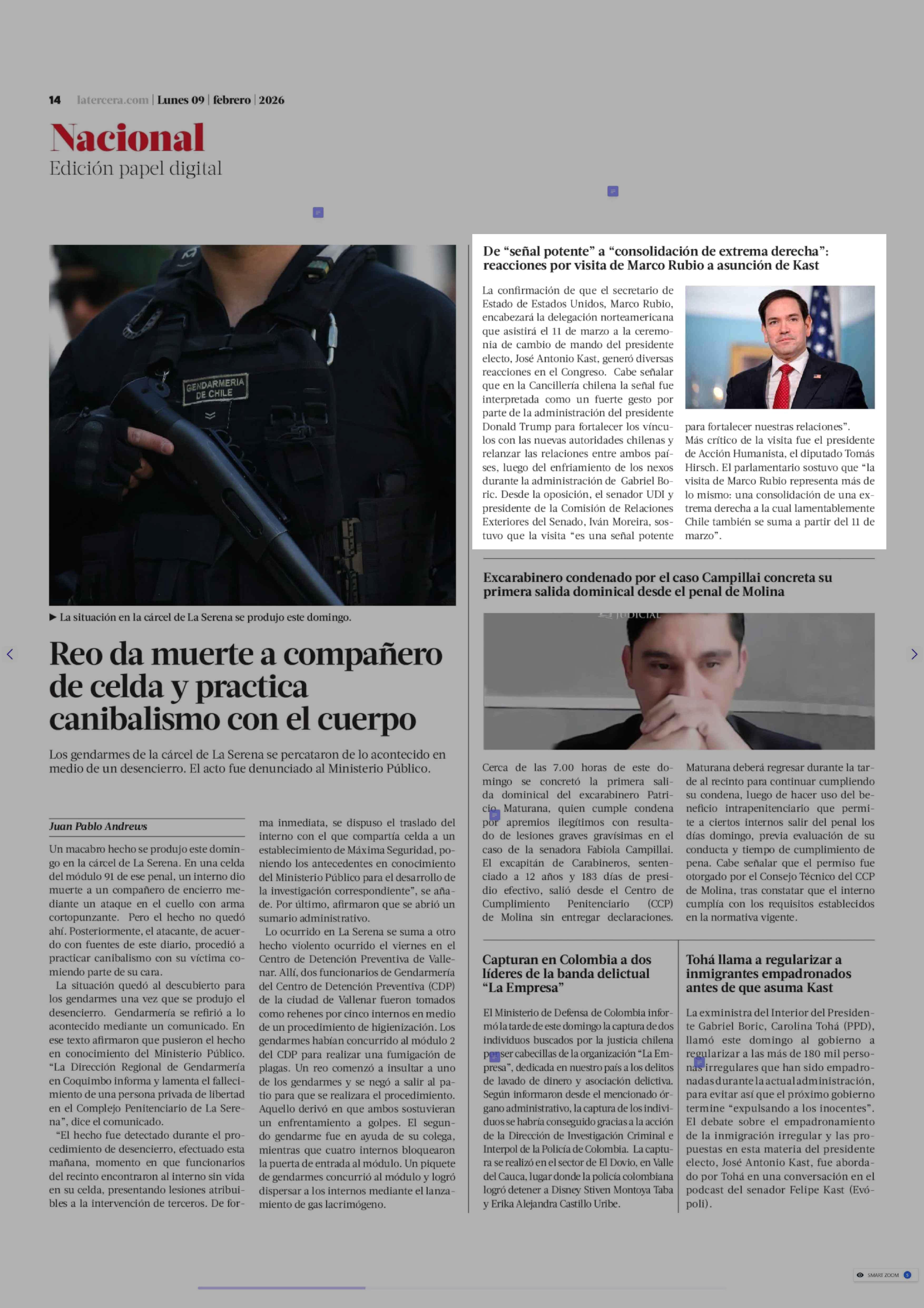De "señal potente" a "consolidación de extrema derecha": reacciones por visita de Marco Rubio a asunción de Kast 09-02-2026 La Tercera |