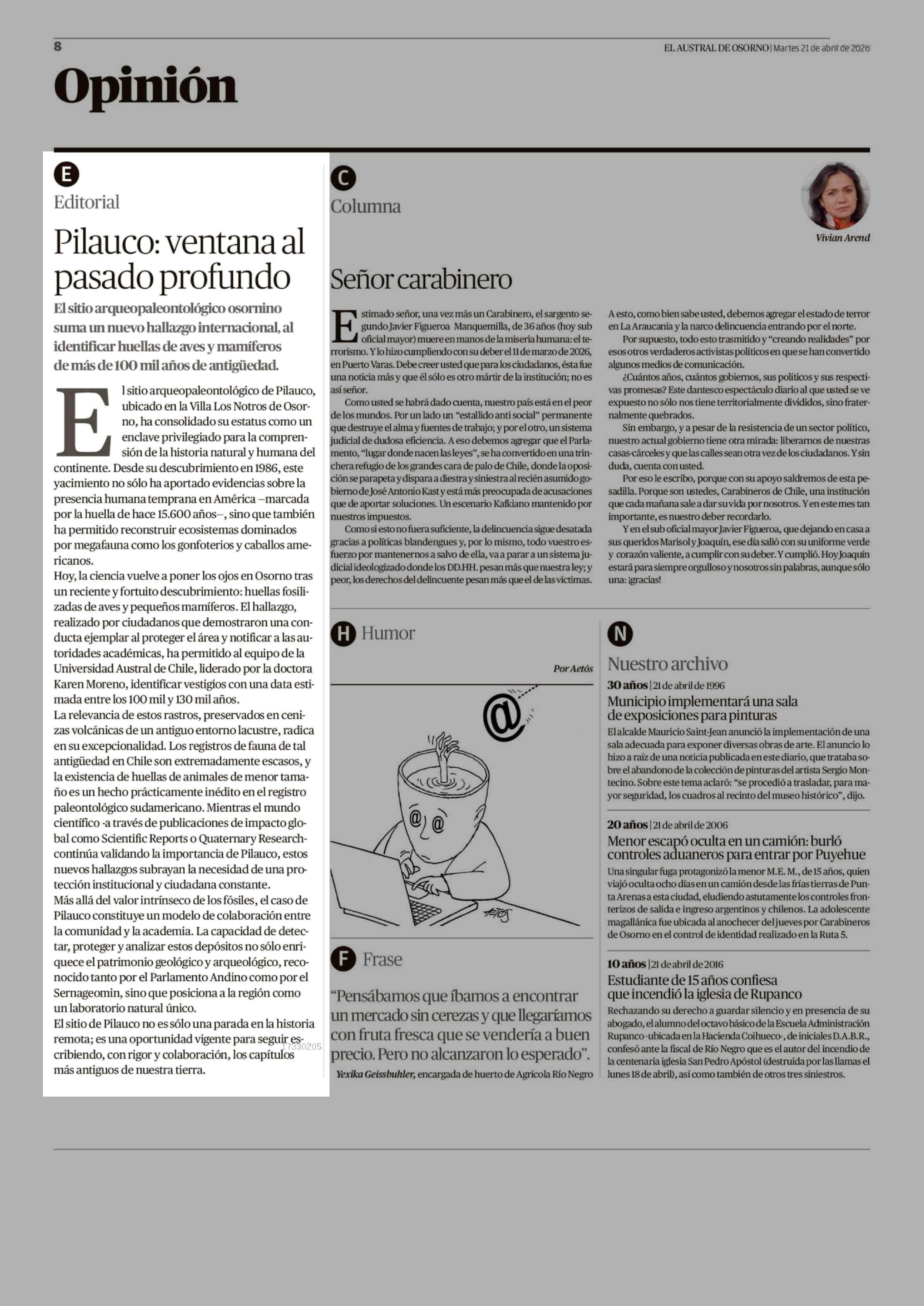 Editorial: Pilauco: ventana al pasado profundo 21-04-2026 El Austral de Osorno |