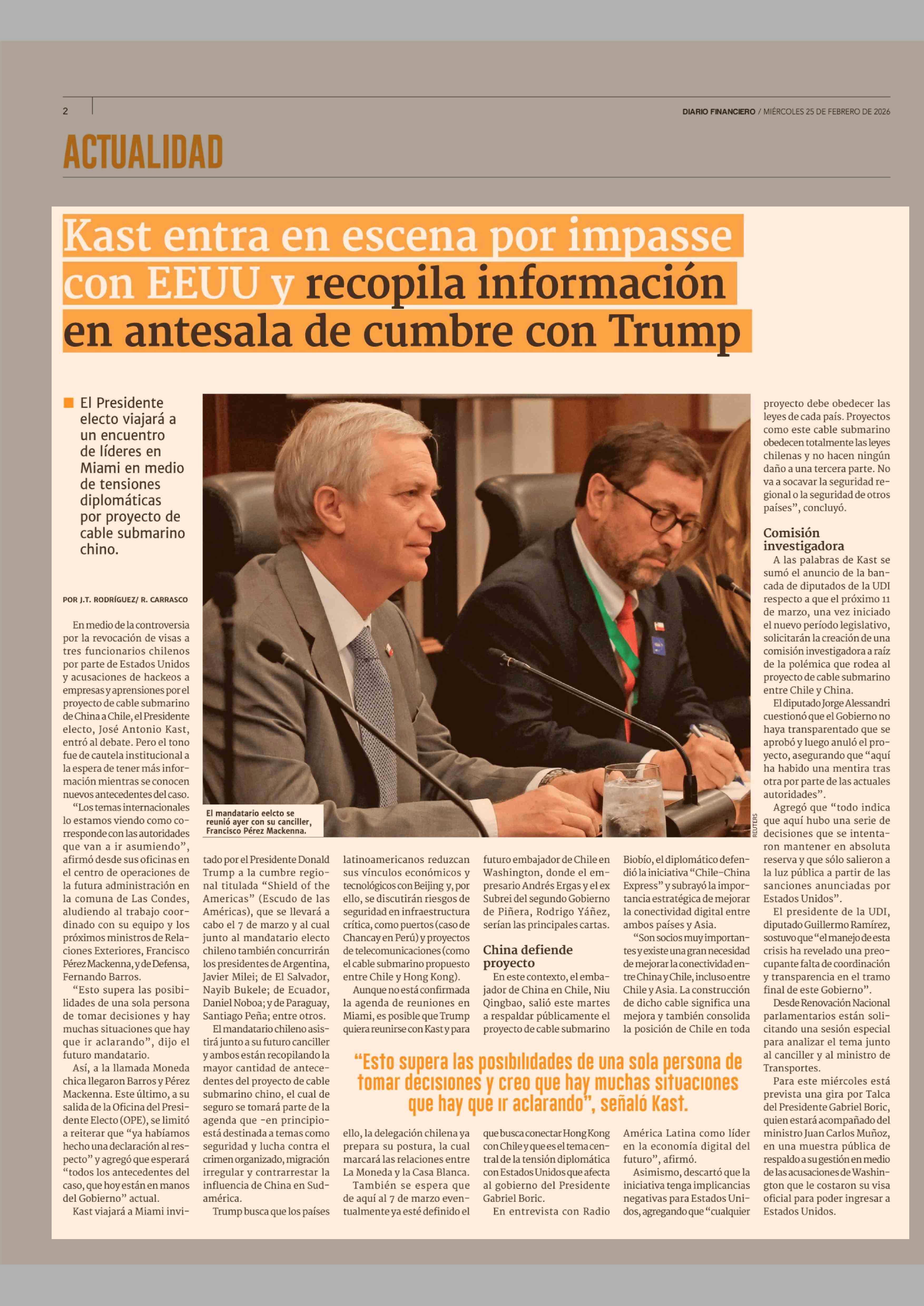 Kast entra en escena por impasse con EEUU y recopila información en antesala de cumbre con Trump 25-02-2026 Diario Financiero |