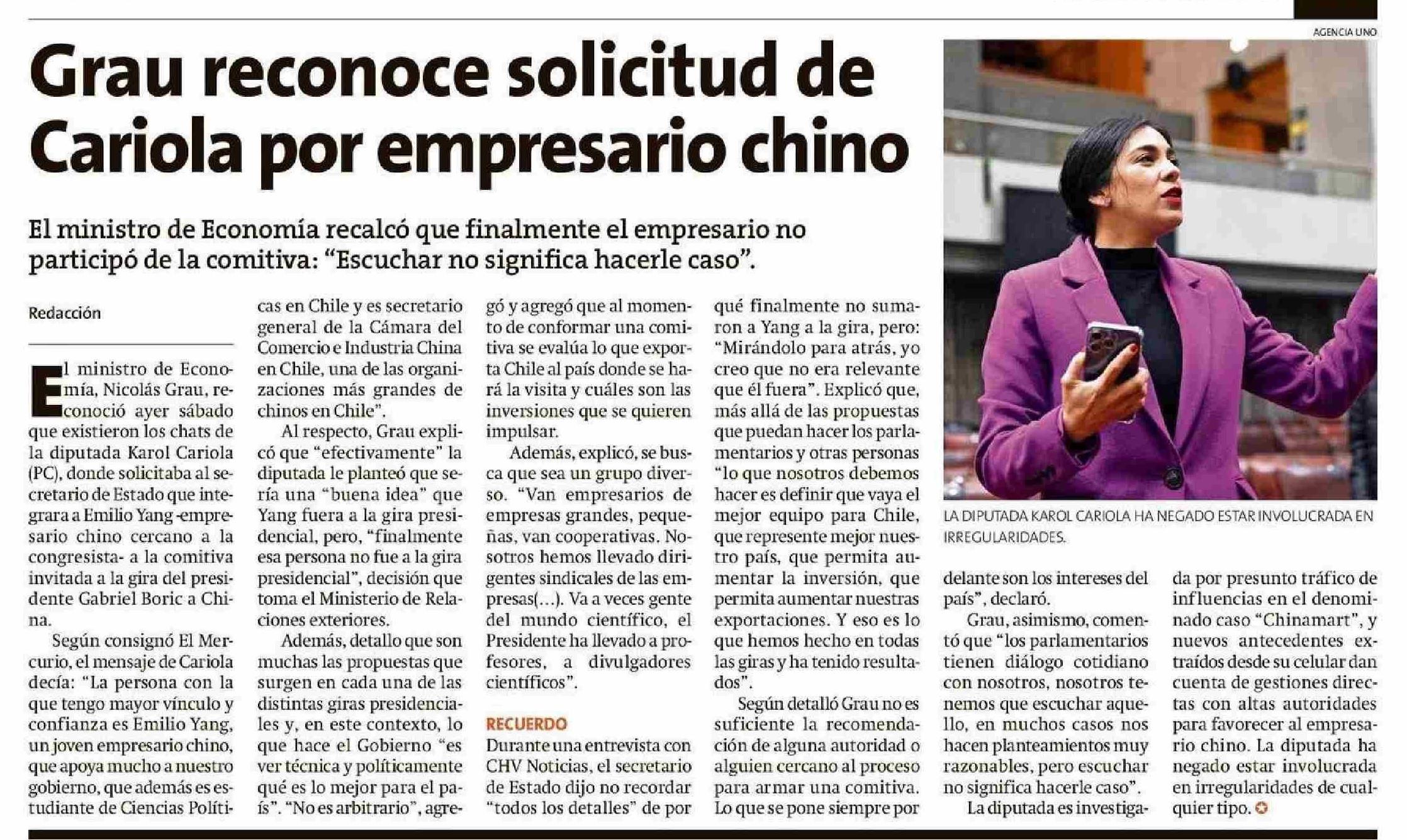 | Título: | Grau reconoce solicitud de Cariola por empresario chino |