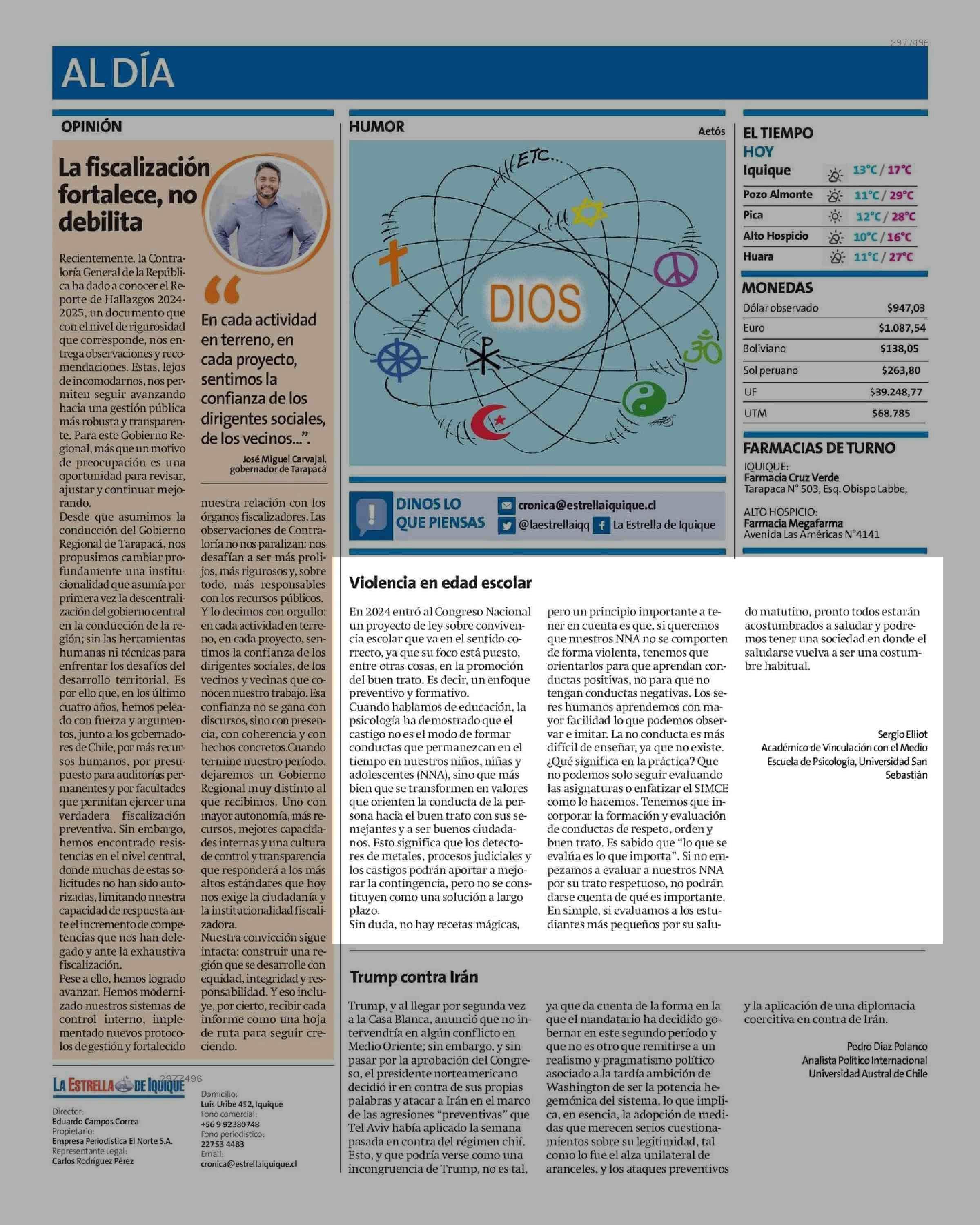 Cartas: Violencia en edad escolar 23-06-2025 La Estrella de Iquique |