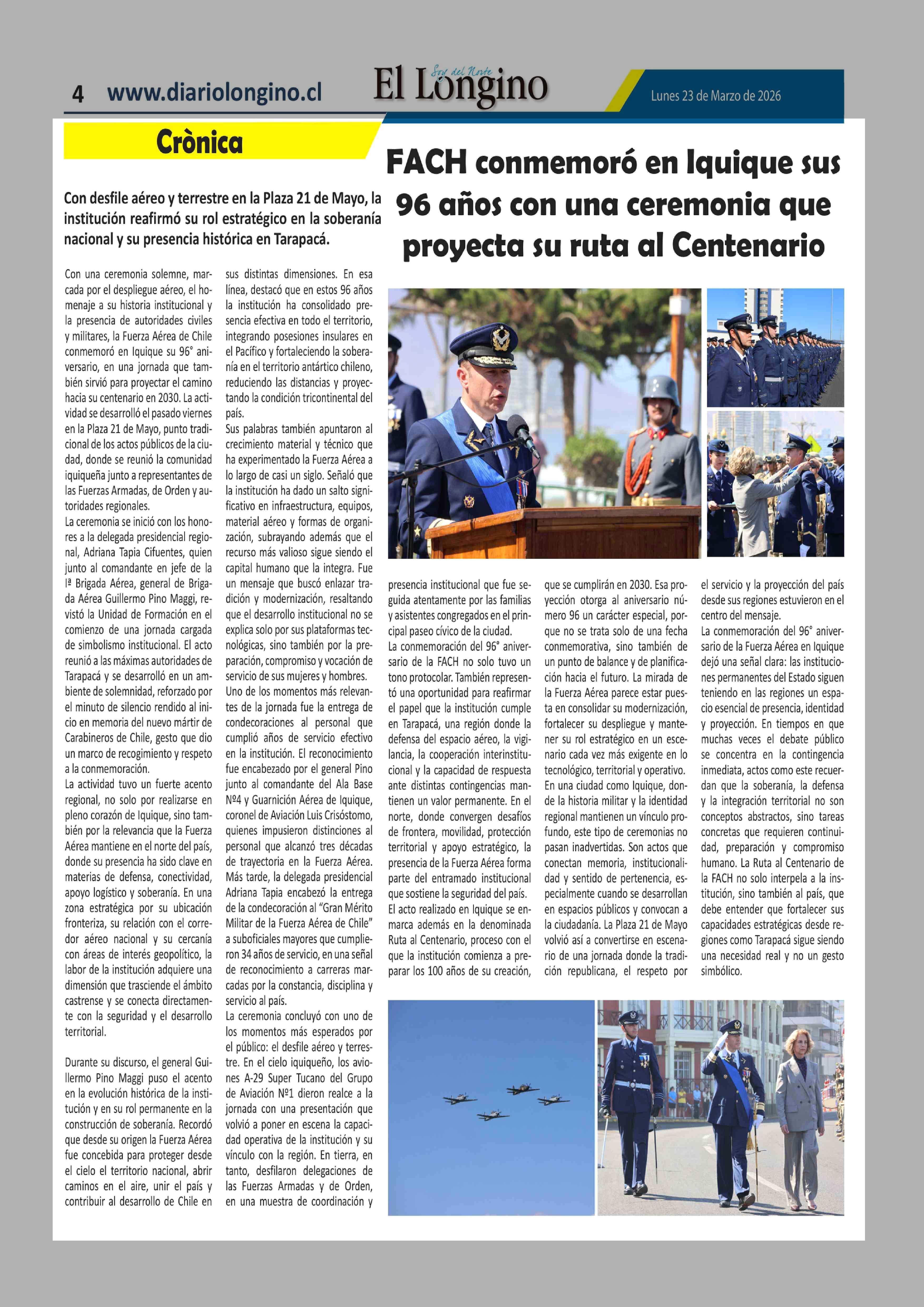FACH conmemoró en Iquique sus 96 años con una ceremonia que proyecta su ruta al Centenario 23-03-2026 El Longino |