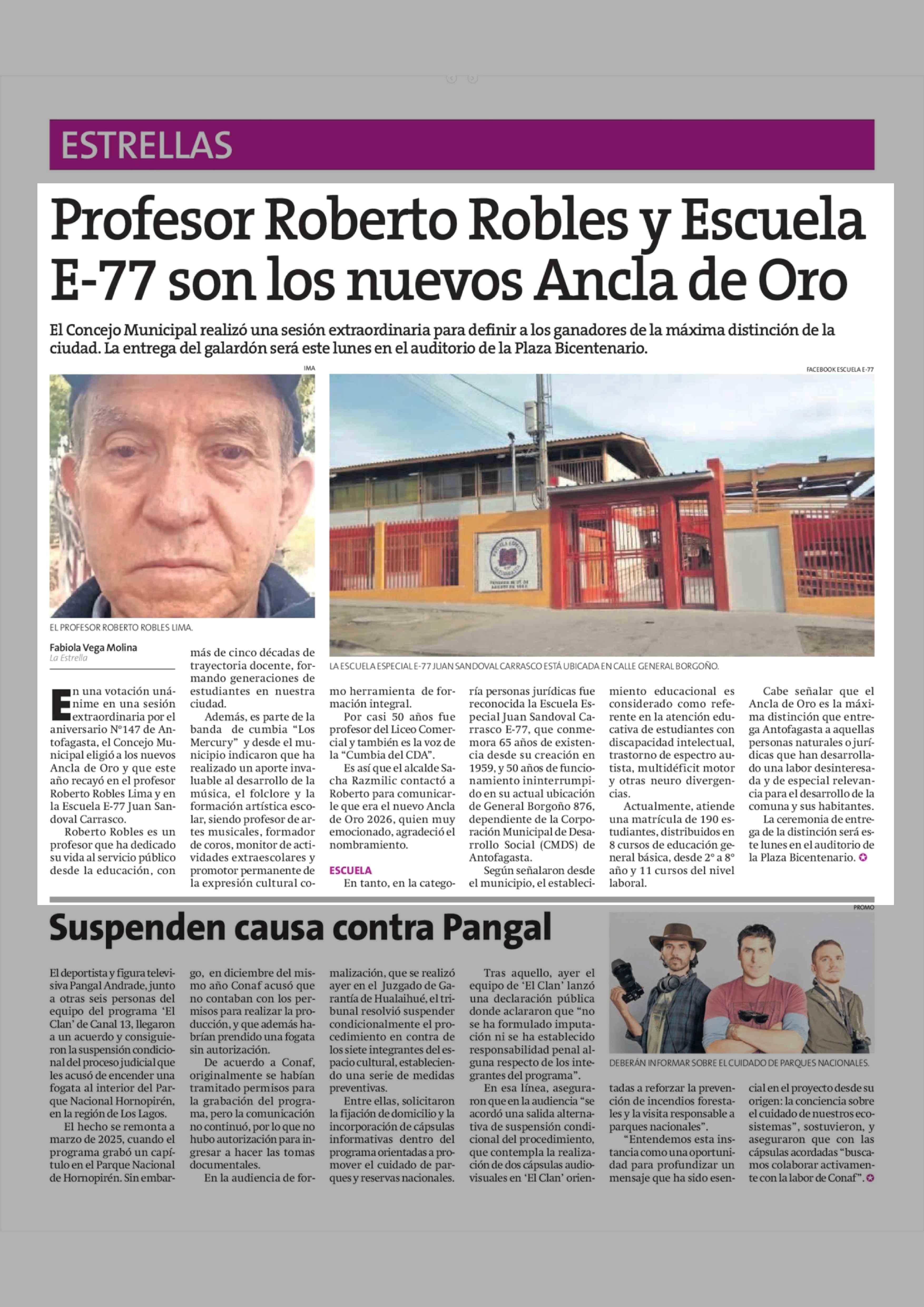 Profesor Roberto Robles y Escuela E-77 son los nuevos Ancla de Oro 05-02-2026 La Estrella de Antofagasta |