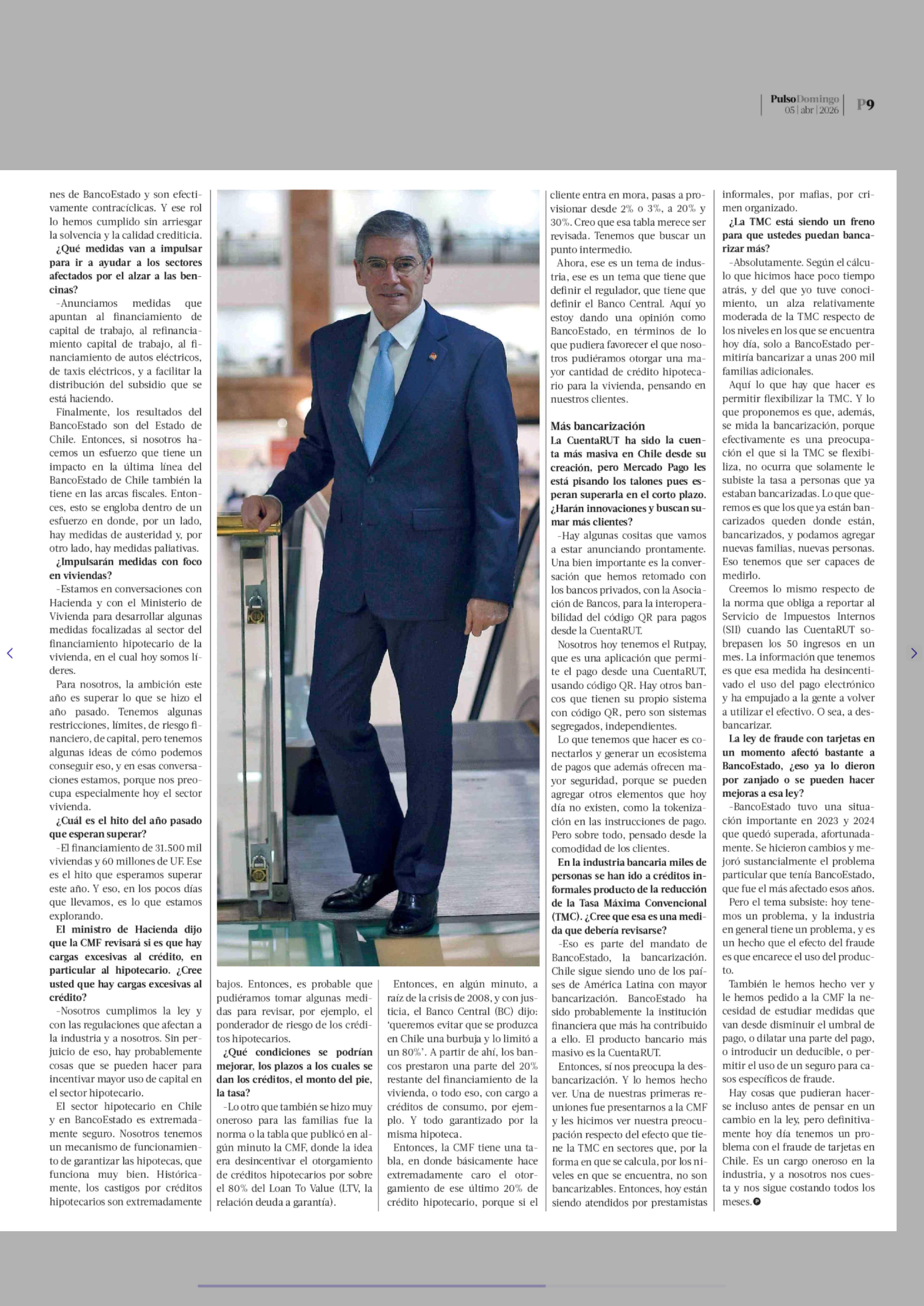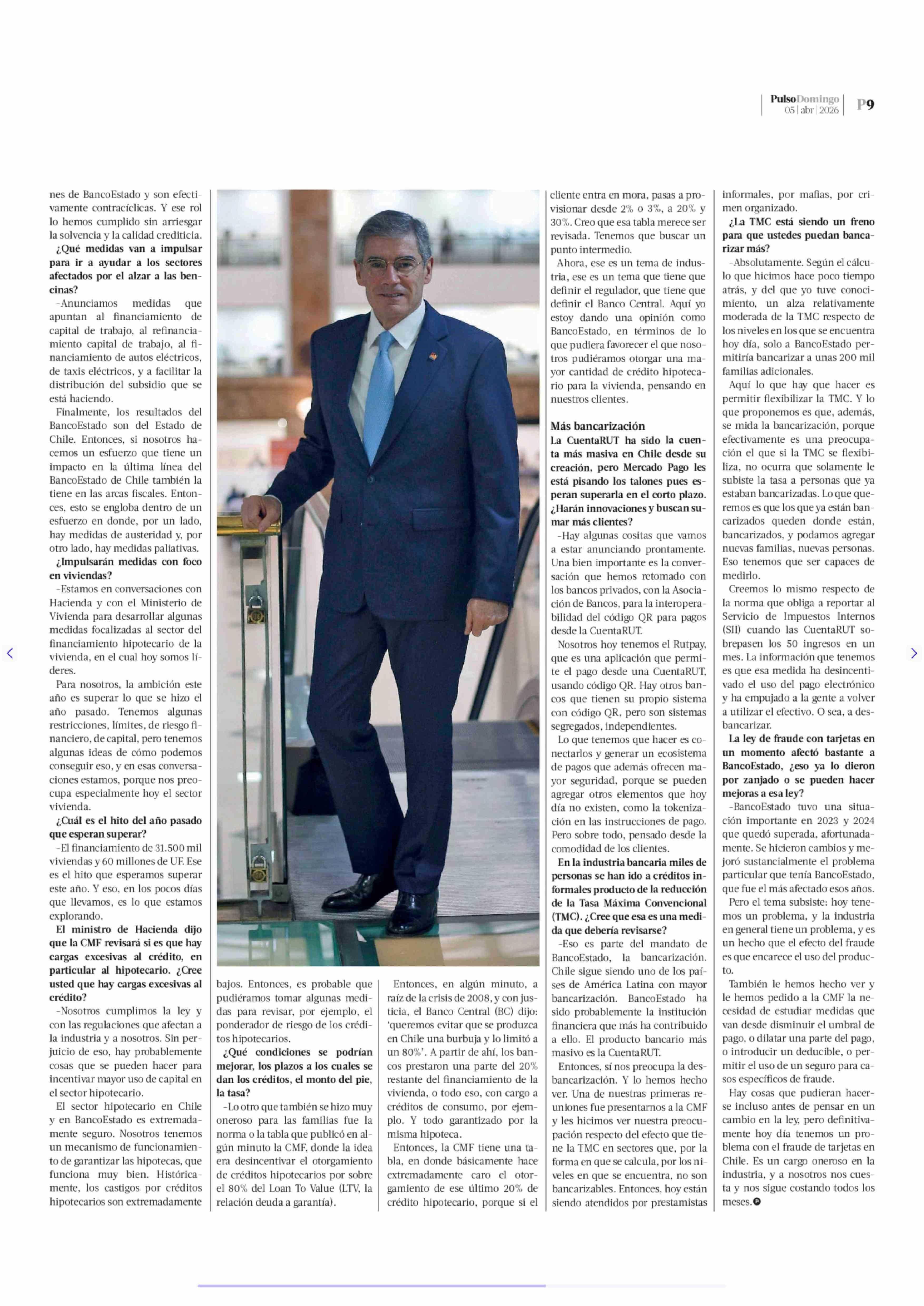 Mario Farren pide flexibilizar la Tasa Máxima Convencional: "Solo a BancoEstado le permitiría bancarizar a unas 200 mil familias adicionales" 05-04-2026 La Tercera |
