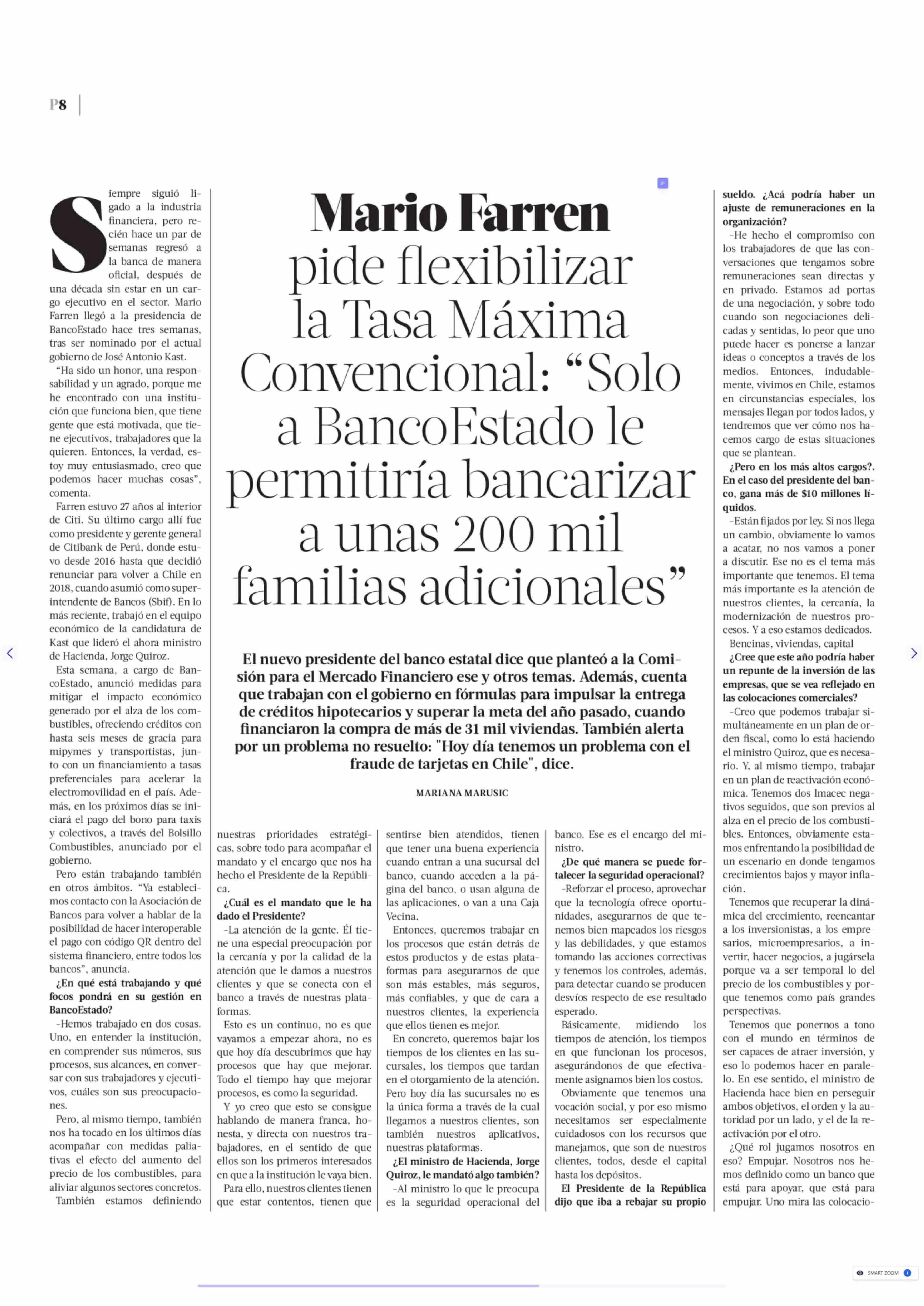 | Título: | Mario Farren pide flexibilizar la Tasa Máxima Convencional: "Solo a BancoEstado le permitiría bancarizar a unas 200 mil familias adicionales" |