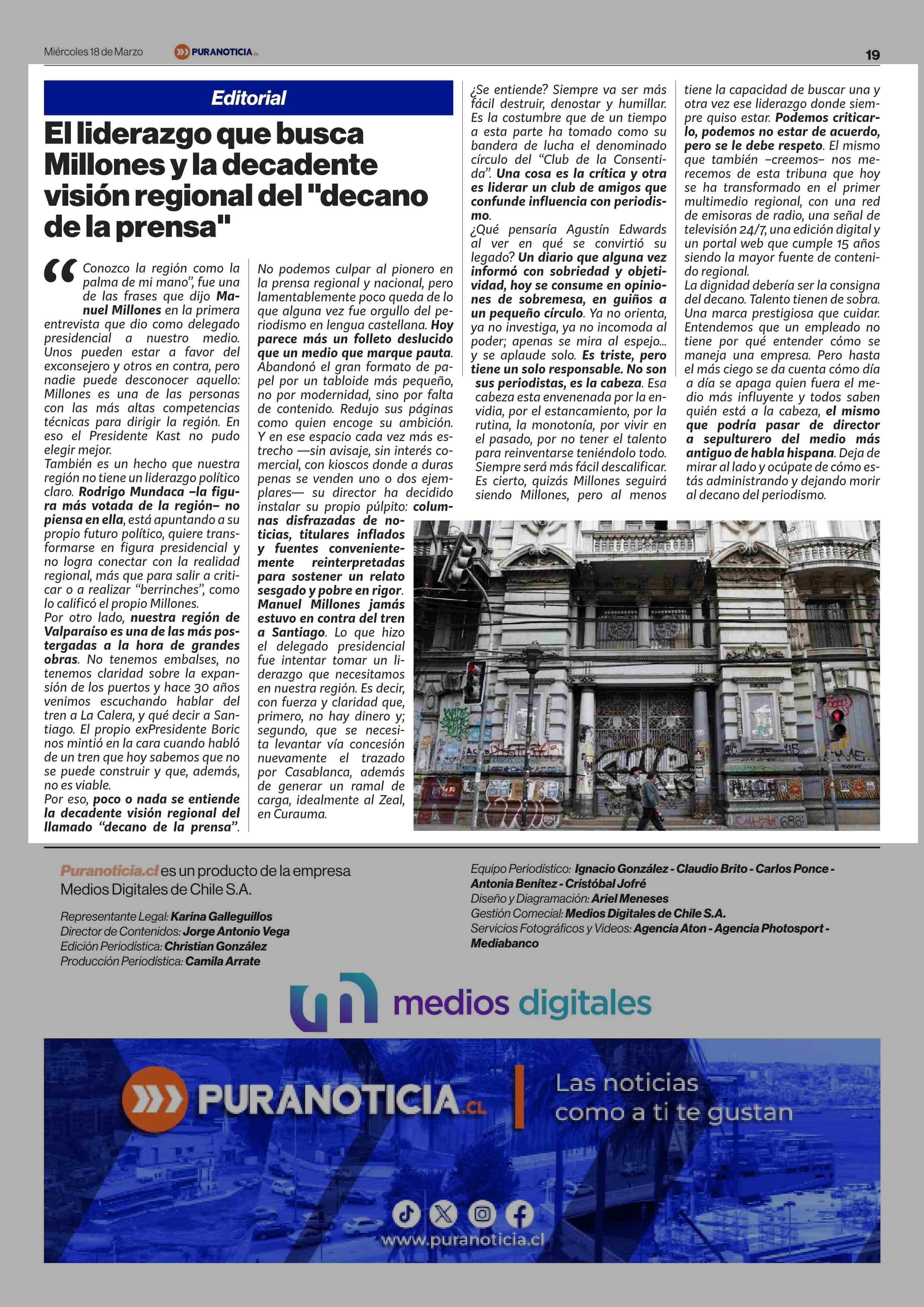 EDITORIAL: El liderazgo que busca Millones y la decadente visión regional del "decano dela prensa" 18-03-2026 Puranoticia.cl |