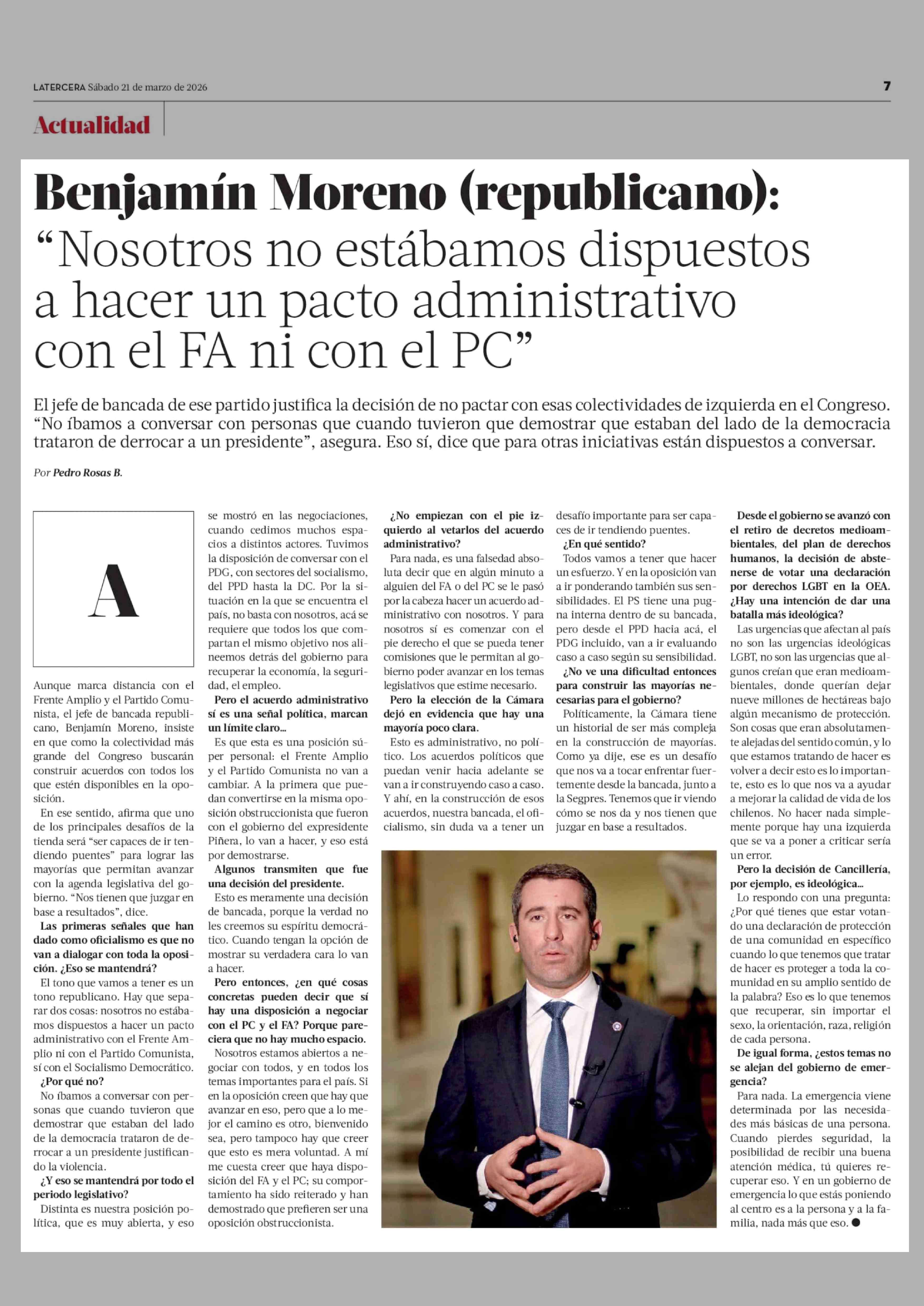 Título: Benjamín Moreno (republicano): "Nosotros no estábamos dispuestos a hacer un pacto administrativo con el FA ni con el PC"