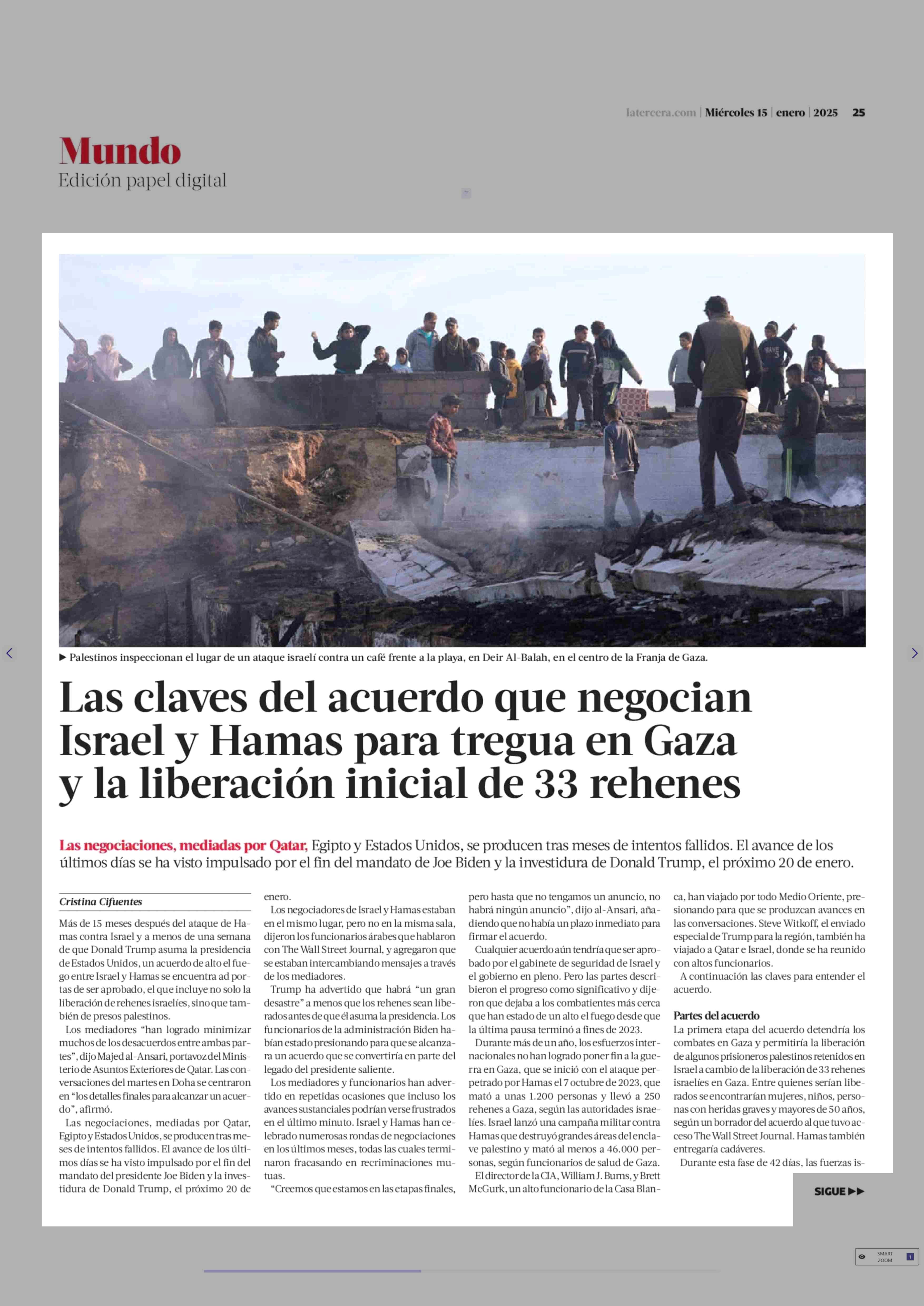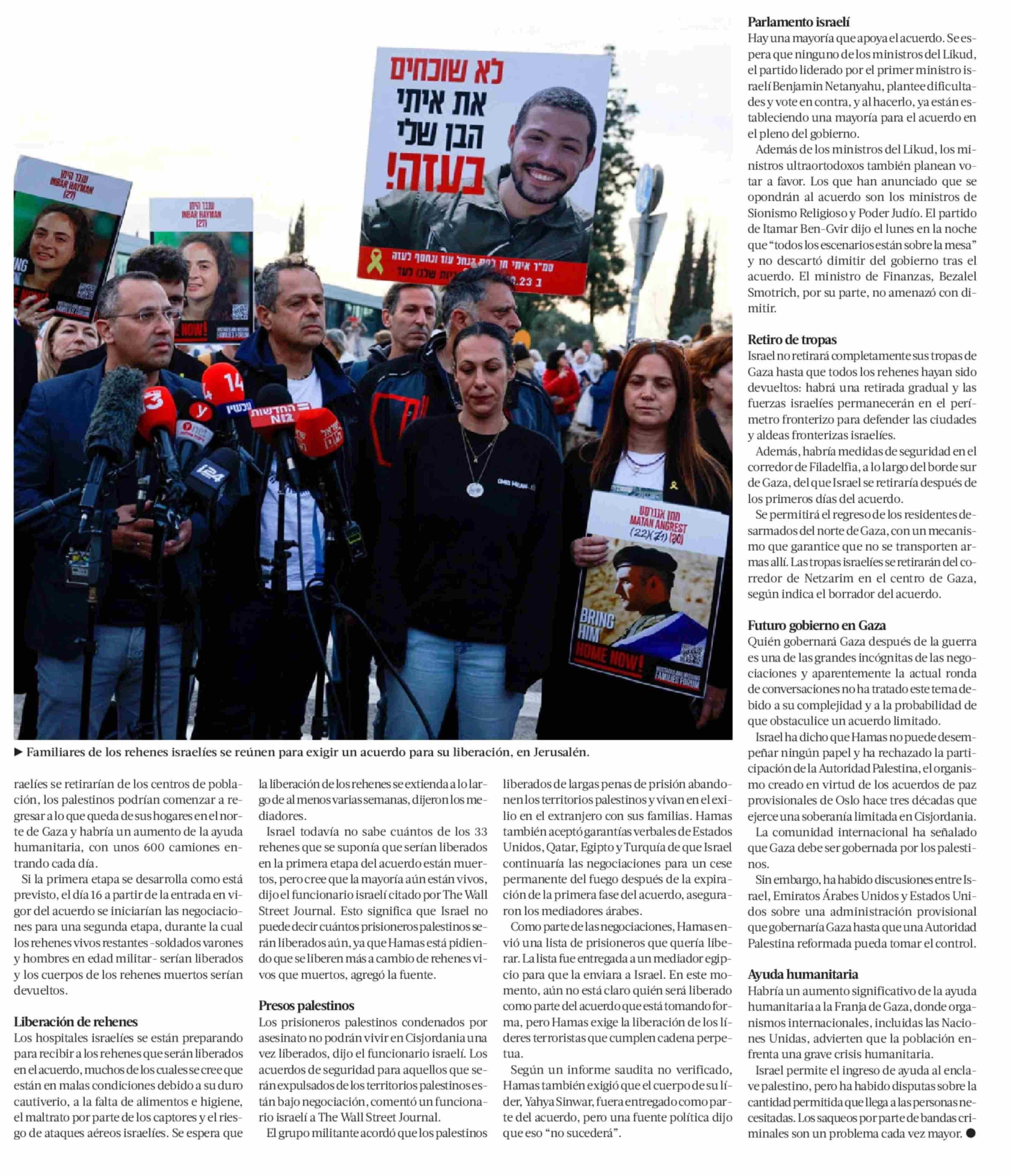 Las claves del acuerdo que negocian Israel y Hamas para tregua en Gaza y la liberación inicial de 33 rehenes 15-01-2025 La Tercera |