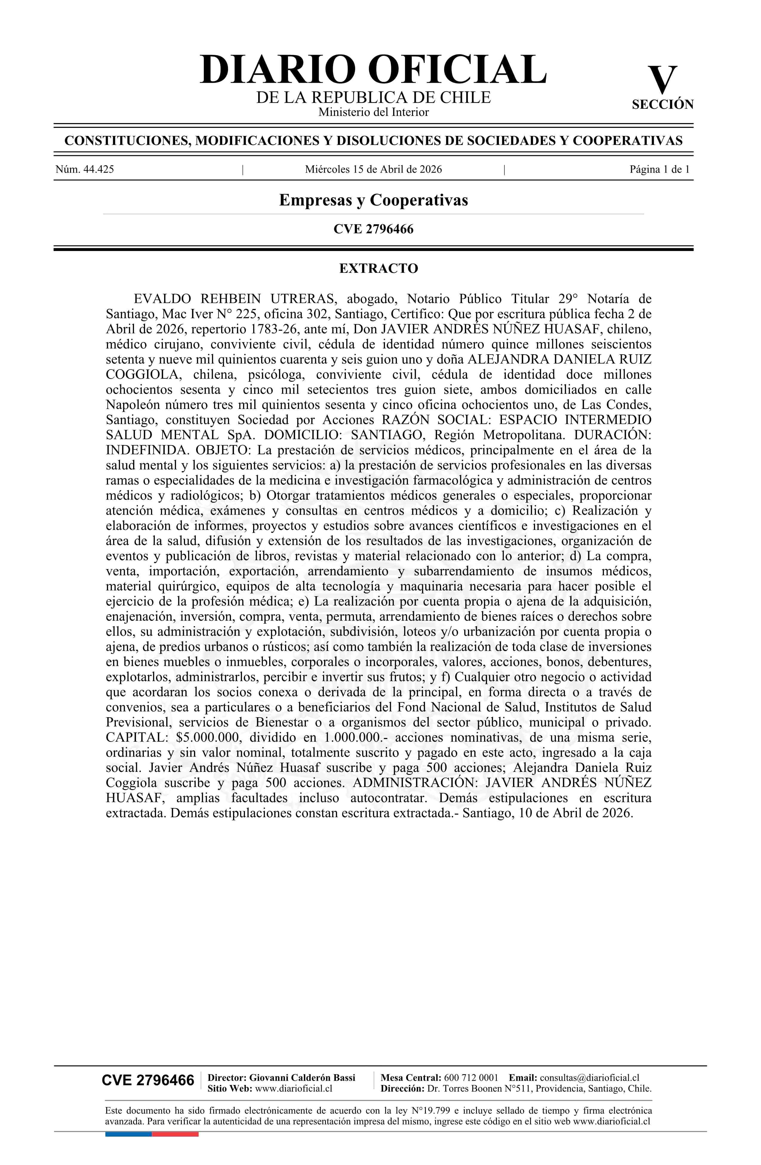 ESPACIO INTERMEDIO SALUD MENTAL SpA 15-04-2026 Diario Oficial Edición Electrónica |
