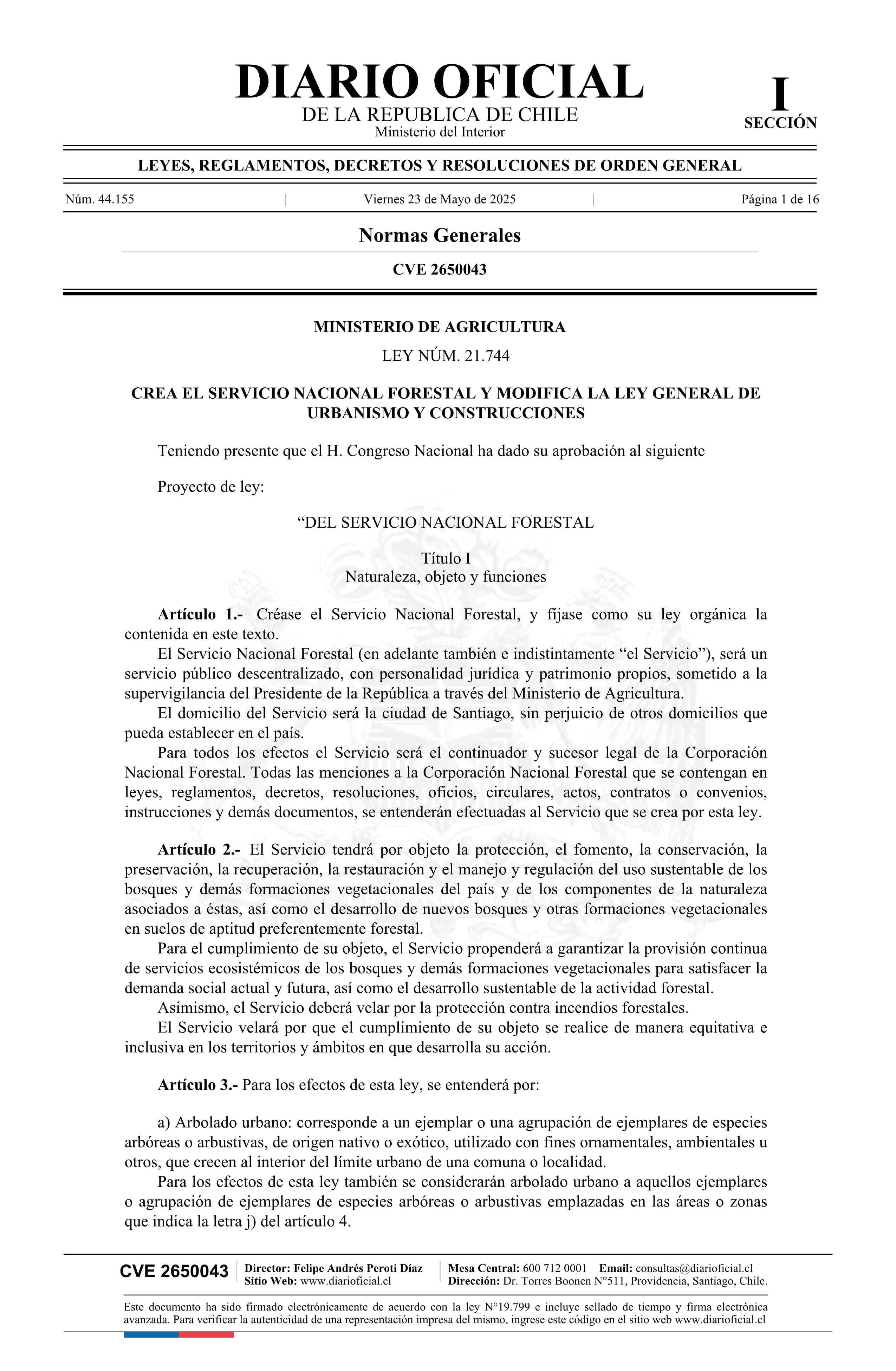 Título: AVISO LICITACIONES: Ley número 21.744.- Crea el Servicio Nacional Forestal y modifica la Ley General de Urbanismo y Construcciones