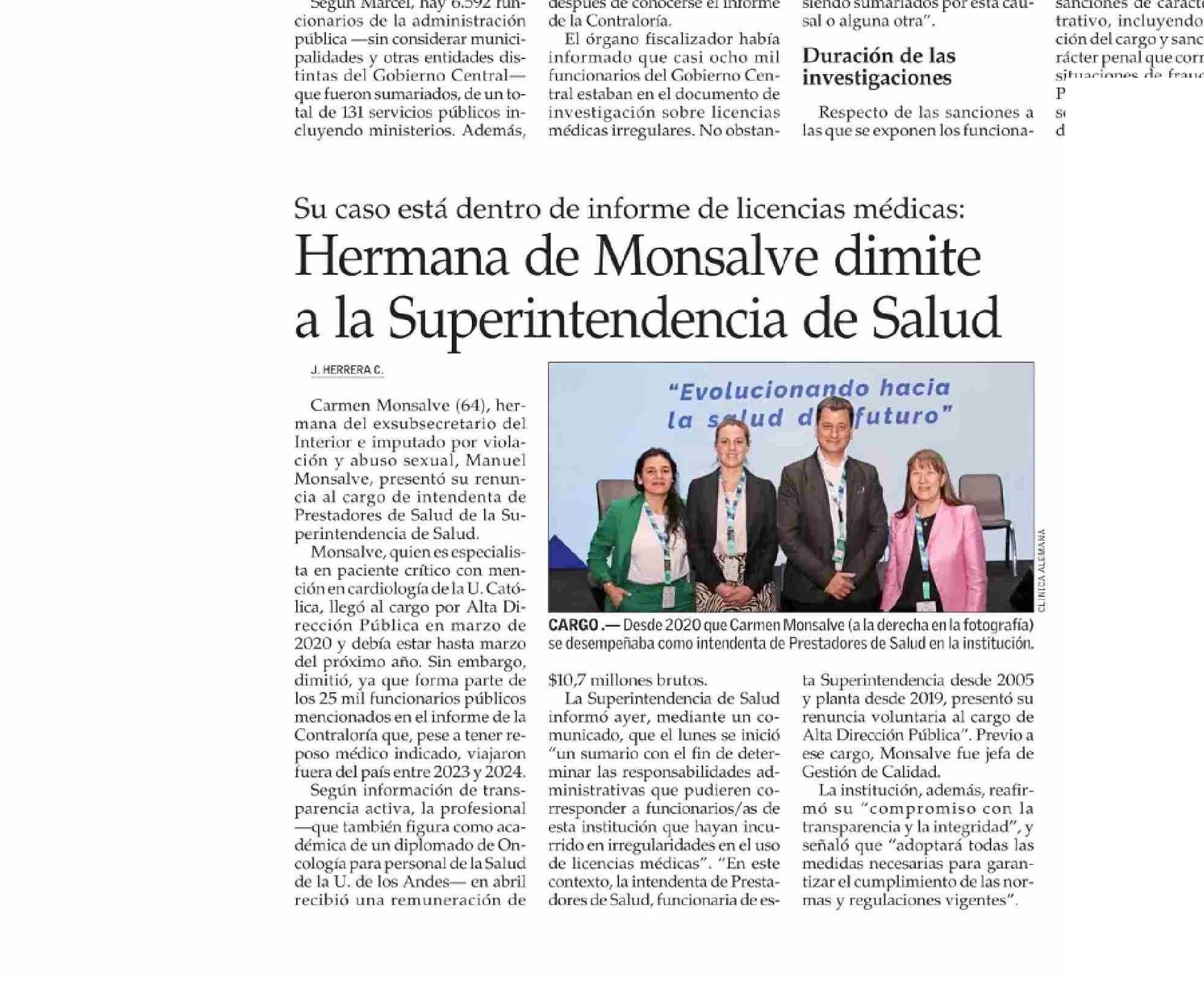 Título: Hermana de Monsalve dimite a la Superintendencia de Salud