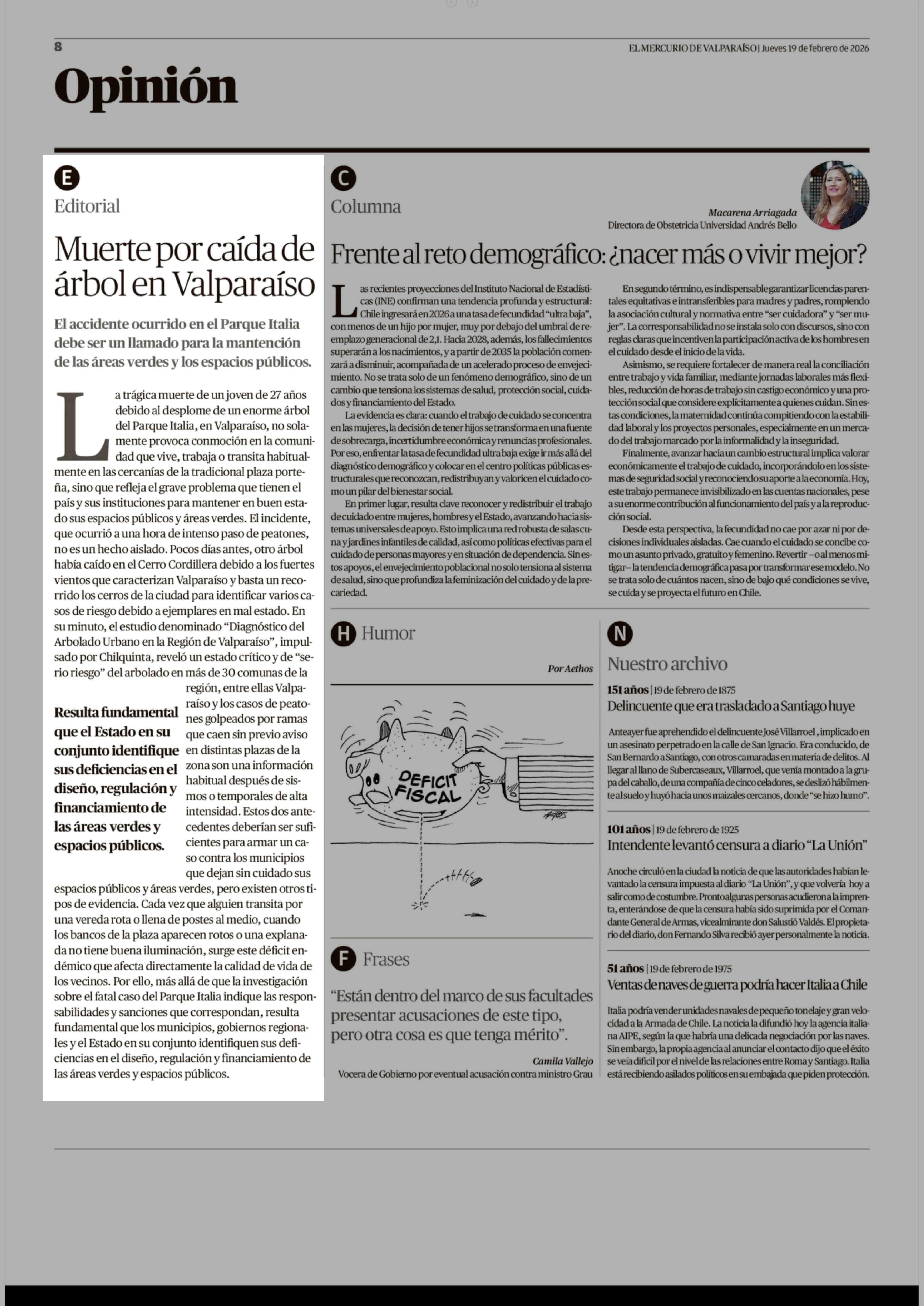 Columnas de Opinión: Muerte por caída de árbol en Valparaíso 19-02-2026 El Mercurio de Valparaíso |