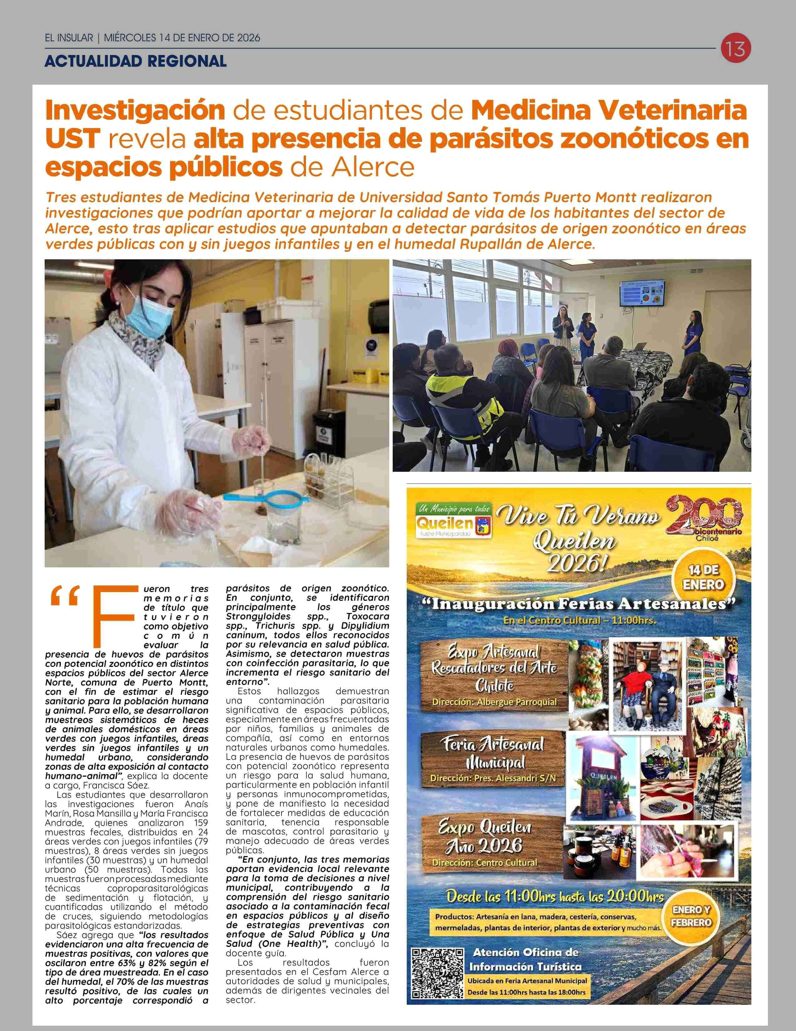 Investigación de estudiantes de Medicina Veterinaria UST revela alta presencia de parásitos zoonóticos en espacios públicos de Alerce 14-01-2026 El Insular |
