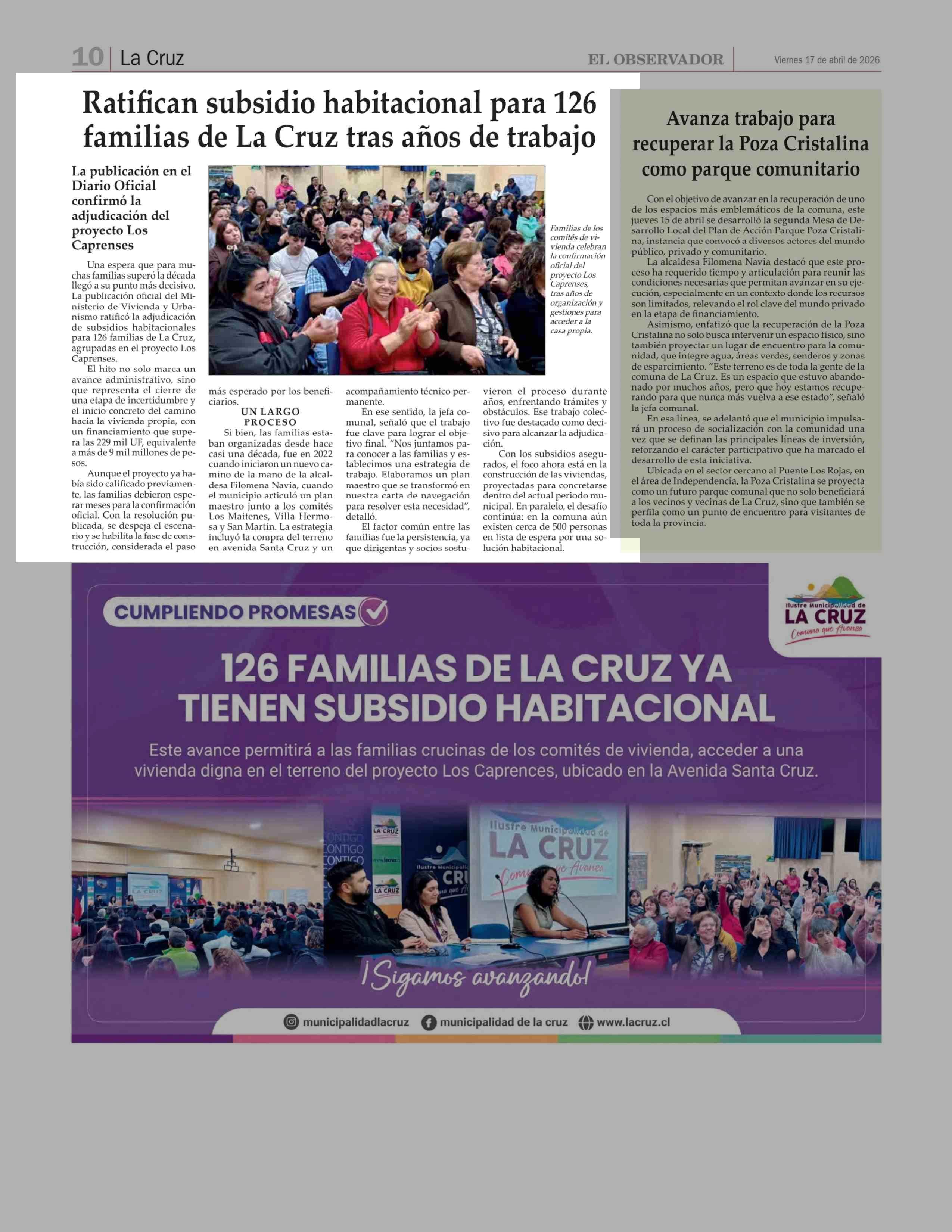 Ratifican subsidio habitacional para 126 familias de La Cruz tras años de trabajo 17-04-2026 El Observador |