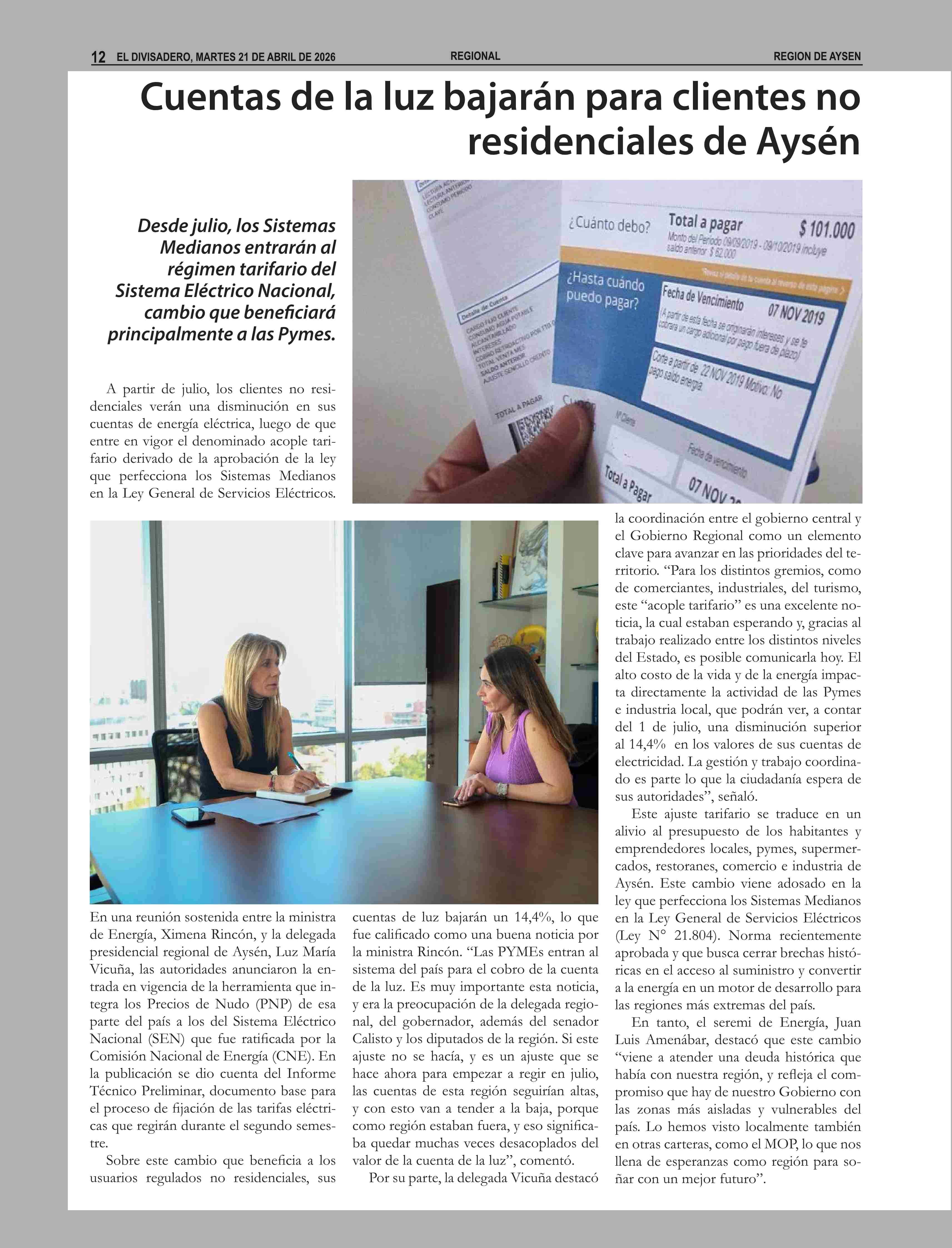 Cuentas de la luz bajarán para clientes no residenciales de Aysén 21-04-2026 El Divisadero |
