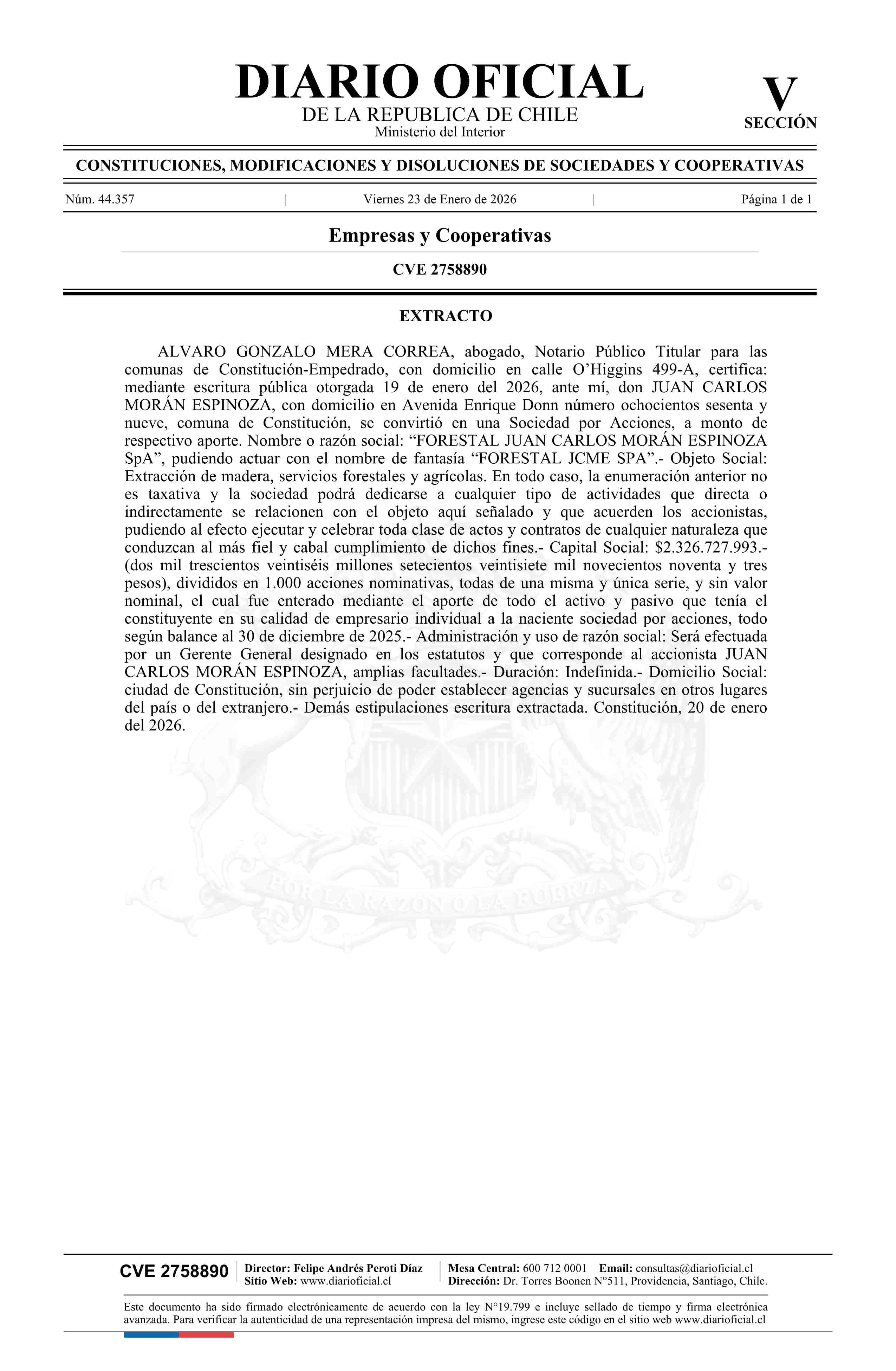 FORESTAL JUAN CARLOS MORÁN ESPINOZA SpA 23-01-2026 Diario Oficial Edición Electrónica |