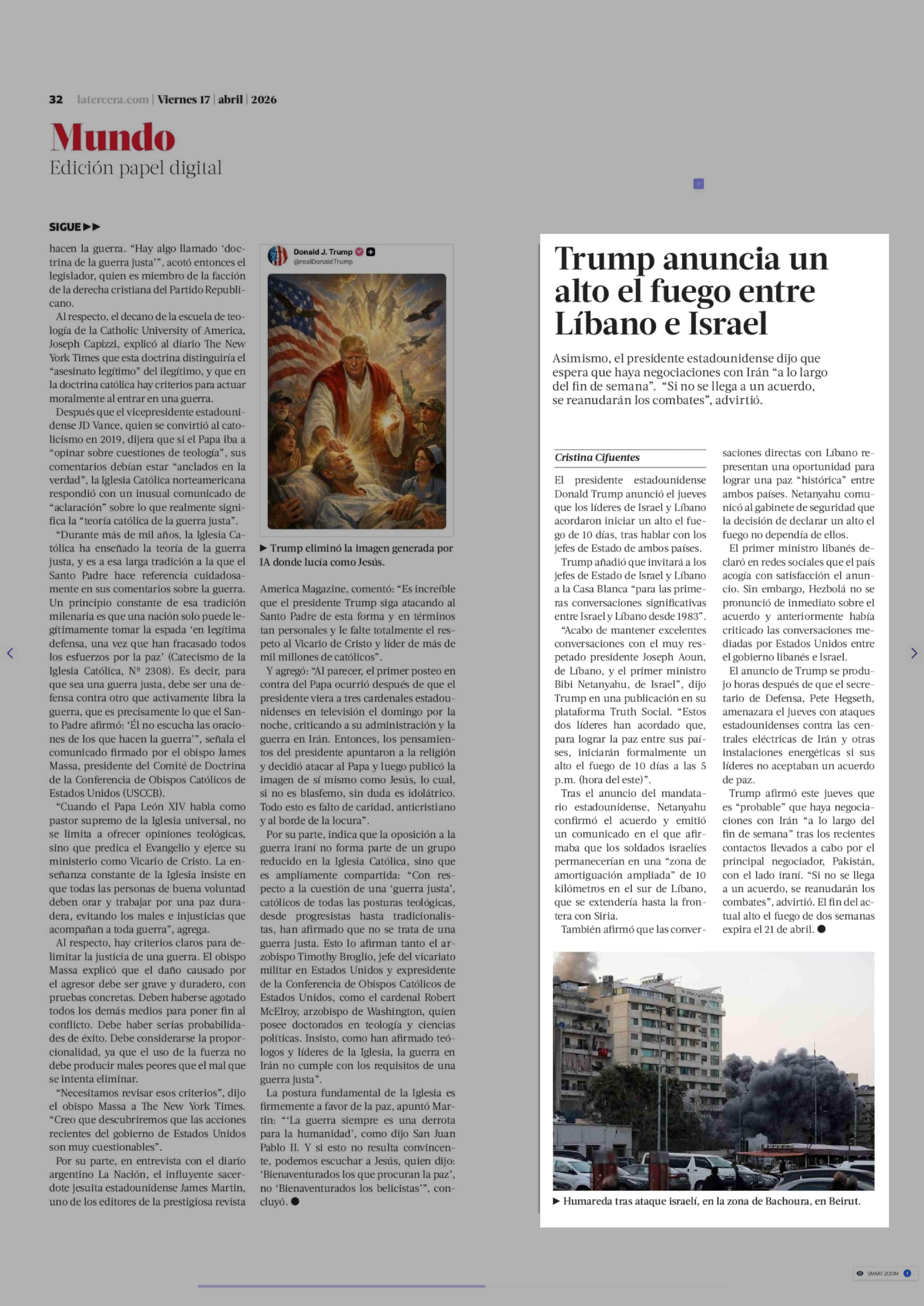 Enfrentamientos entre Trump y León XIV por Irán abren debate religioso sobre la "guerra justa" 17-04-2026 La Tercera |