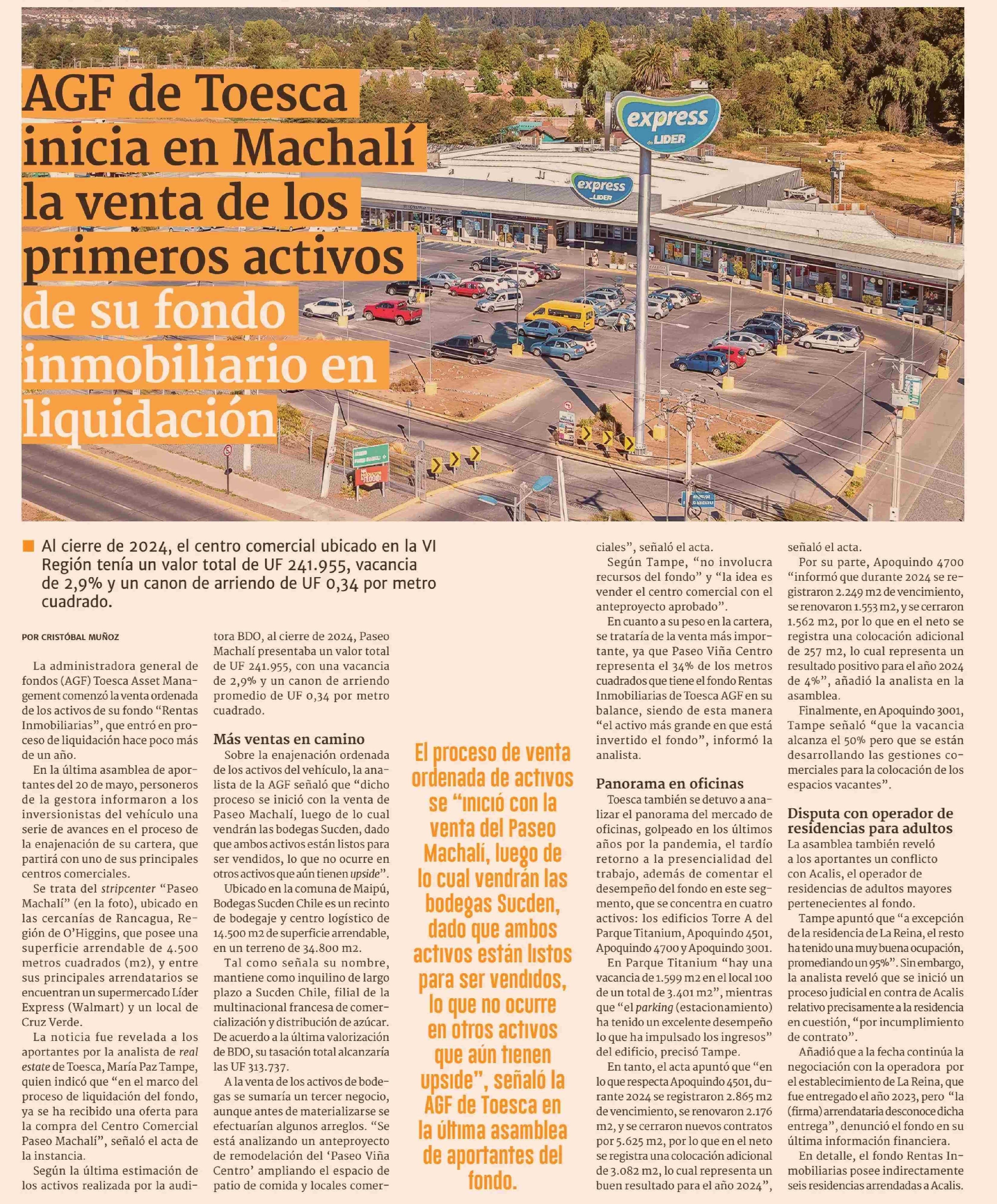 AGF de Toesca inicia en Machali la venta de los primeros activos de su fondo inmobiliario en liquidación 04-06-2025 Diario Financiero |