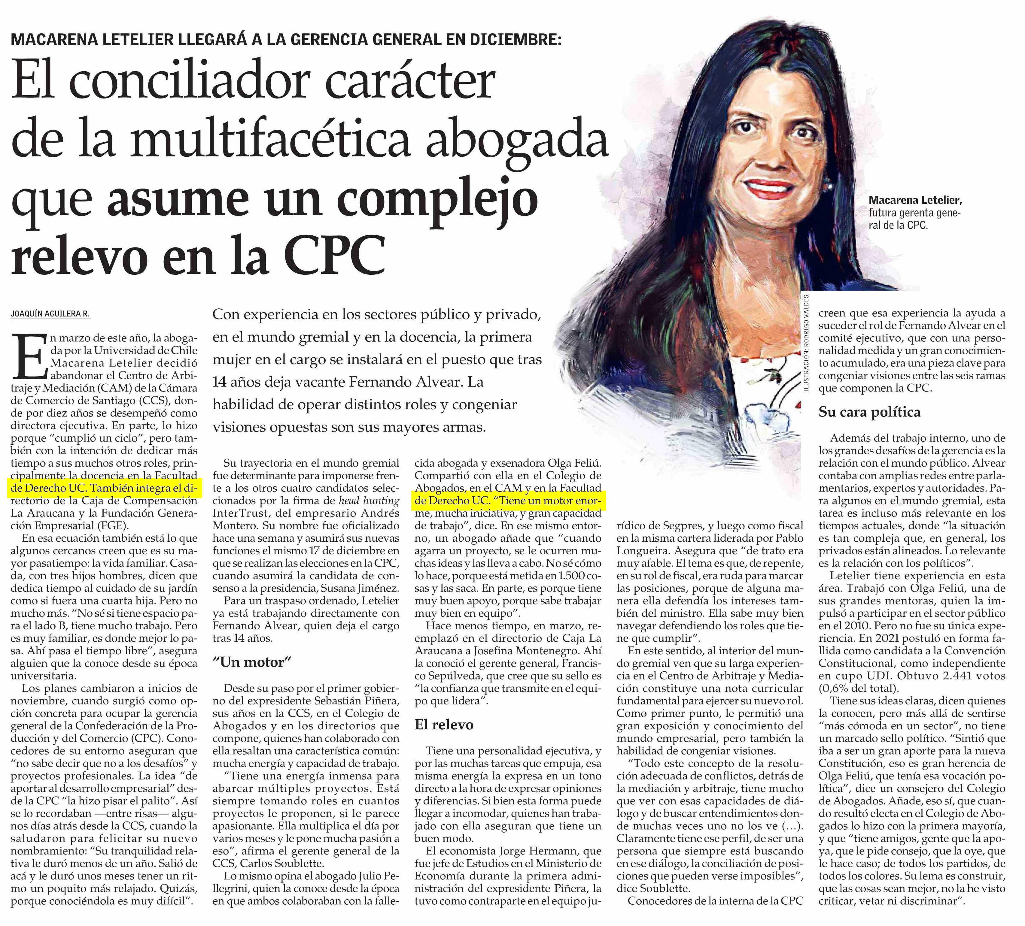 El conciliador carácter de la multifacética abogada que asume un complejo relevo en la CPC 30-11-2024 El Mercurio |