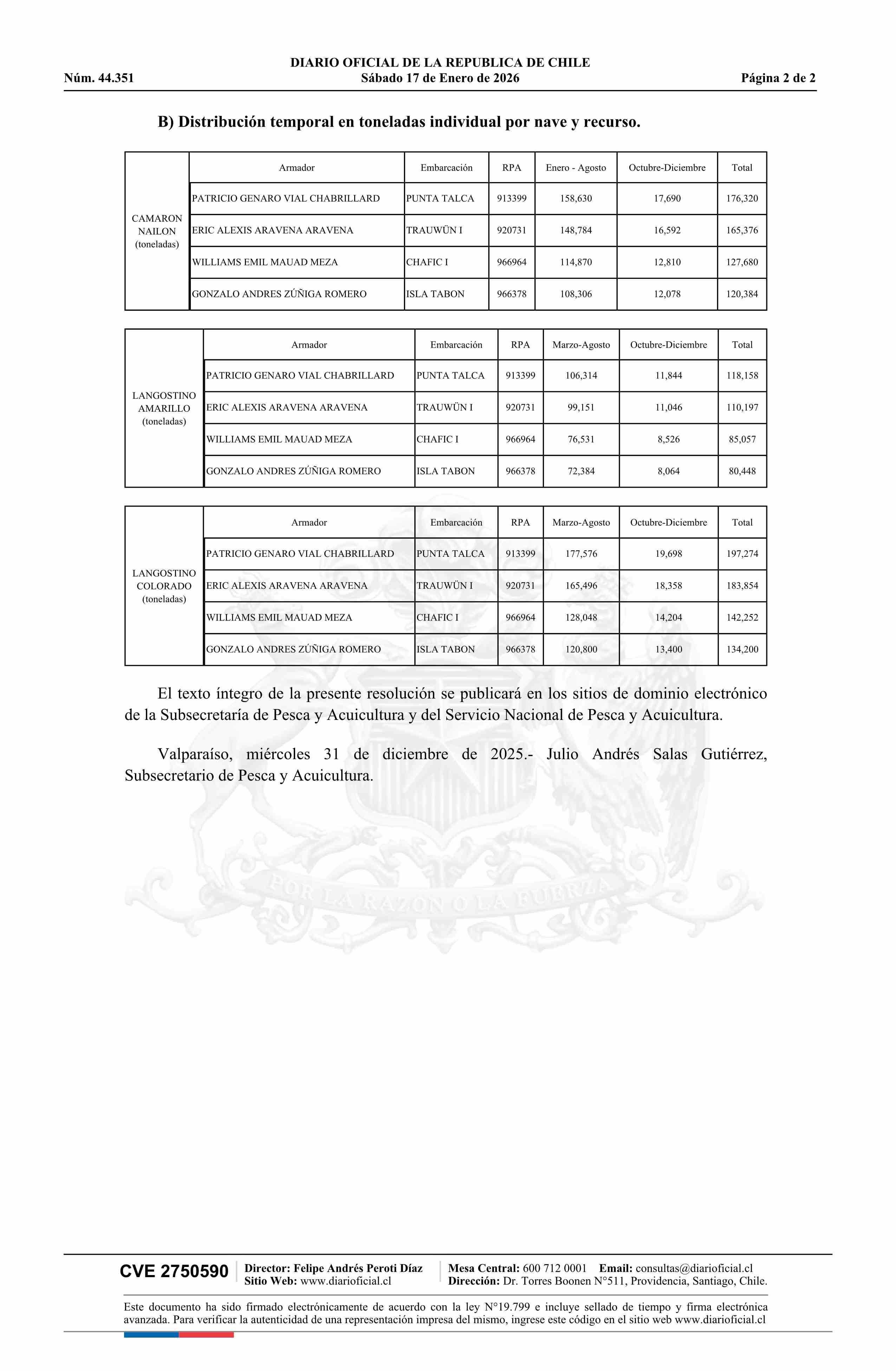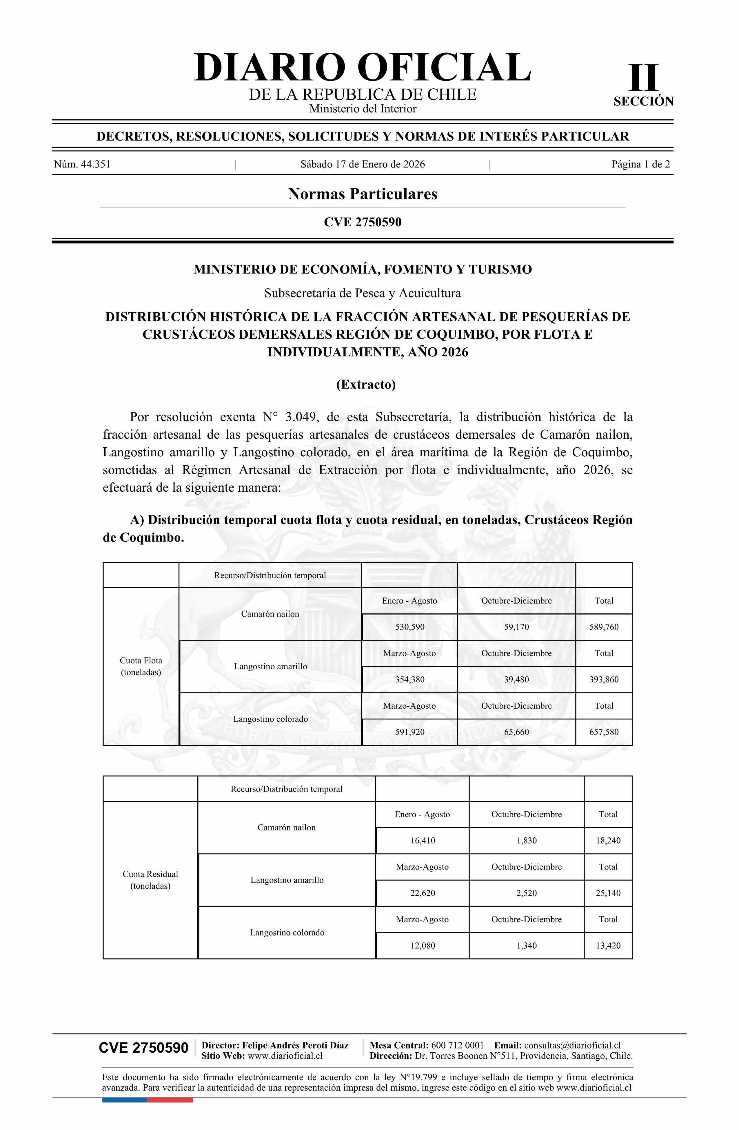 | Título: | Extracto de resolución exenta número 3.049, de 2025.- Distribuye fracción artesanal de pesquerías de Crustáceos demersales Región de Coquimbo, por flota e individualmente, año 2026 |