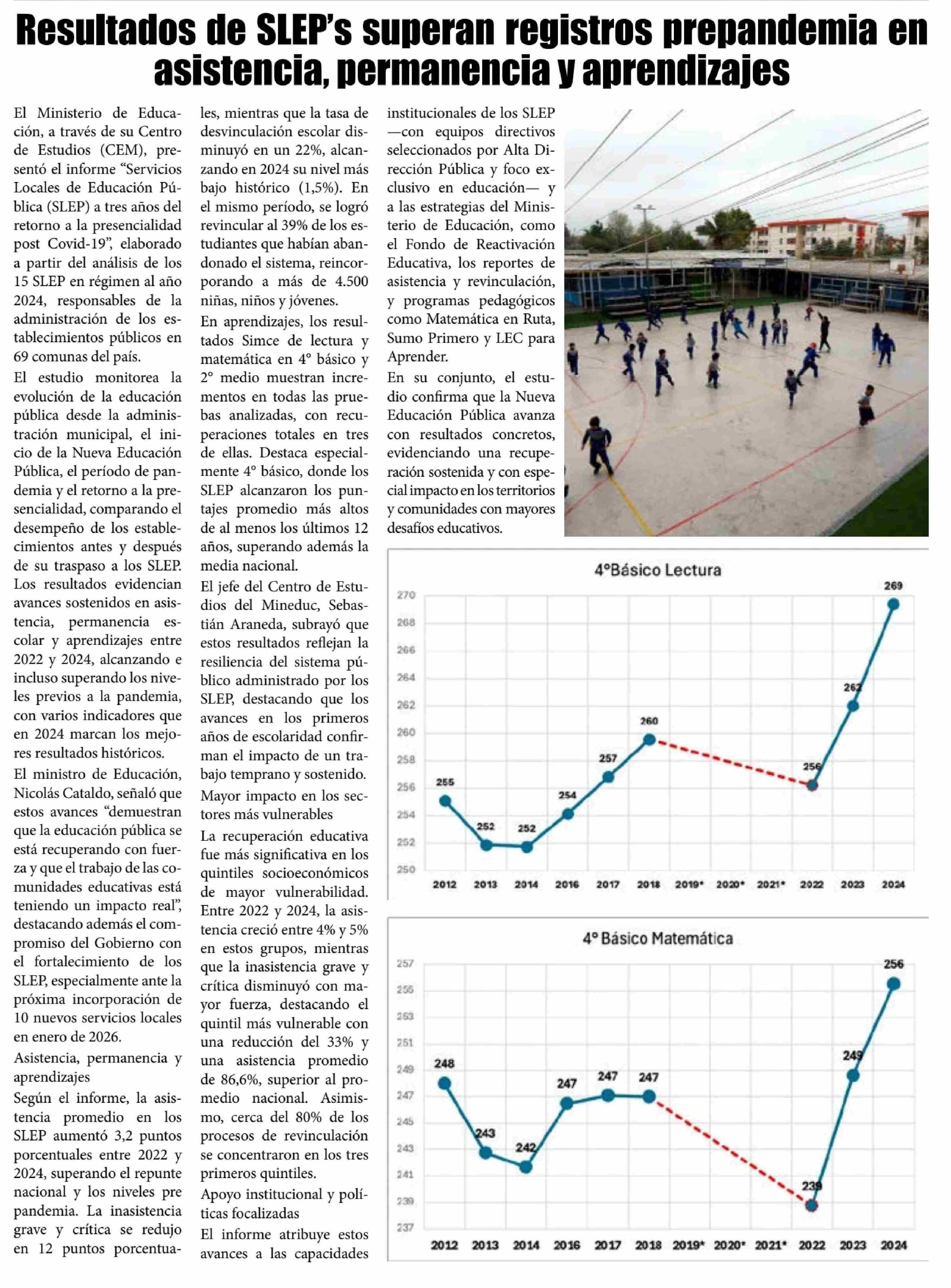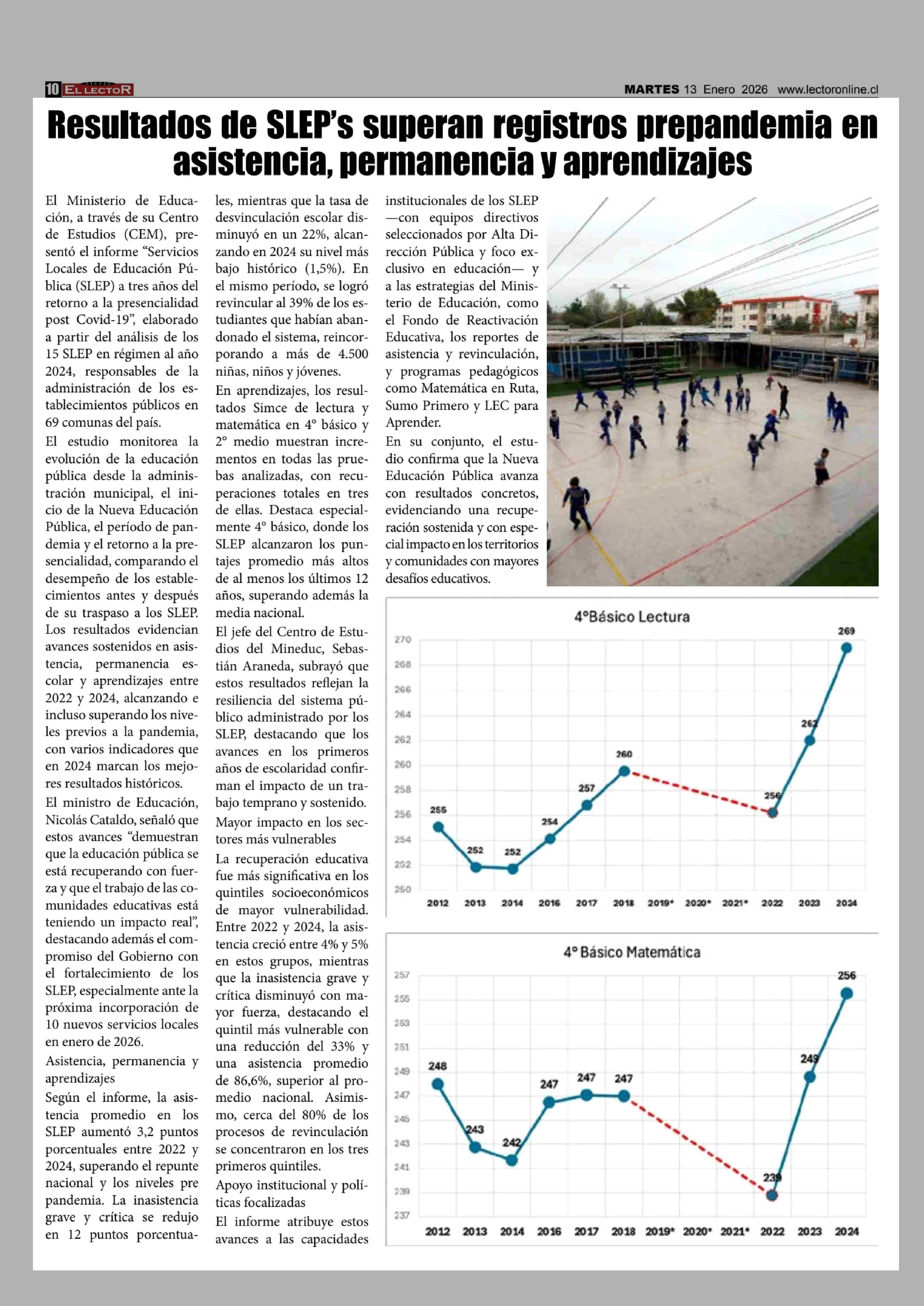 Resultados de SLEP's superan registros prepandemia en asistencia, permanencia y aprendizajes 13-01-2026 El Lector |
