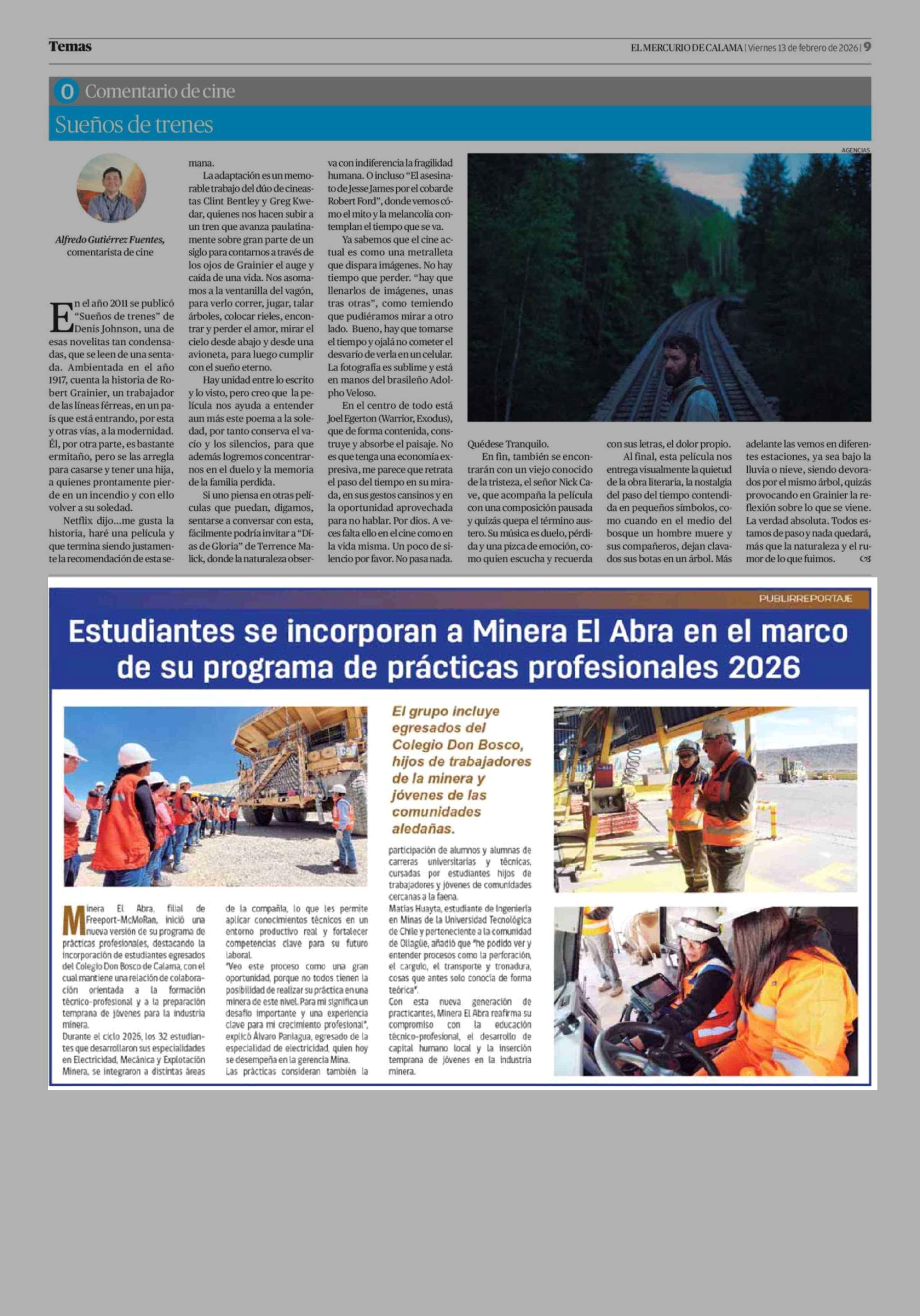 Estudiantes se incorporan a Minera El Abra en el marco de su programa de prácticas profesionales 2026 13-02-2026 El Mercurio de Calama |