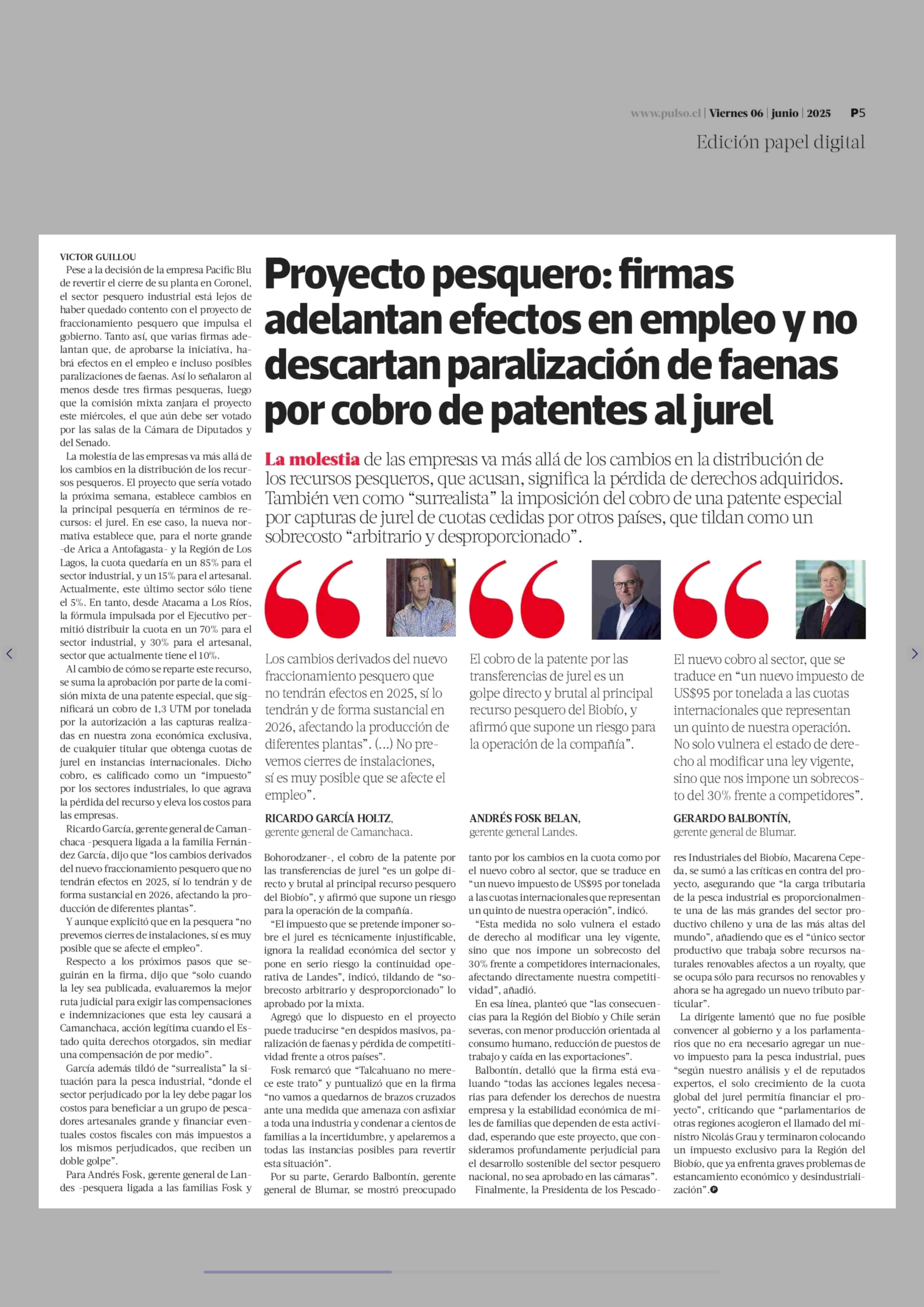Proyecto pesquero: firmas adelantan efectos en empleo y no descartan paralización de faenas por cobro de patentes al jurel 06-06-2025 La Tercera |