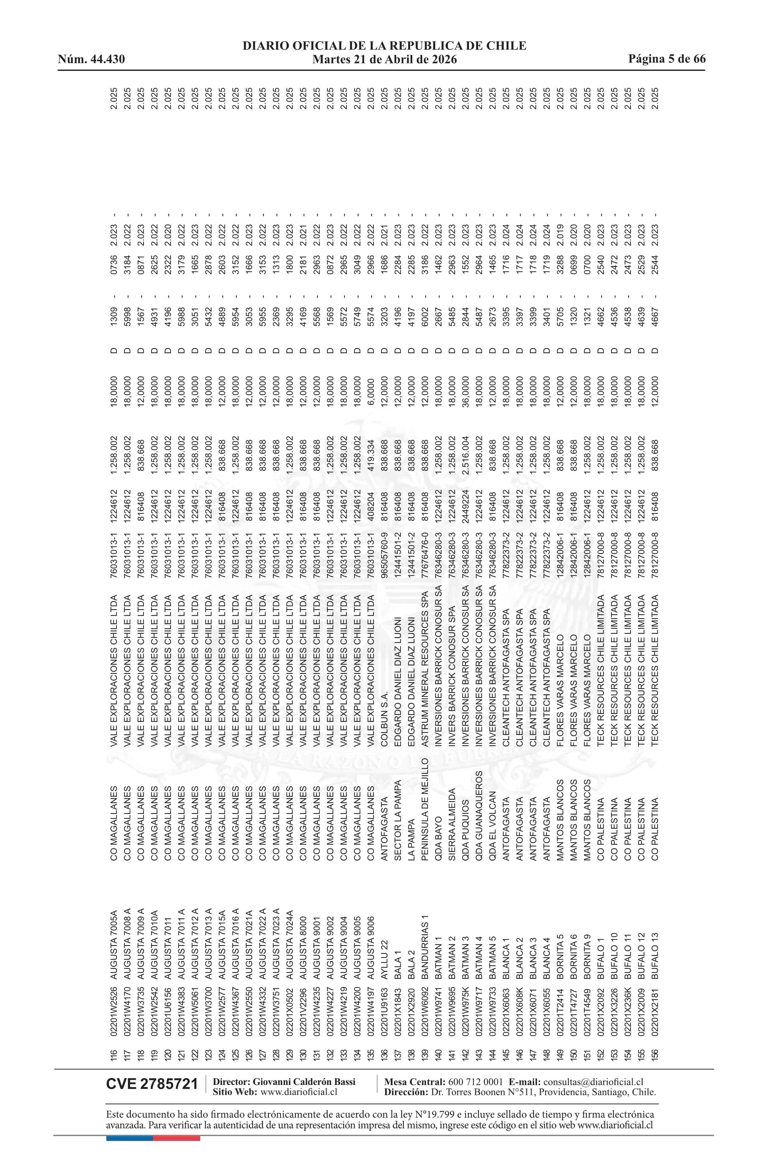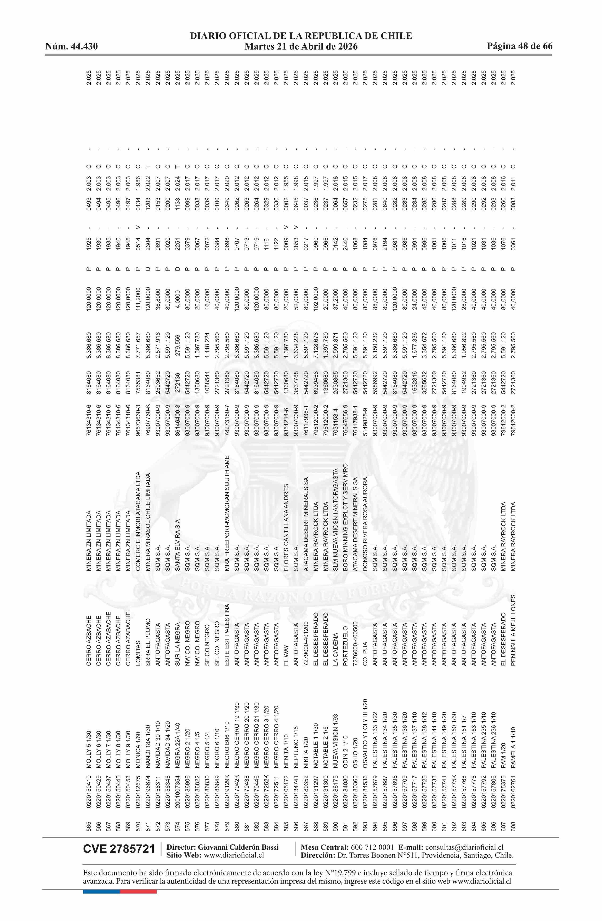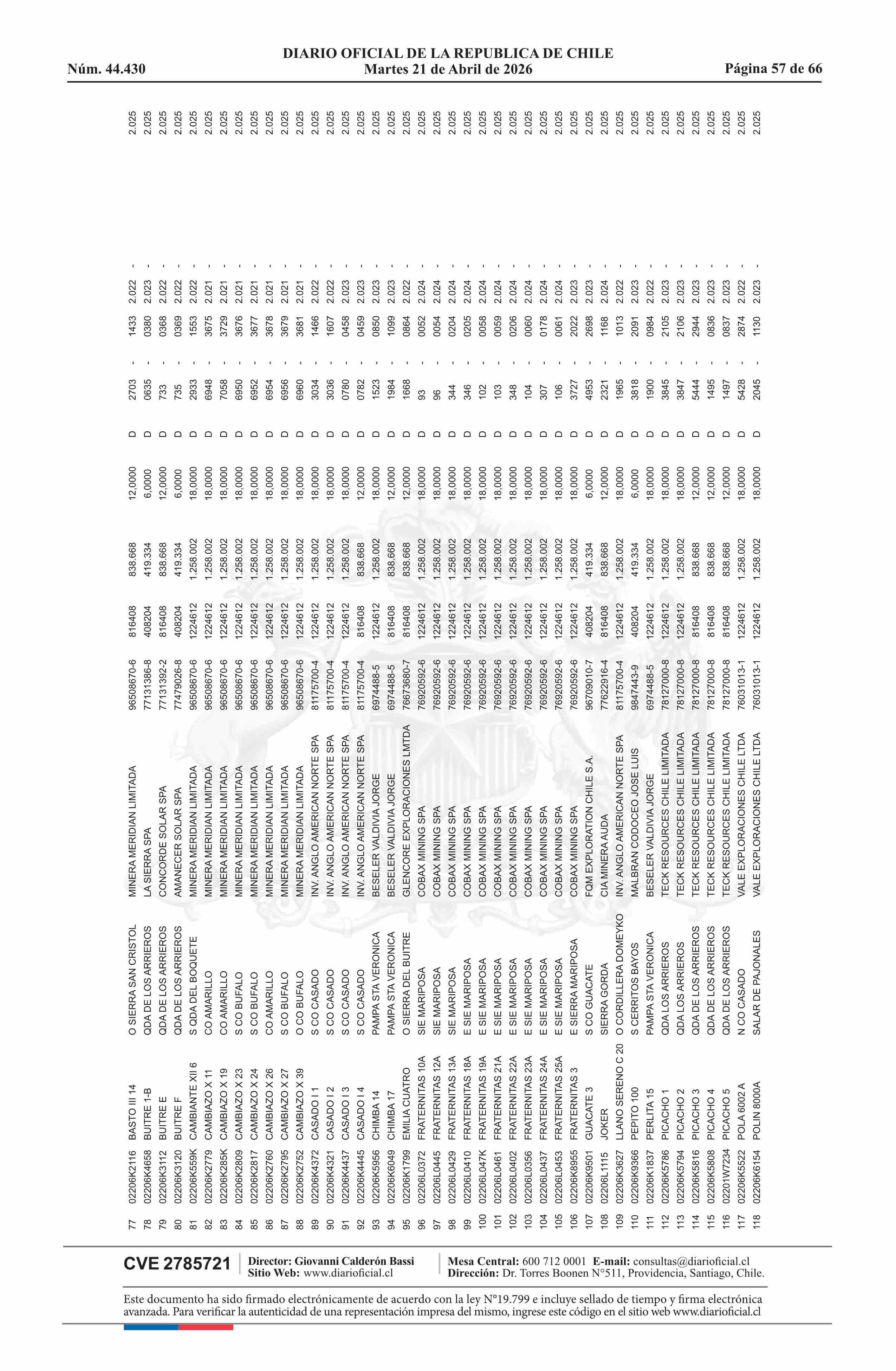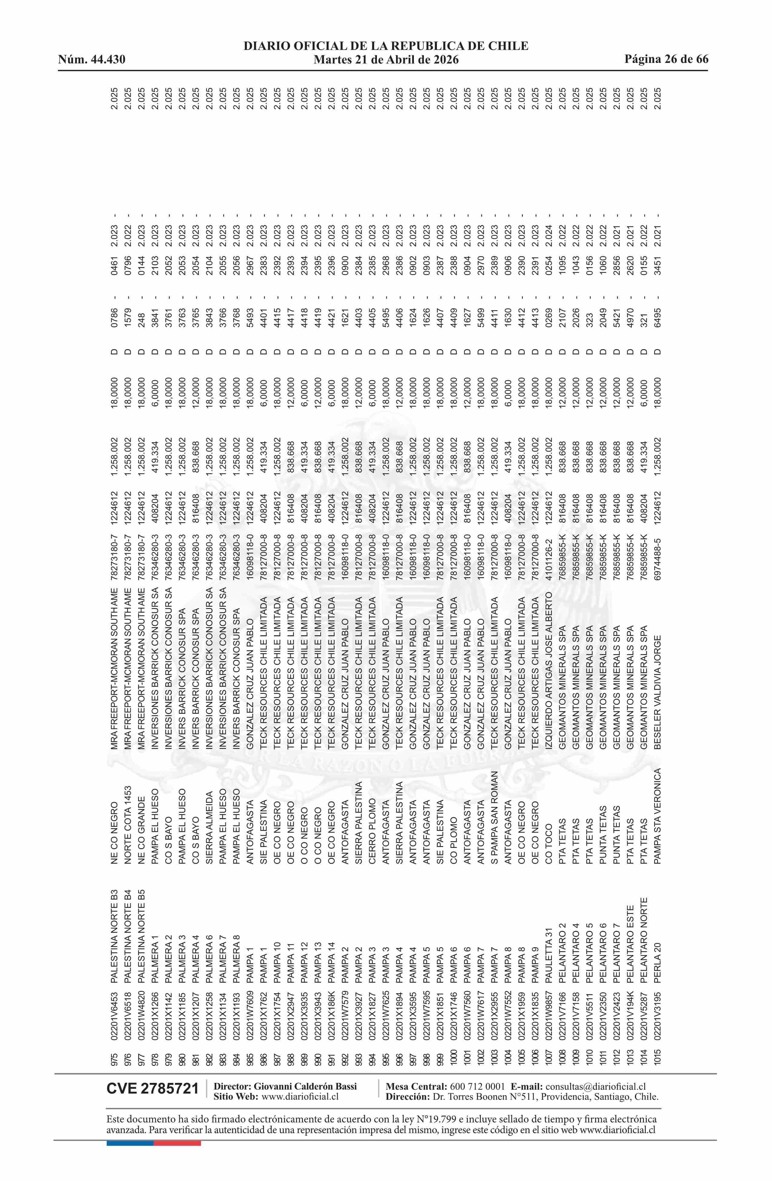 Fuente: DIARIO OFICIAL CHILE - BOLETÍN OFICIAL DE MINERÍA (DIARIO OFICIAL CHILE – BOM – NÓMINA REMATE) Página(s): 1-66