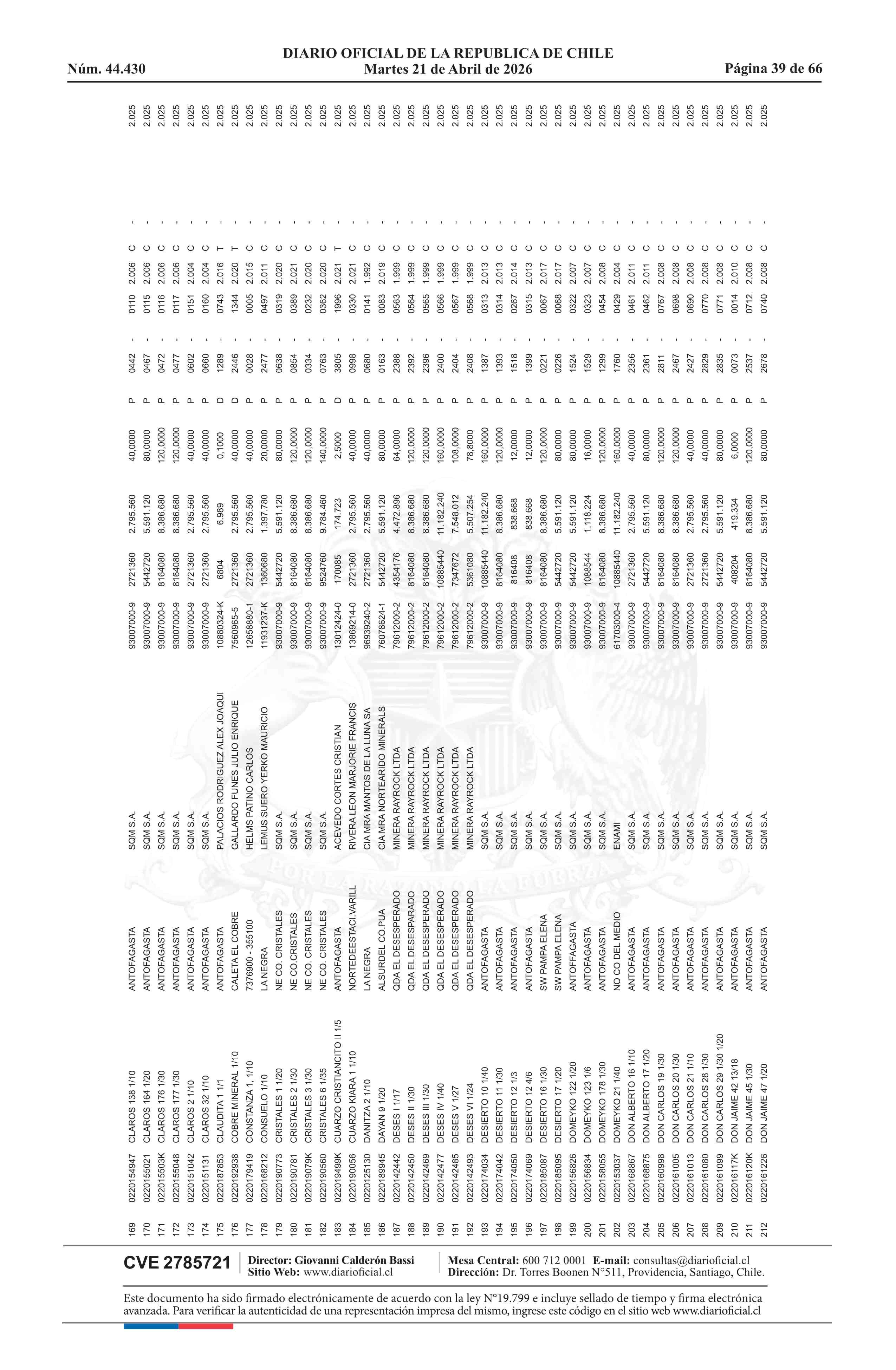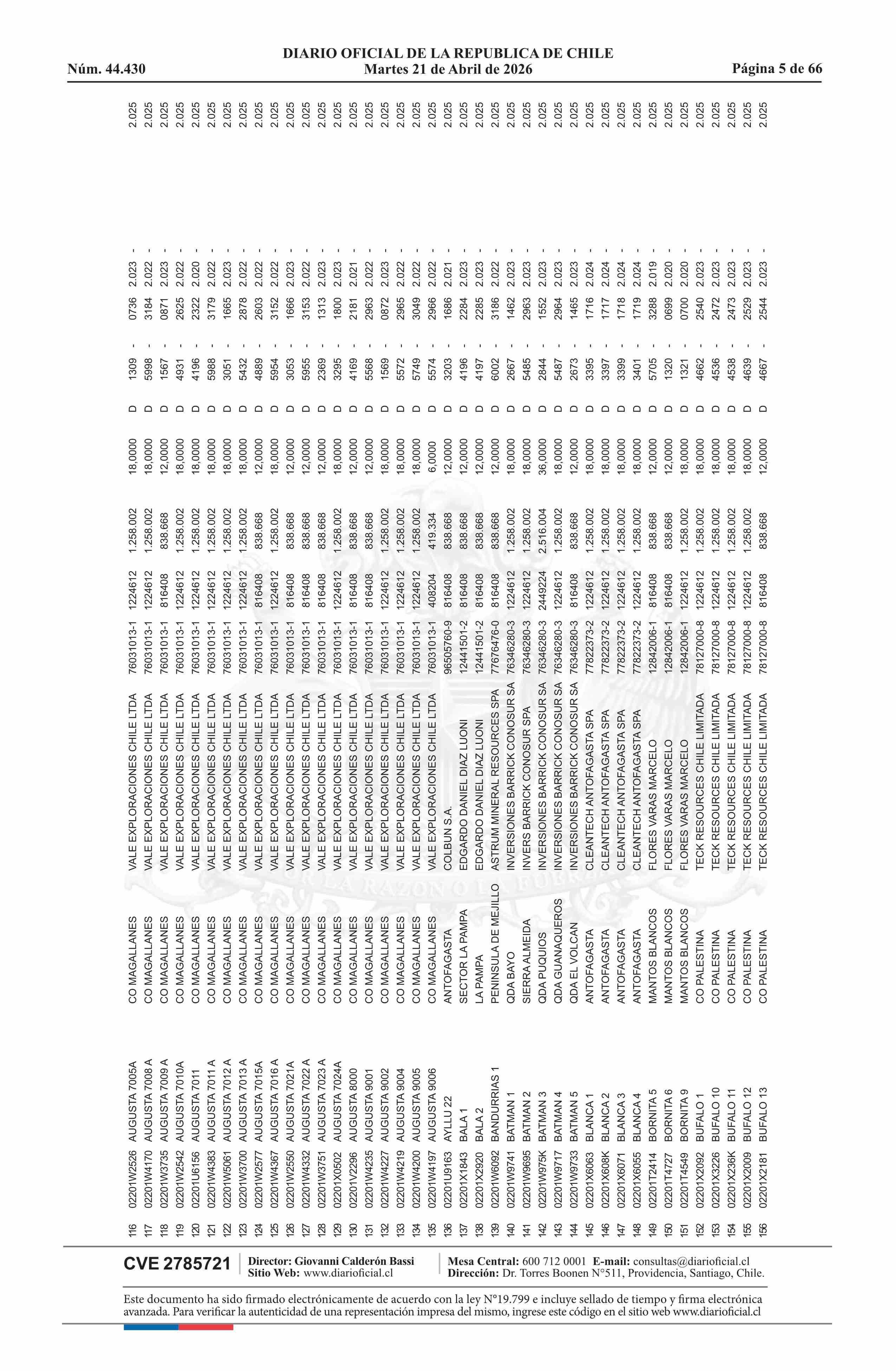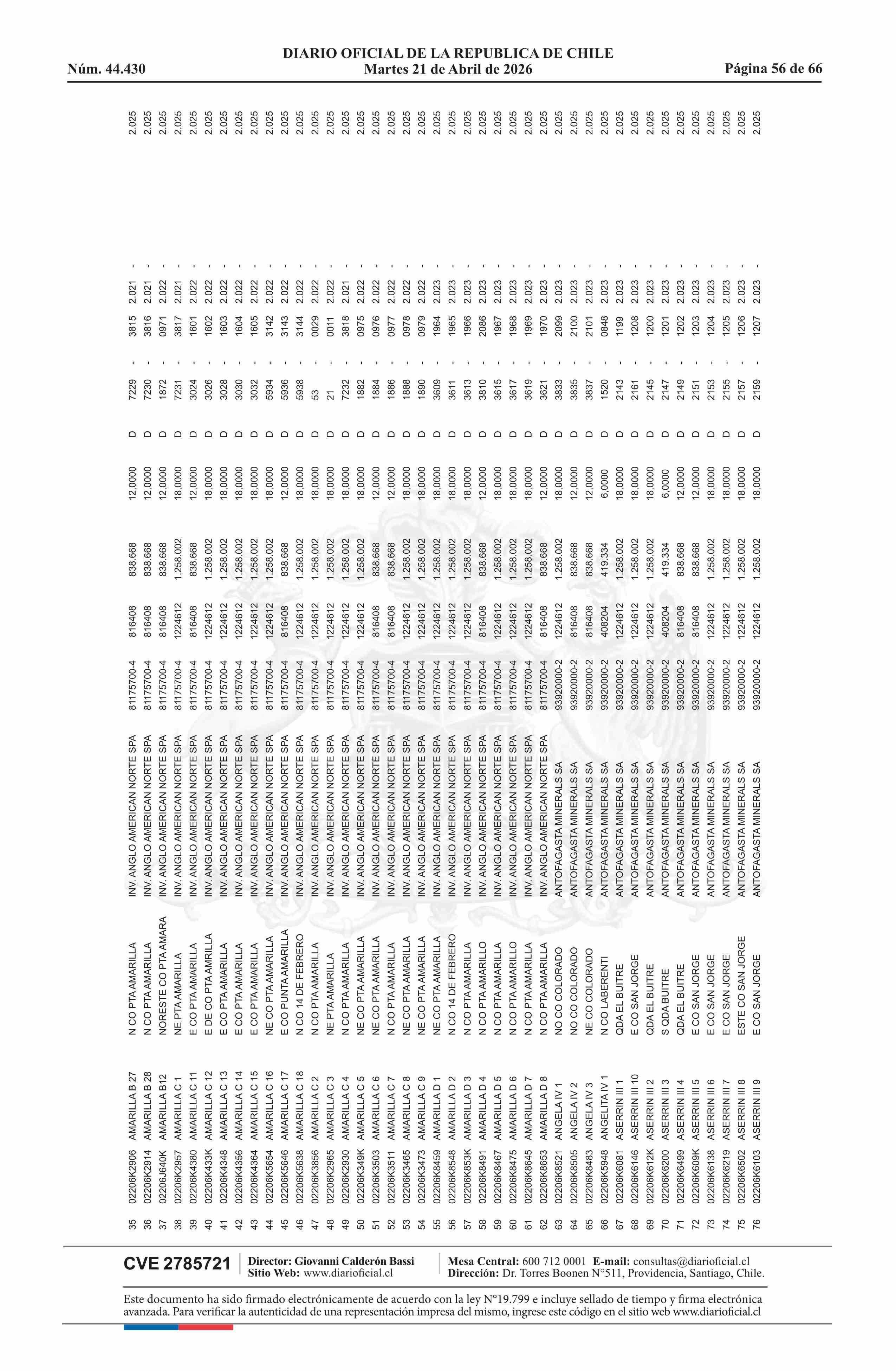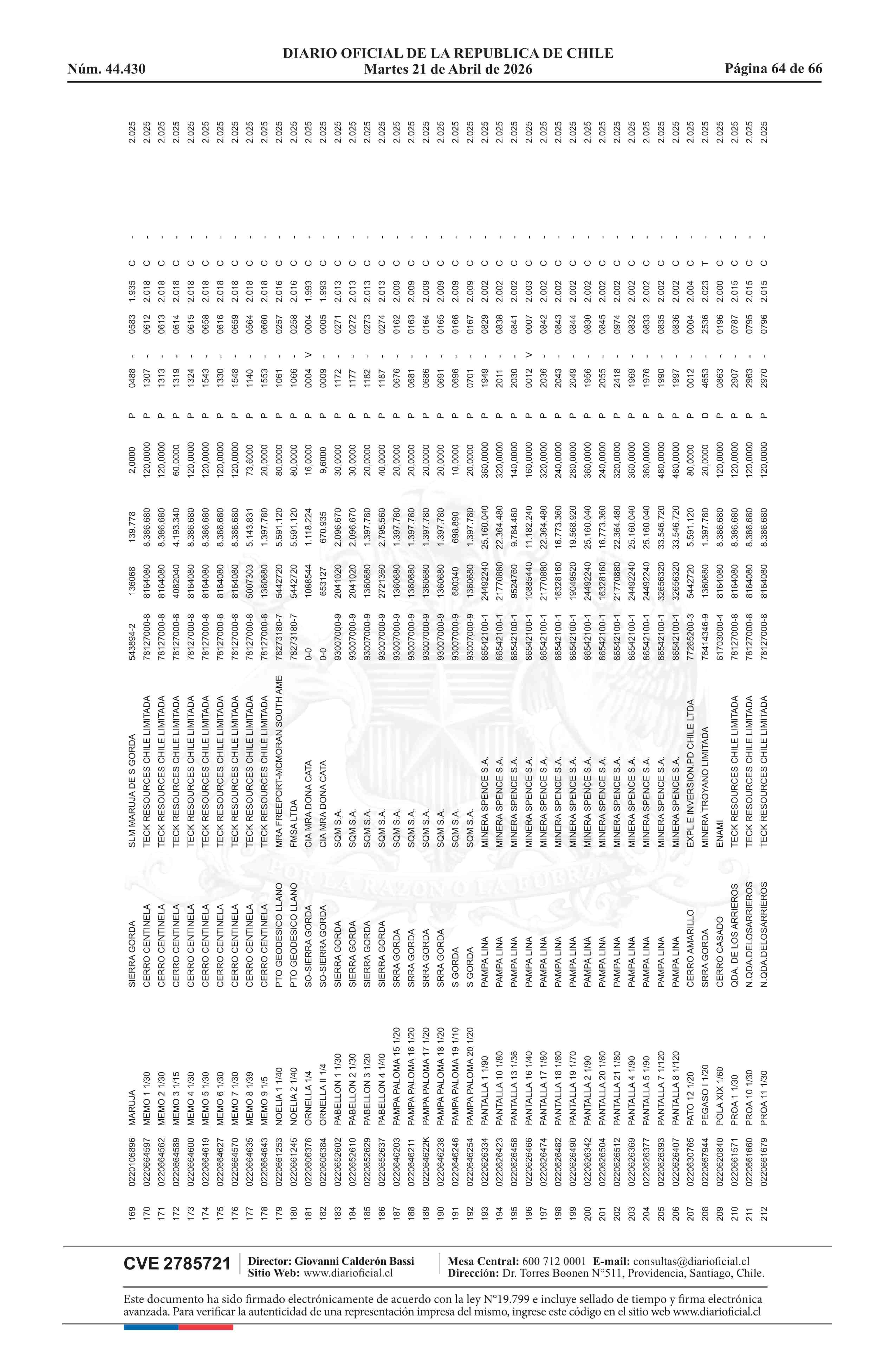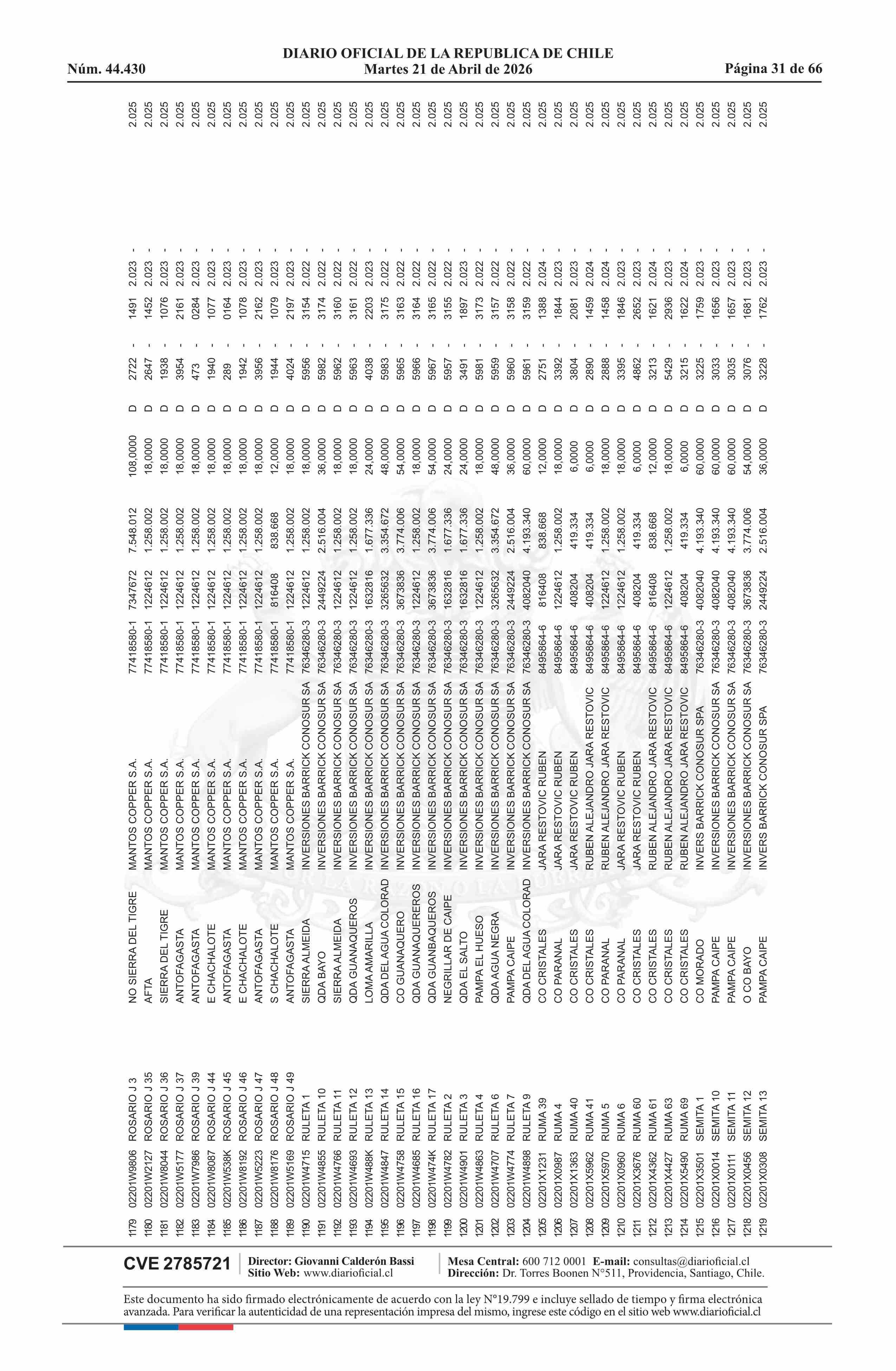 Fuente: DIARIO OFICIAL CHILE - BOLETÍN OFICIAL DE MINERÍA (DIARIO OFICIAL CHILE – BOM – NÓMINA REMATE) Página(s): 1-66
