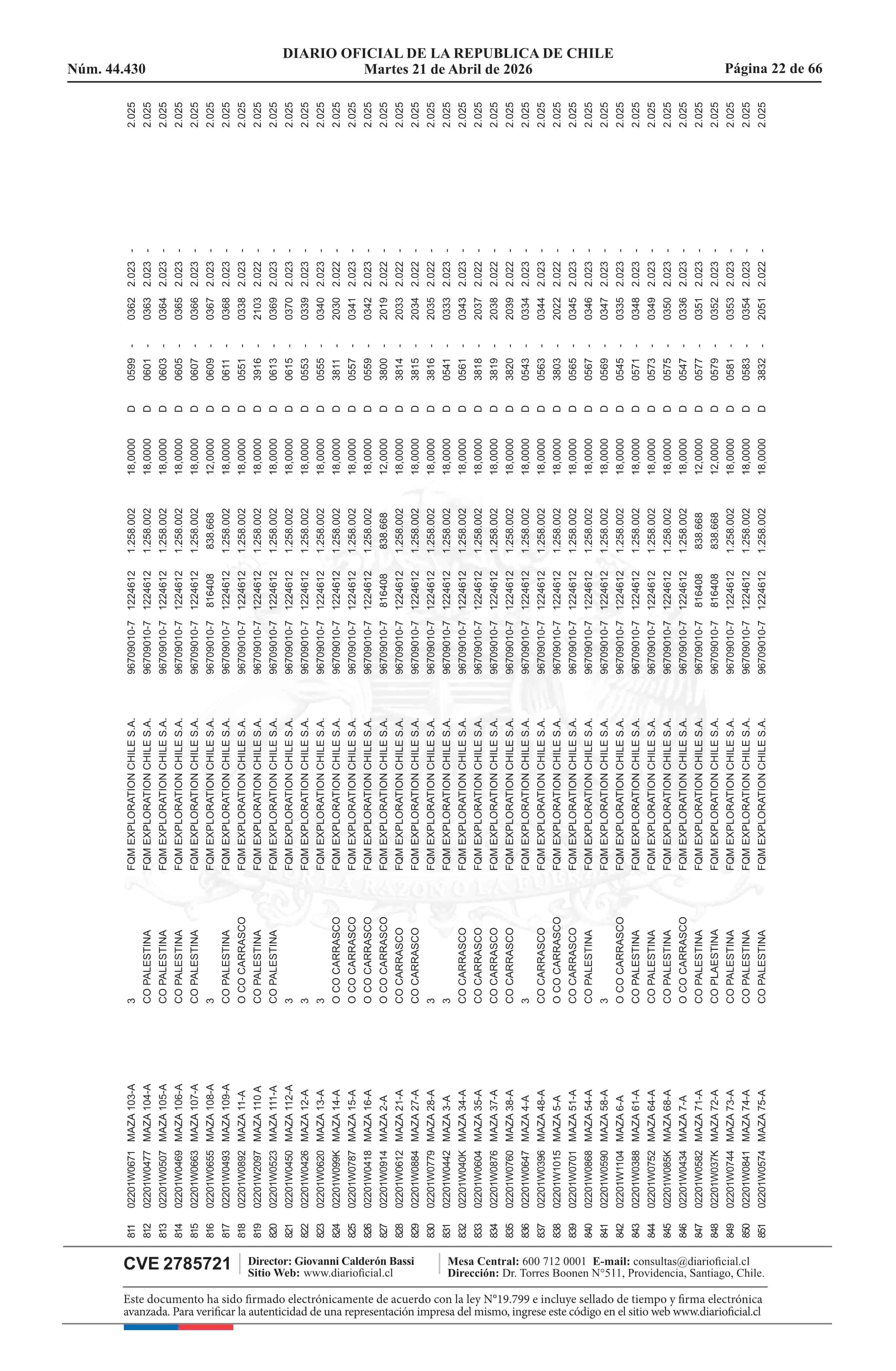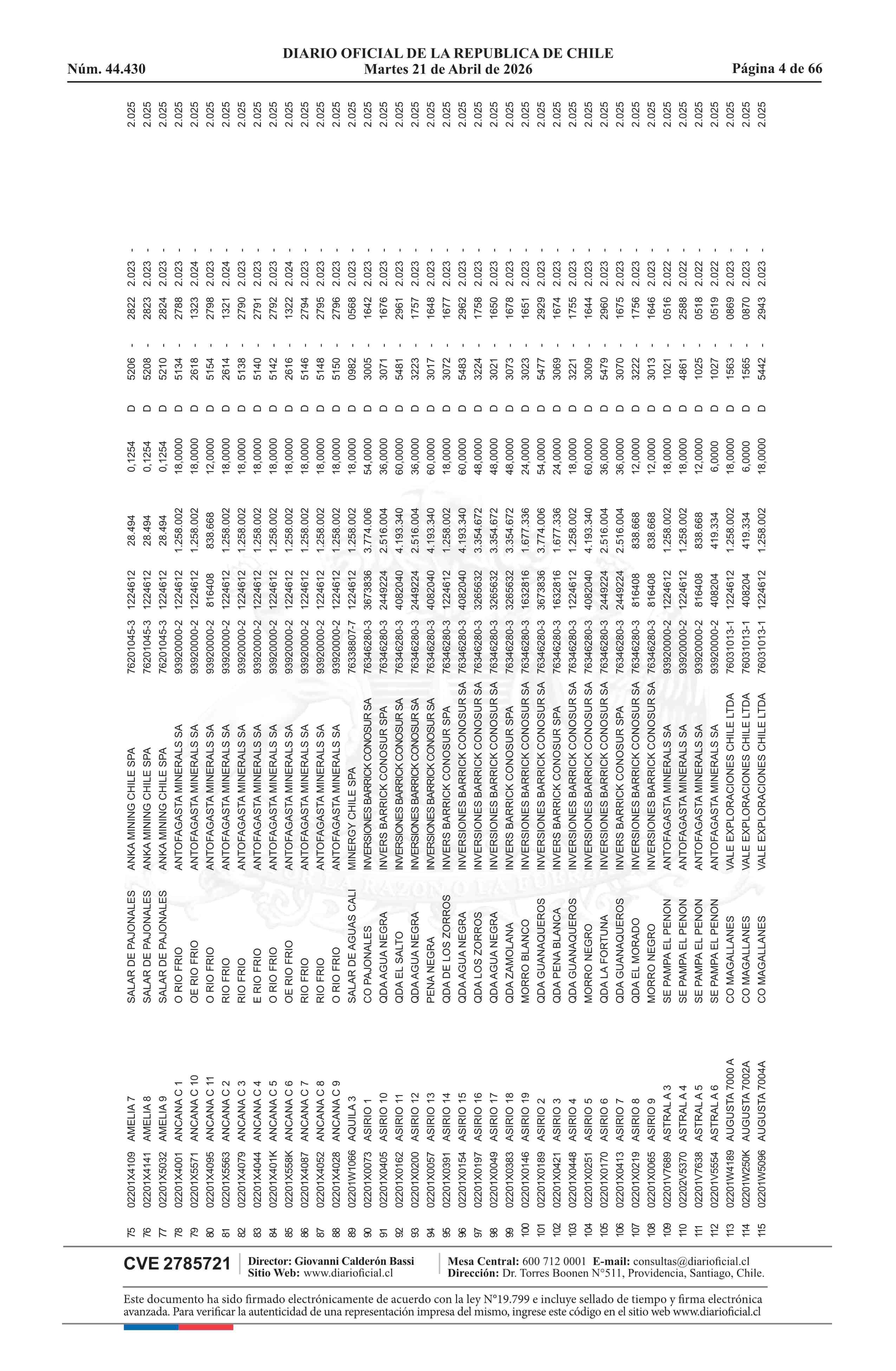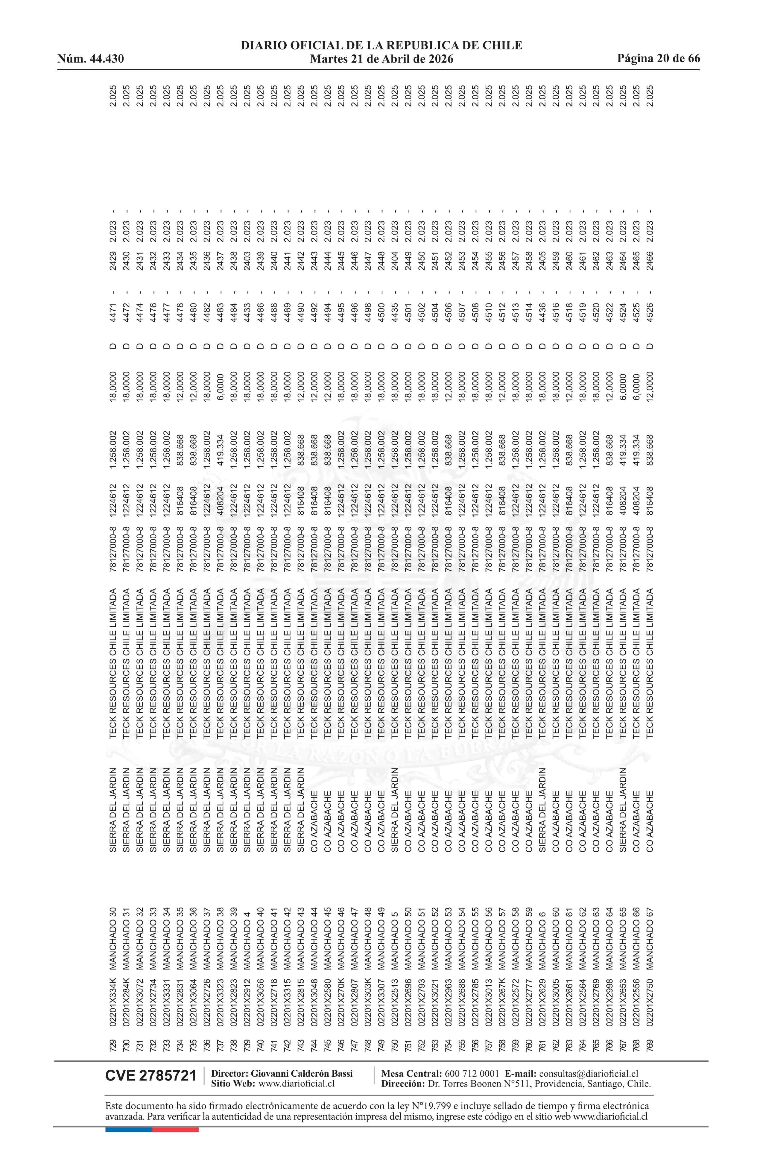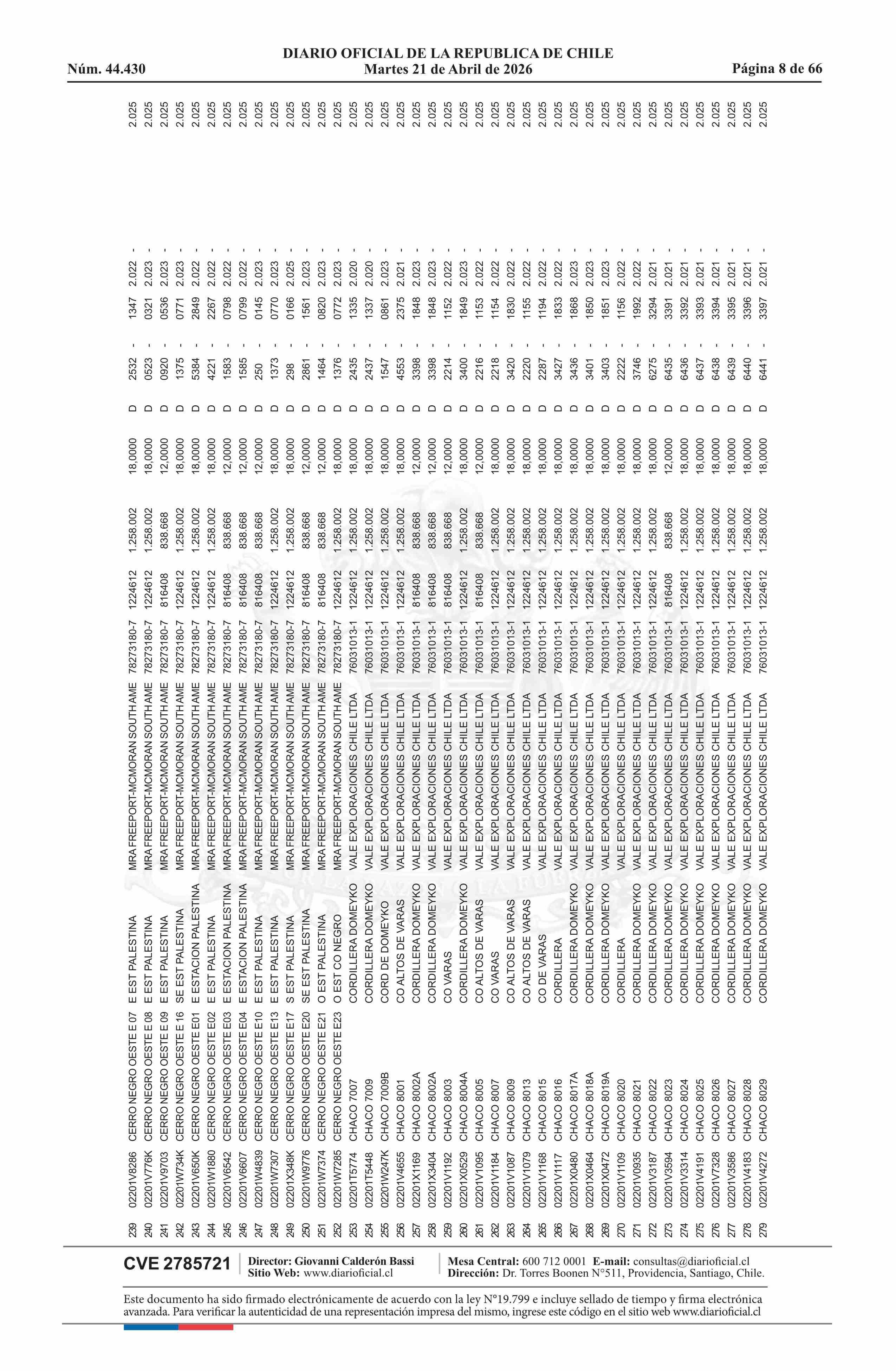 Fuente: DIARIO OFICIAL CHILE - BOLETÍN OFICIAL DE MINERÍA (DIARIO OFICIAL CHILE – BOM – NÓMINA REMATE) Página(s): 1-66