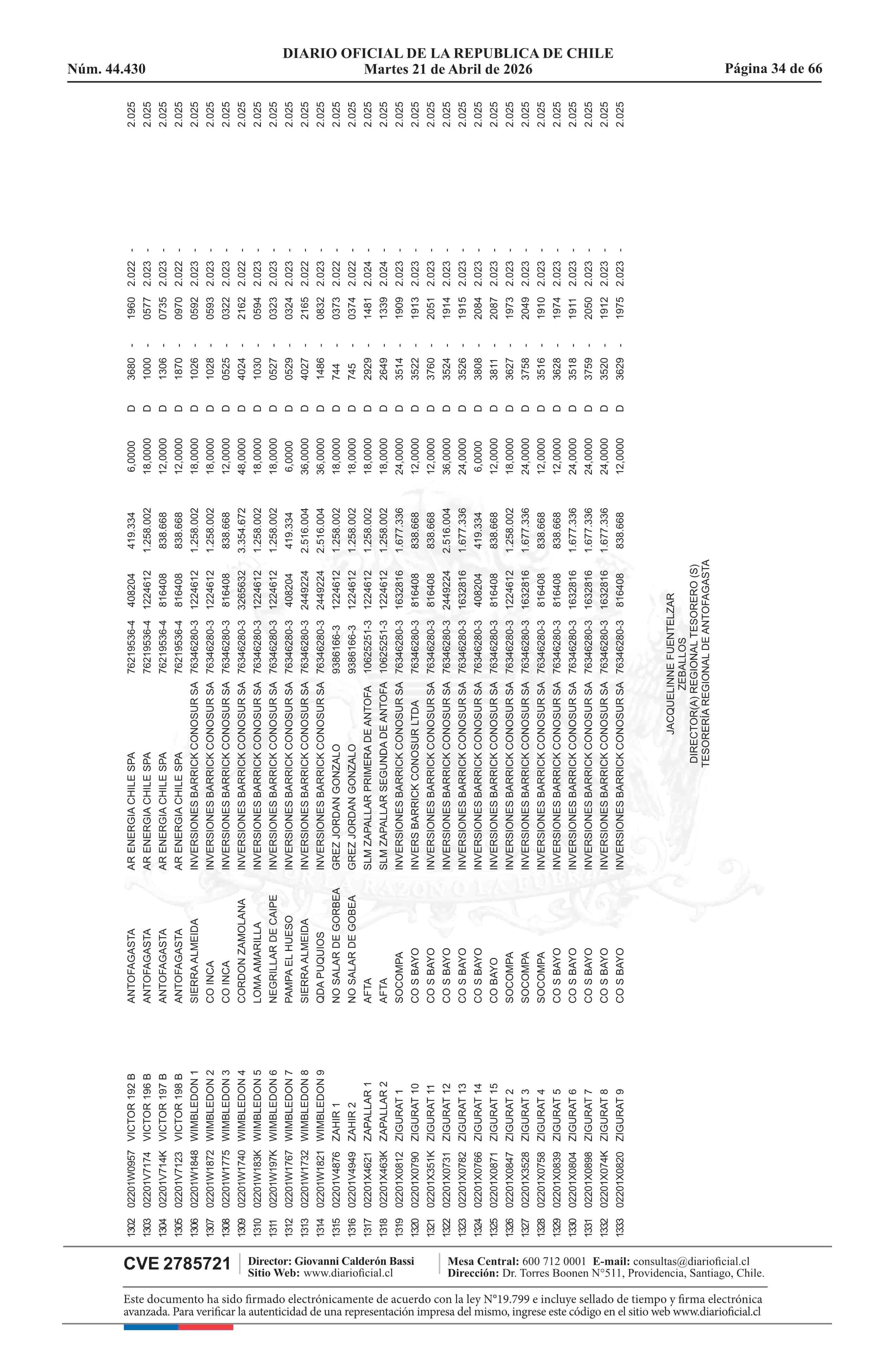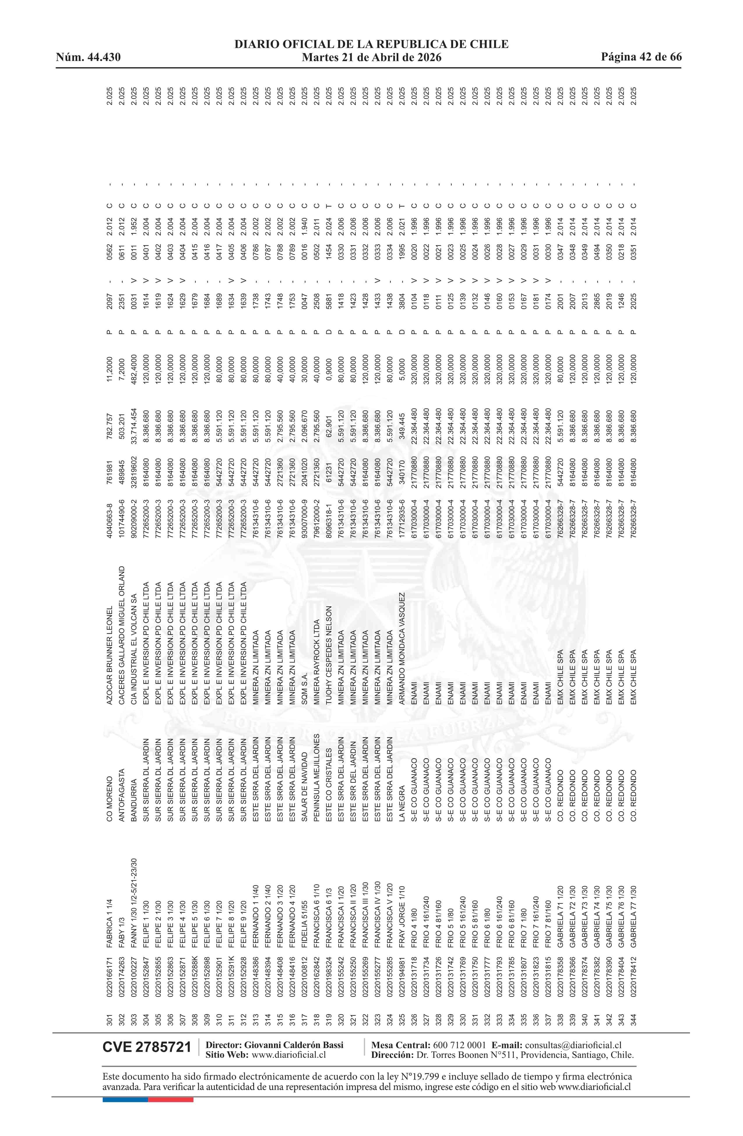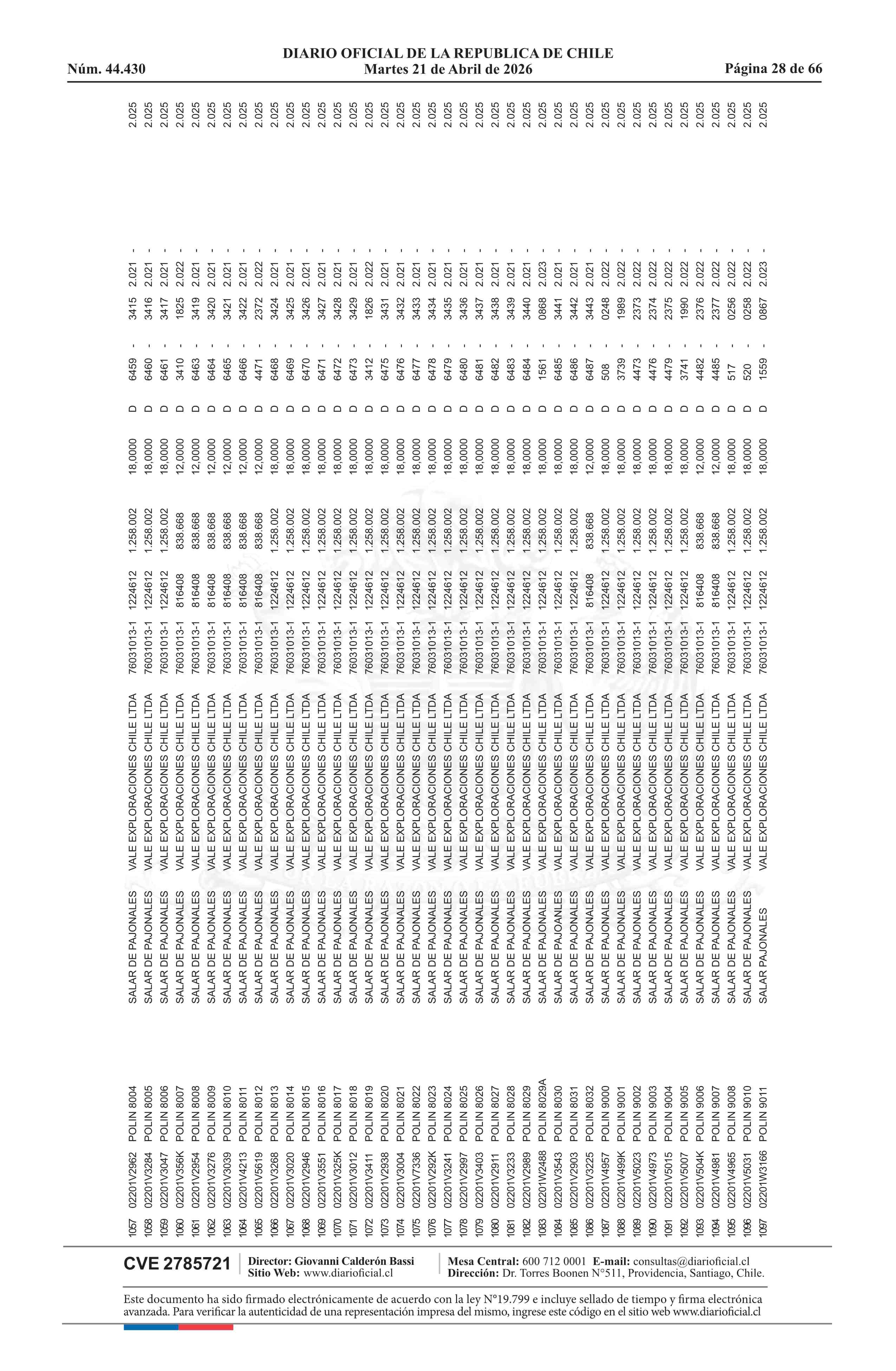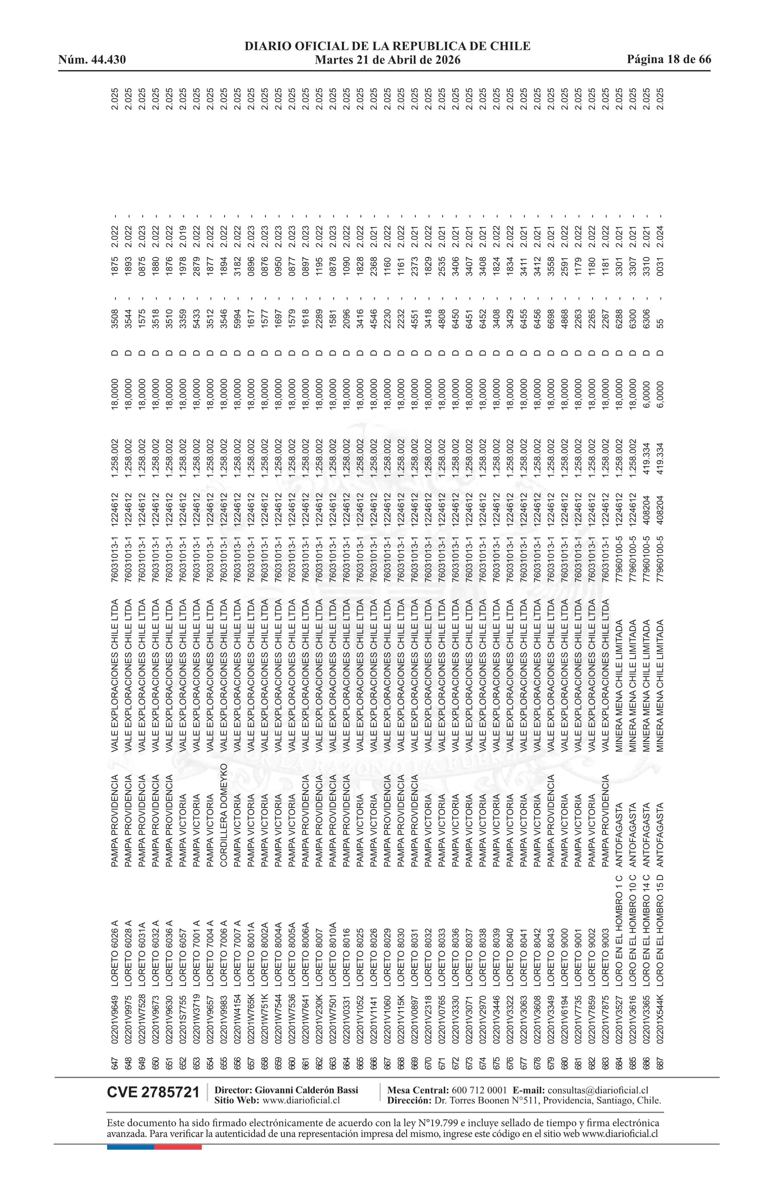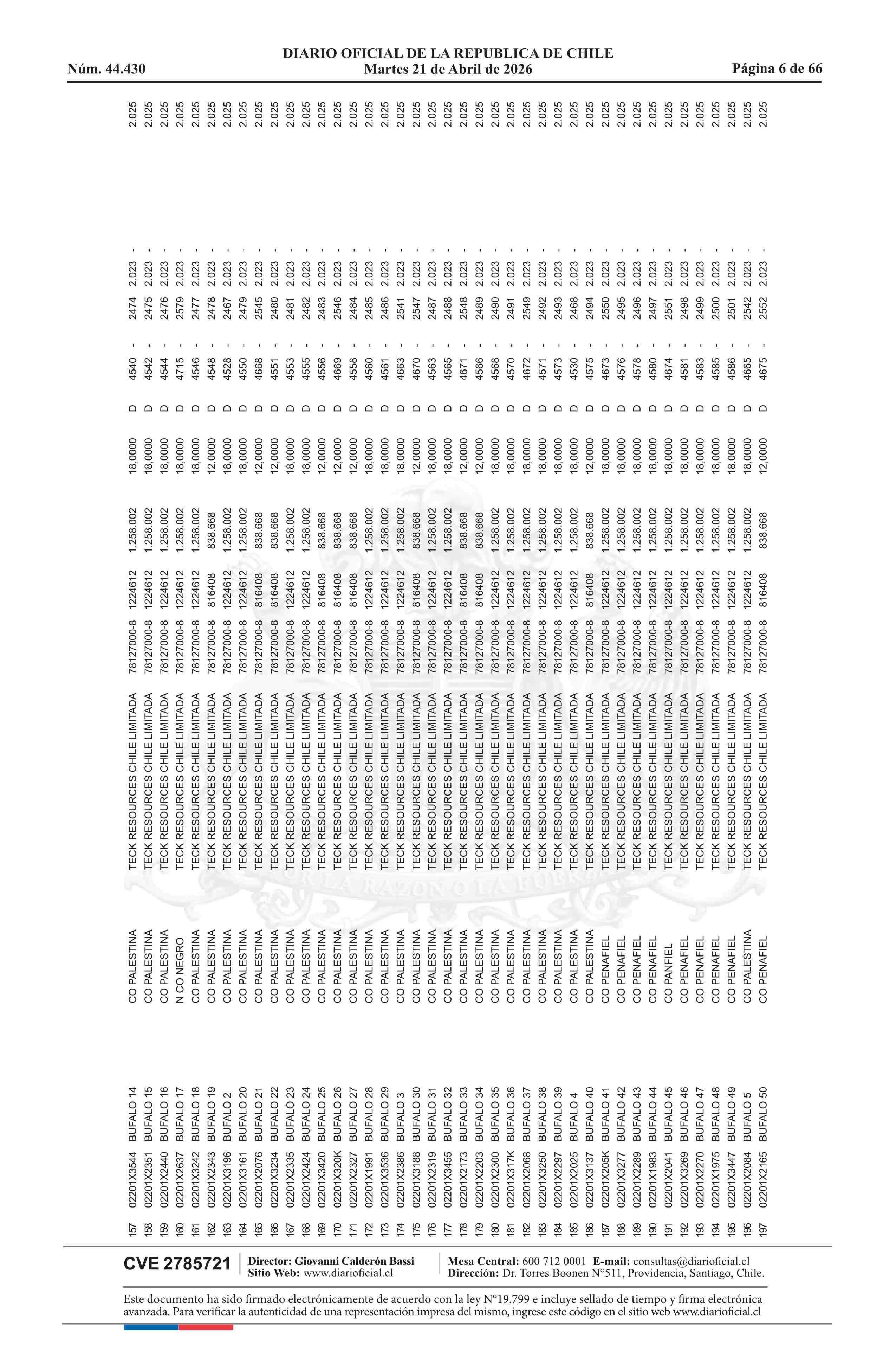 Fuente: DIARIO OFICIAL CHILE - BOLETÍN OFICIAL DE MINERÍA (DIARIO OFICIAL CHILE – BOM – NÓMINA REMATE) Página(s): 1-66