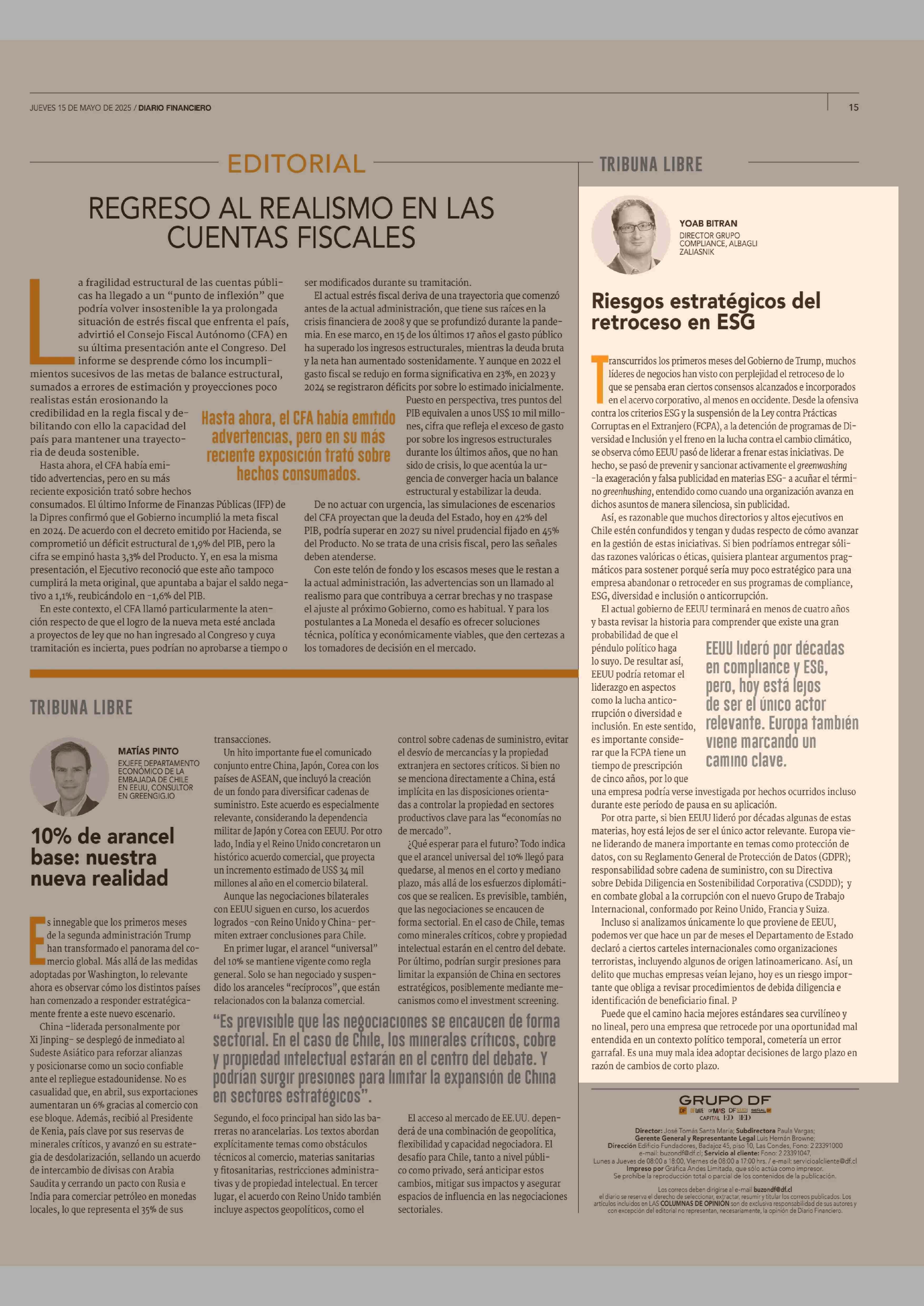 COLUMNAS DE OPINIÓN: Riesgos estratégicos del retroceso en ESG 15-05-2025 Diario Financiero |